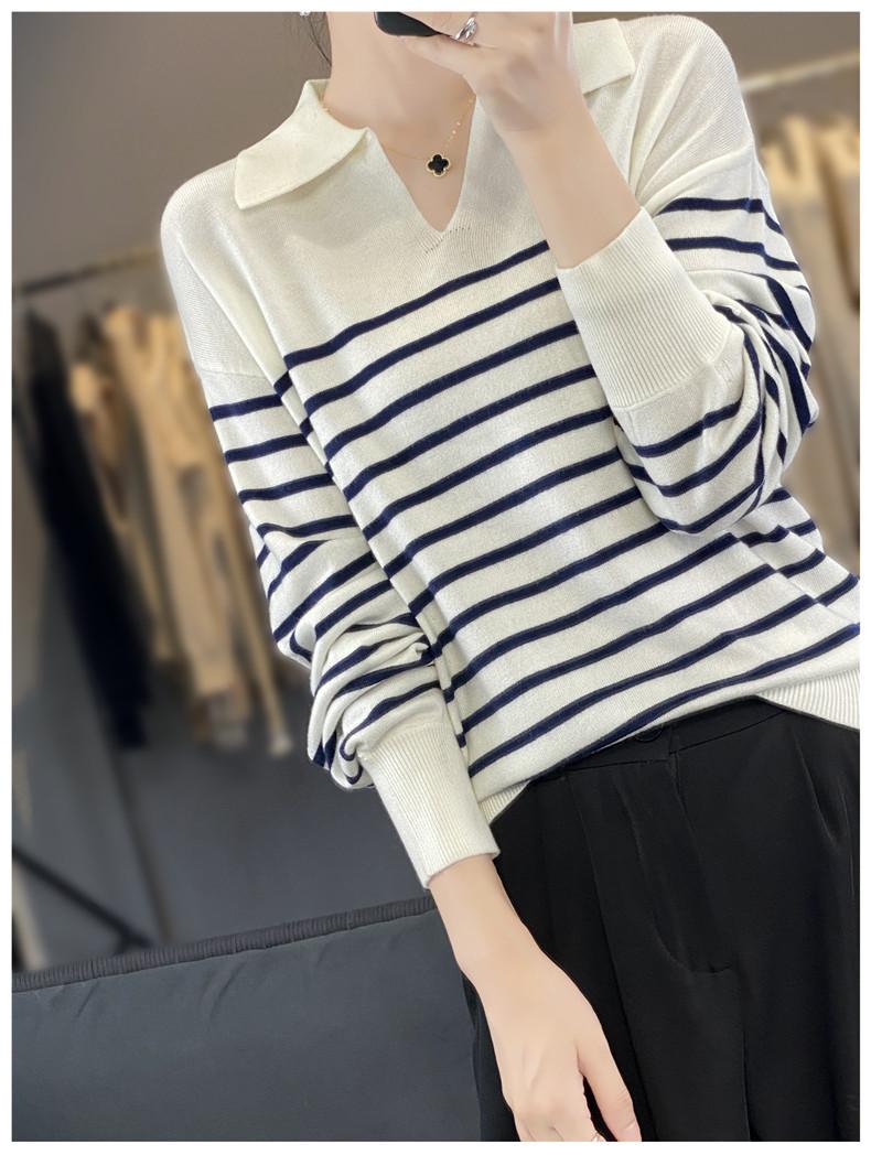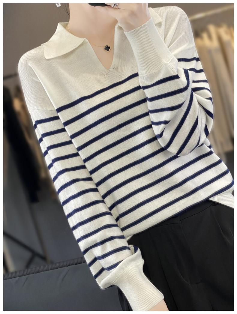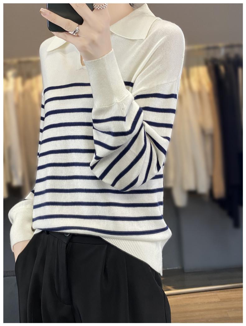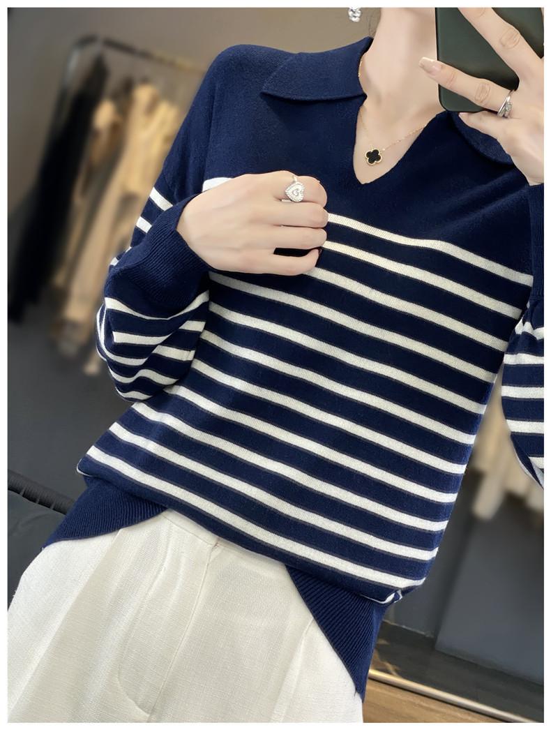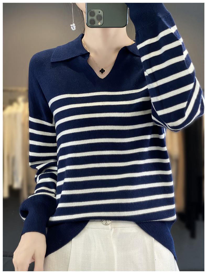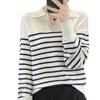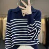 Jersey básico de punto de lana merino extrafina de manga larga con cuello medio abierto a rayas en bloques de color de otoño e invierno para mujer