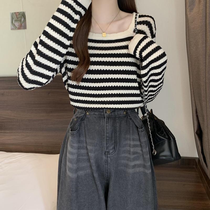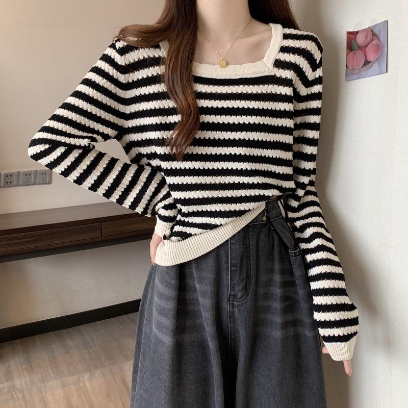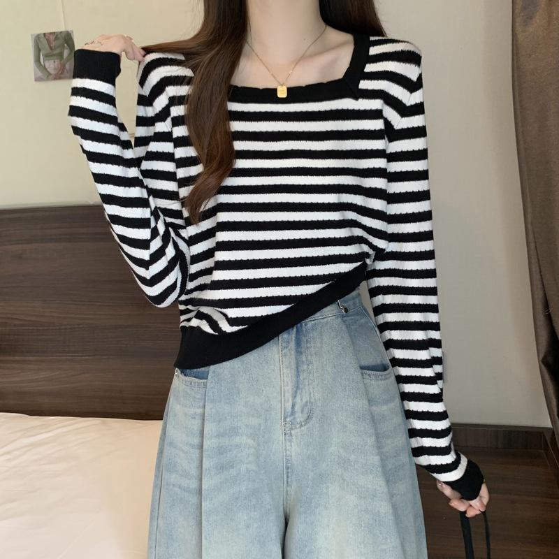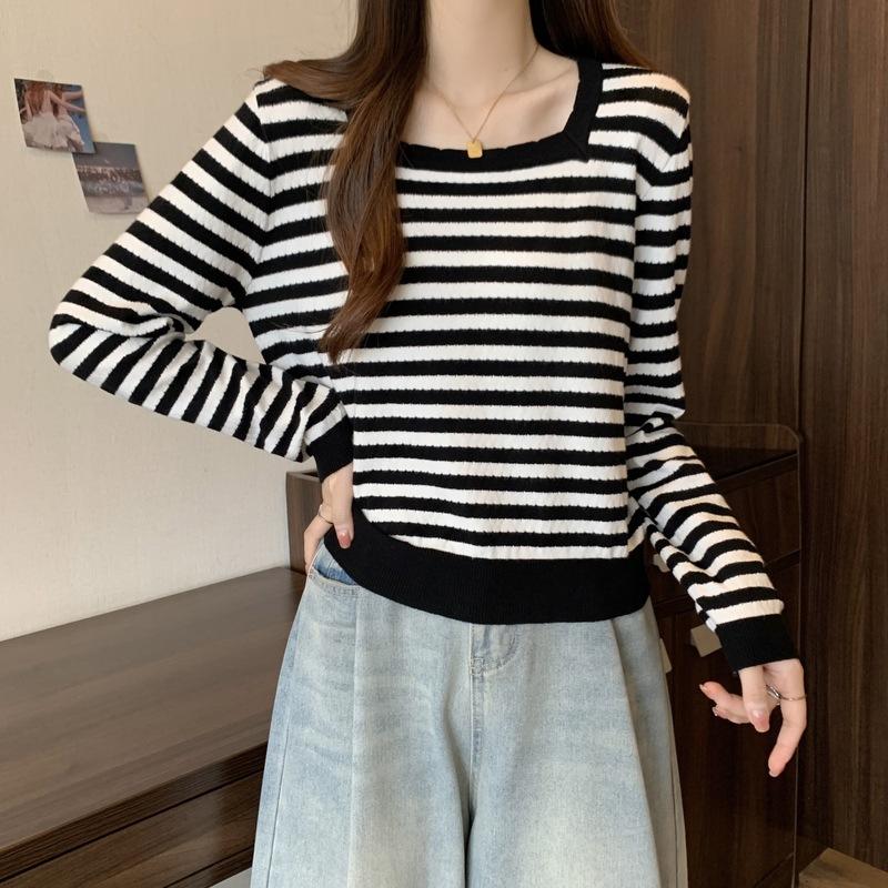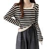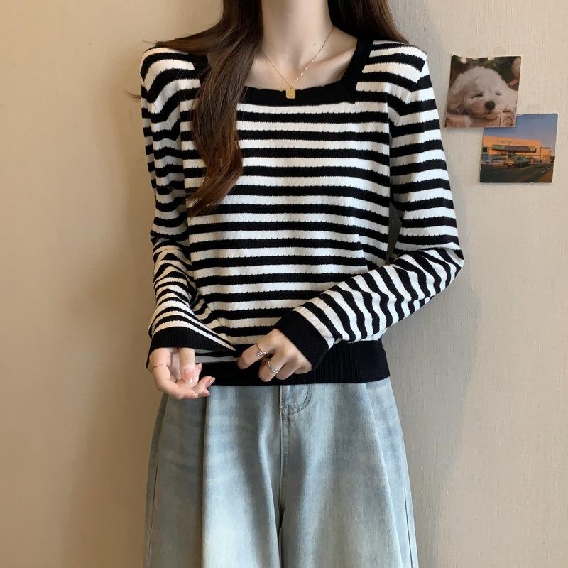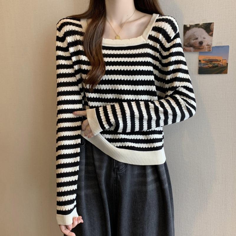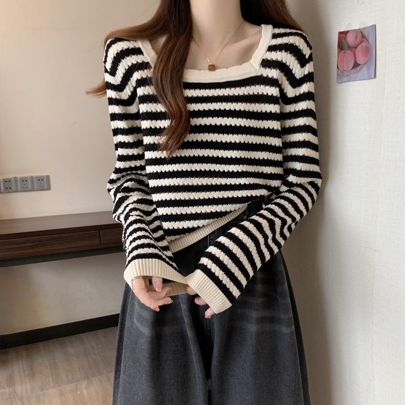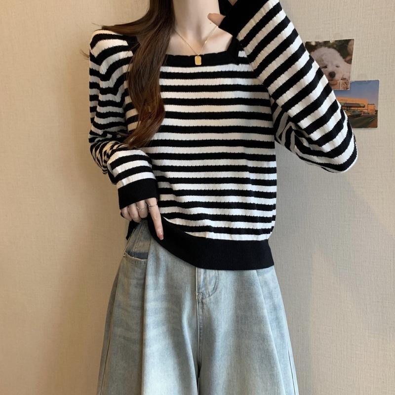 Ropa Nueva de Otoño Temprano 2025 para Mujer Estilo Coreano Rayado Suéter Tejido para Dama Hombro Recto Manga Larga Suelto Adelgazante A6801