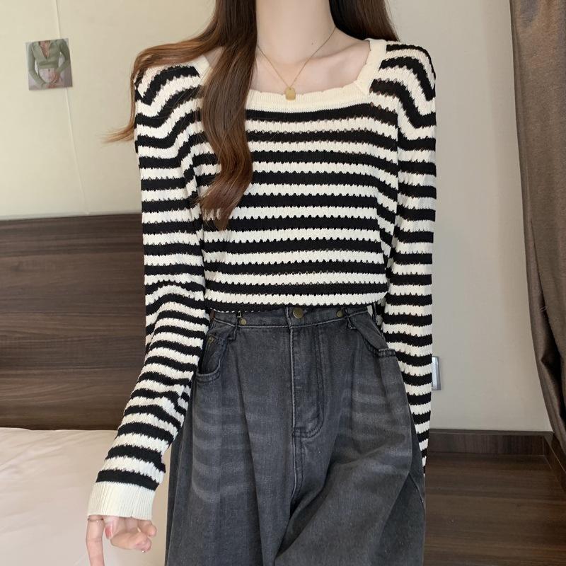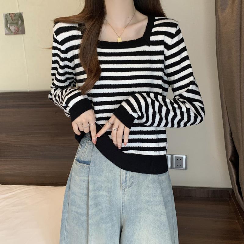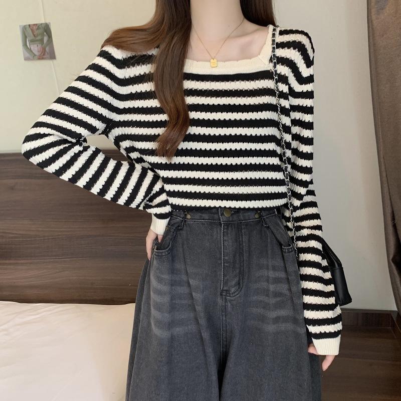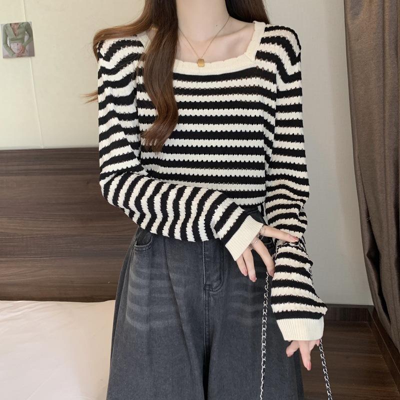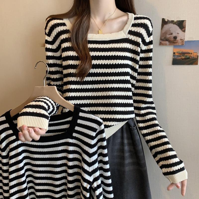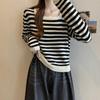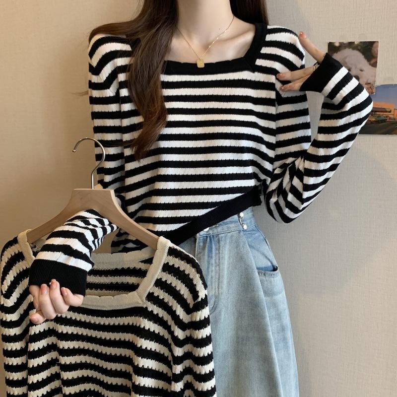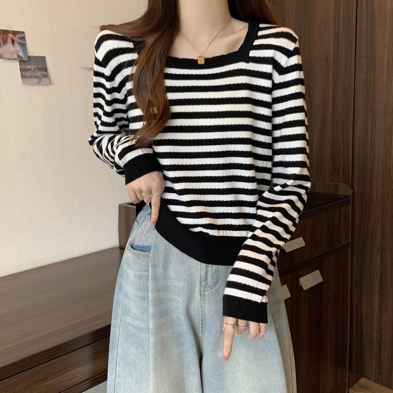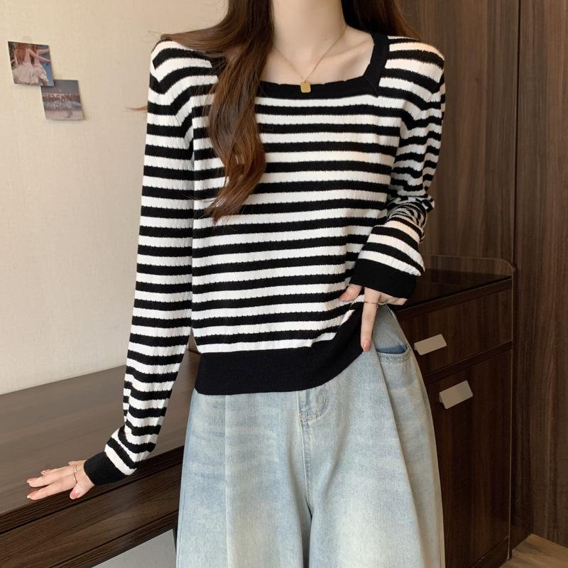 Ropa Nueva de Otoño Temprano 2025 para Mujer Estilo Coreano Rayado Suéter Tejido para Dama Hombro Recto Manga Larga Suelto Adelgazante A6801