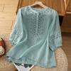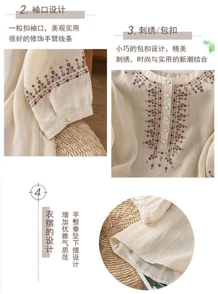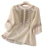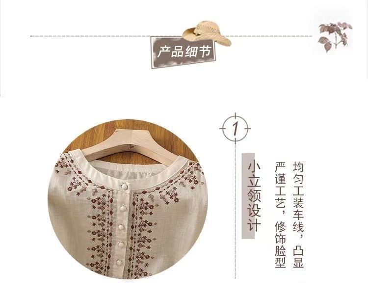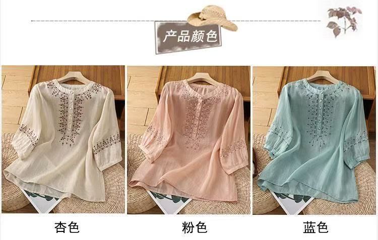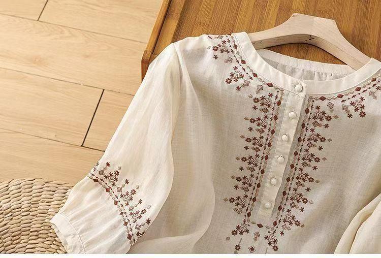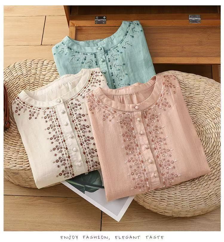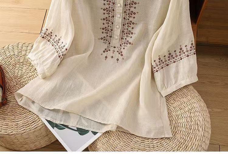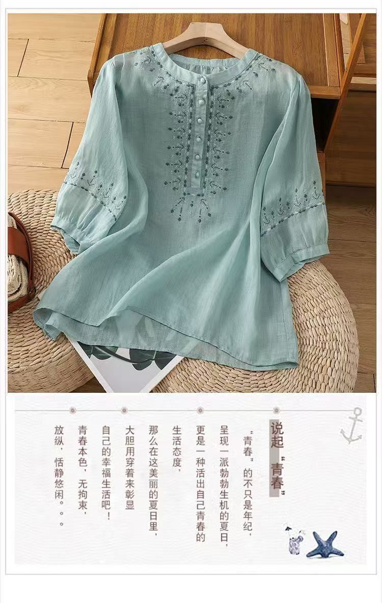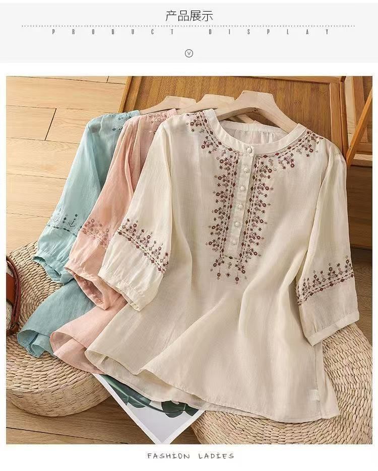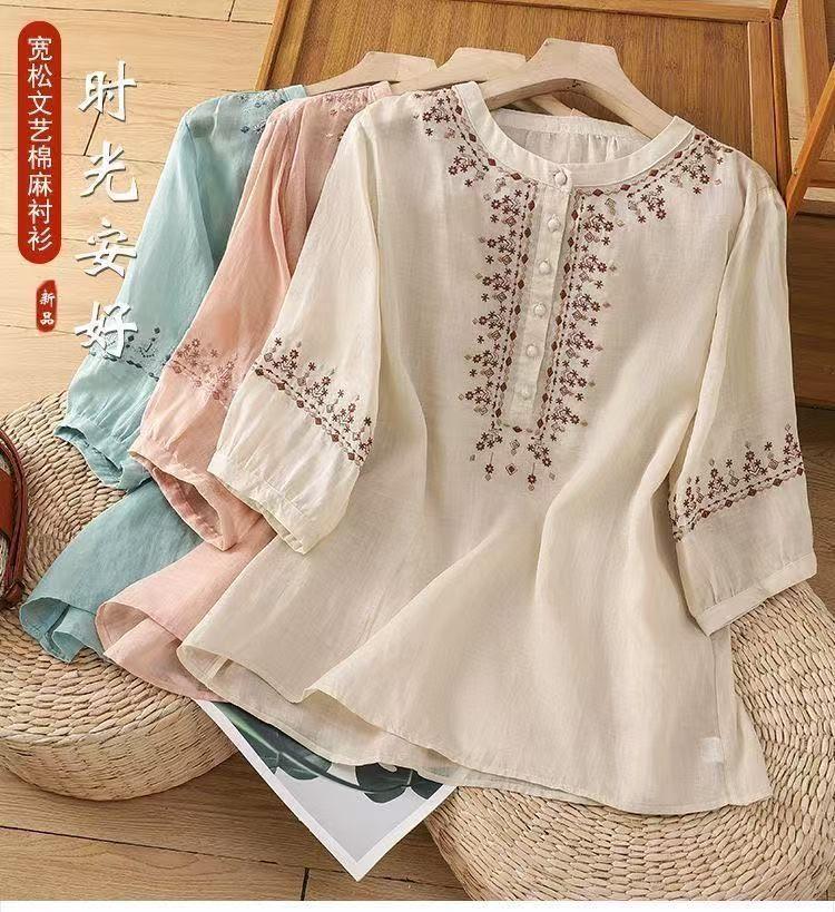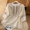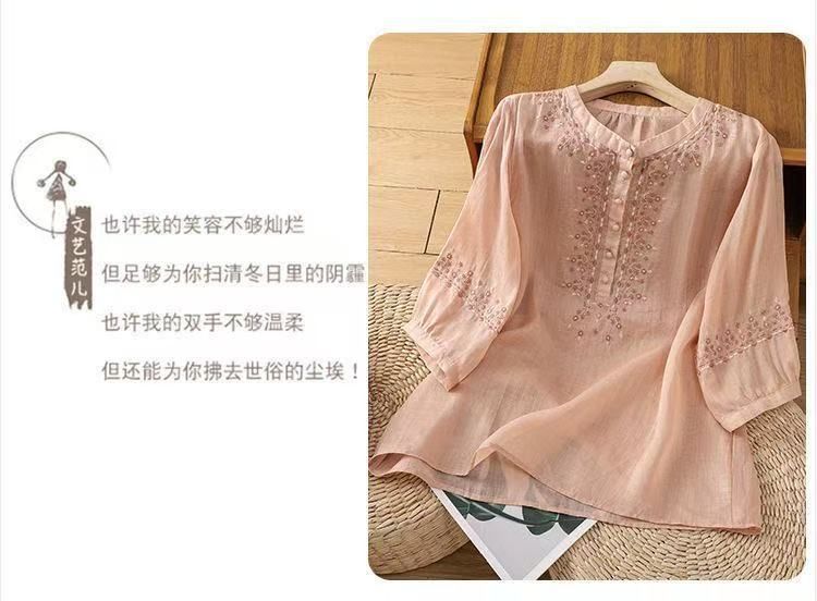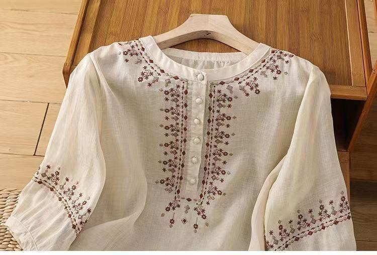Camisa de diseño retro para mujer, manga cinco puntos, primavera y verano, nueva, versátil, camisa pequeña, holgada, cubre vientre, bordada