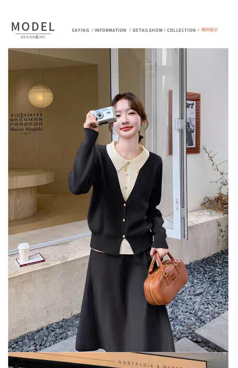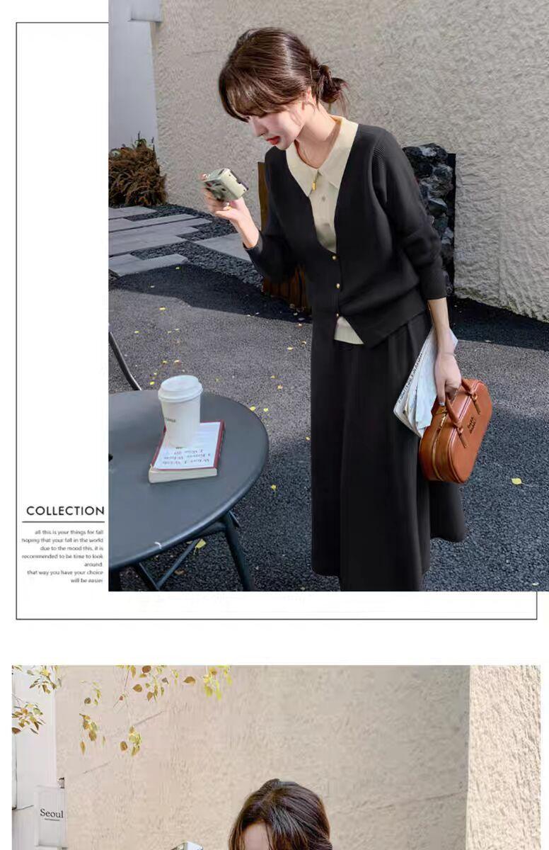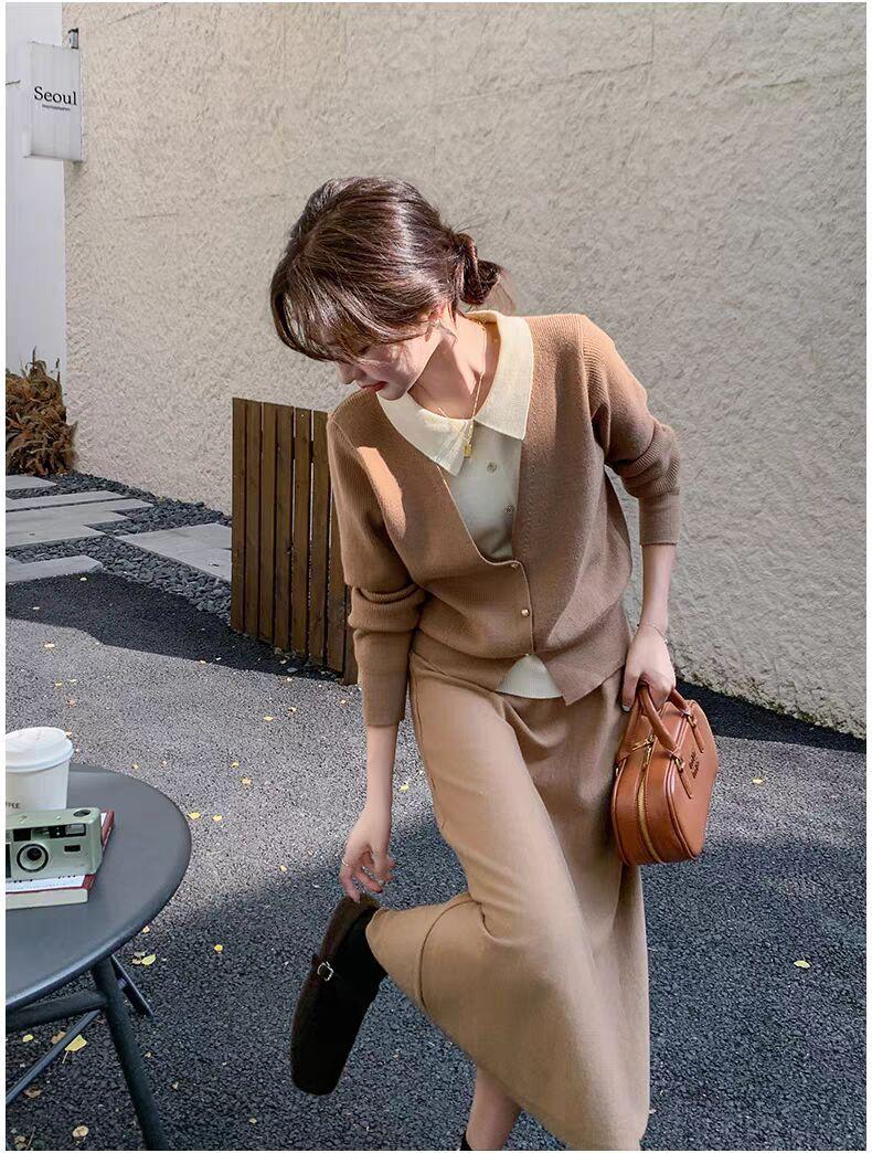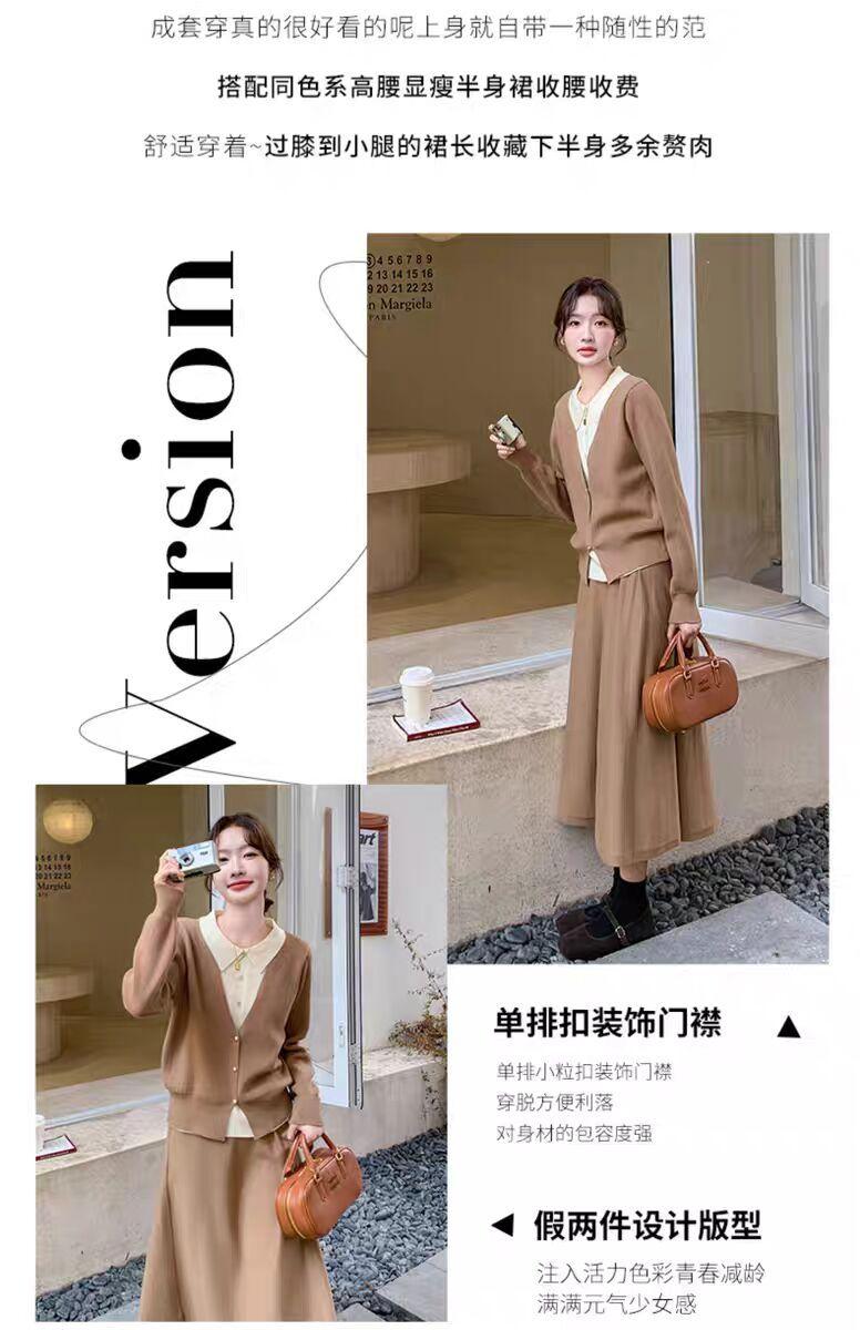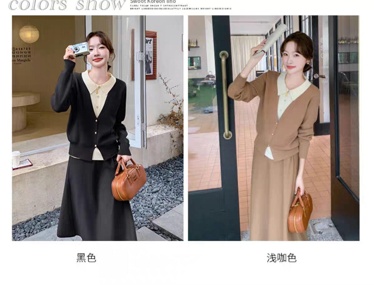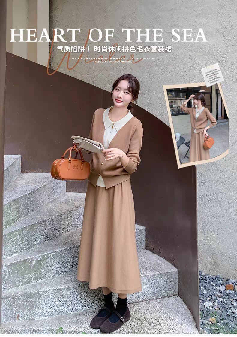 Conjunto de temperamento estilo coreano falda para mujer otoño nuevo costuras suéter de dos piezas falsas falda midi conjunto de dos piezas