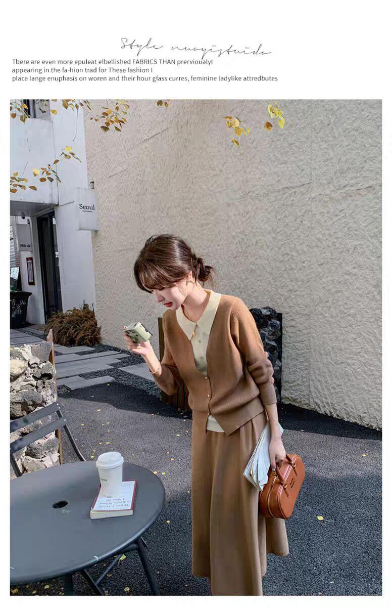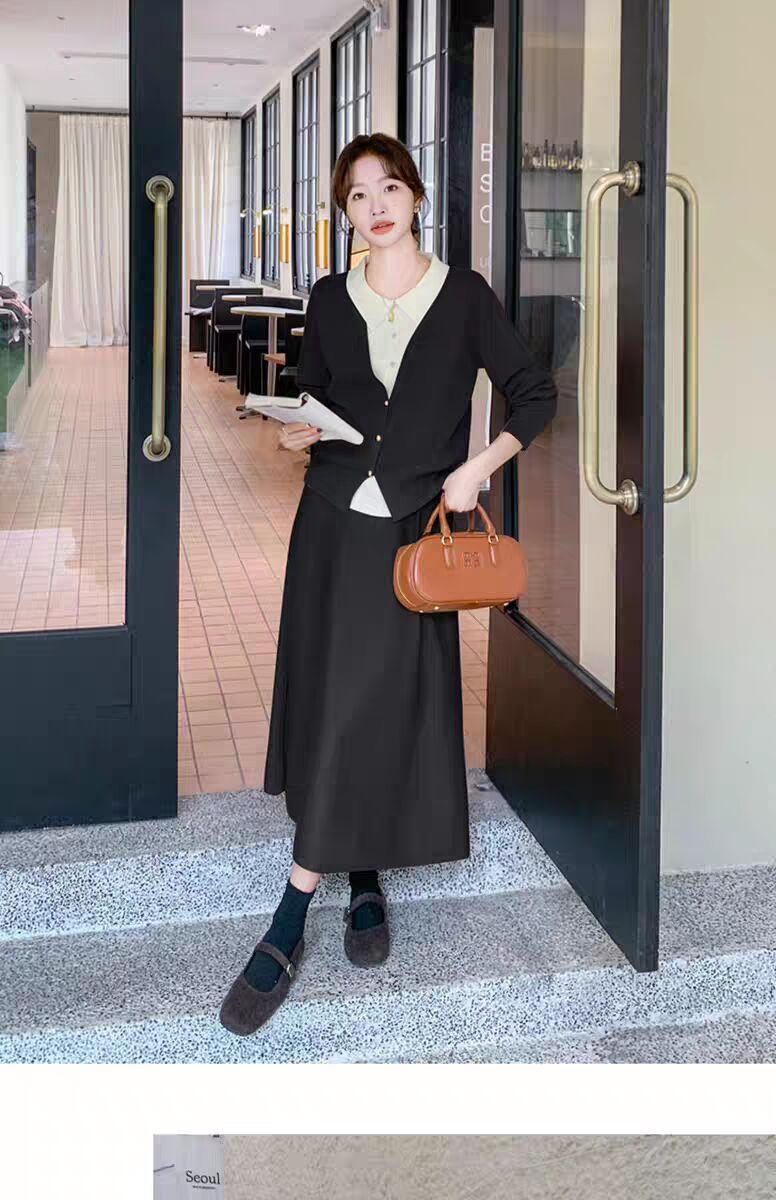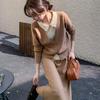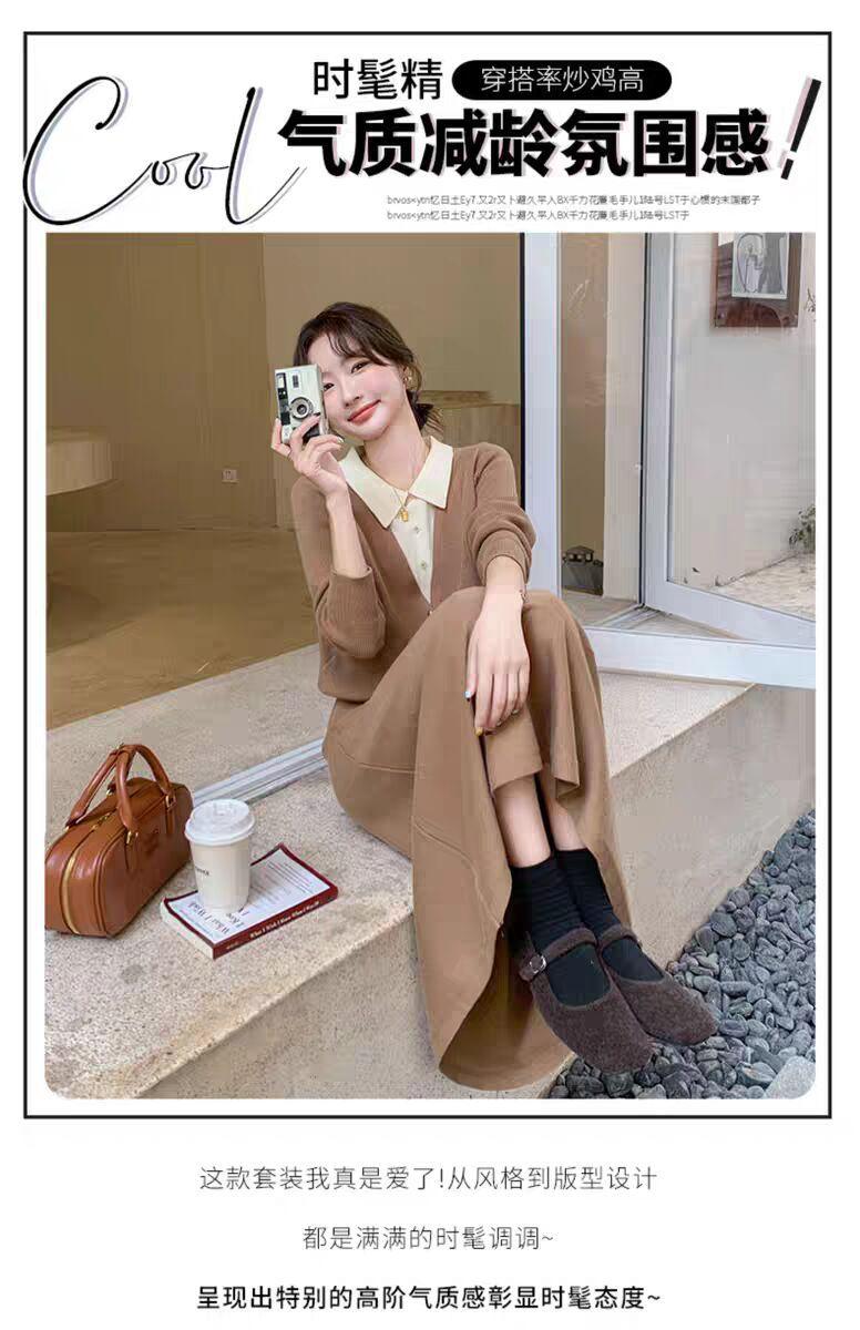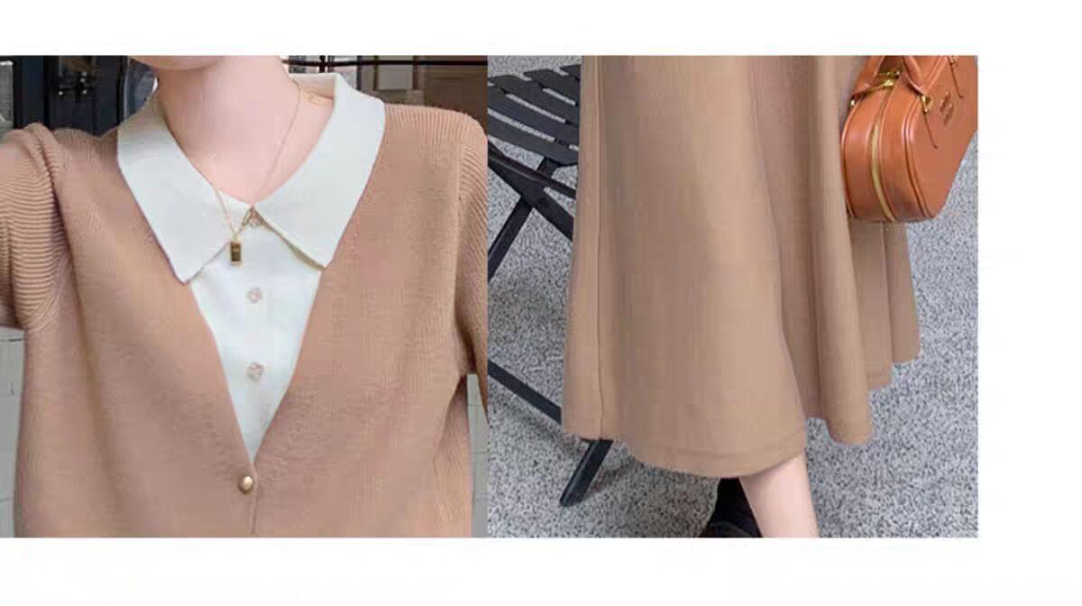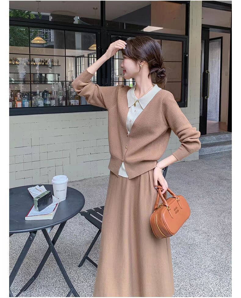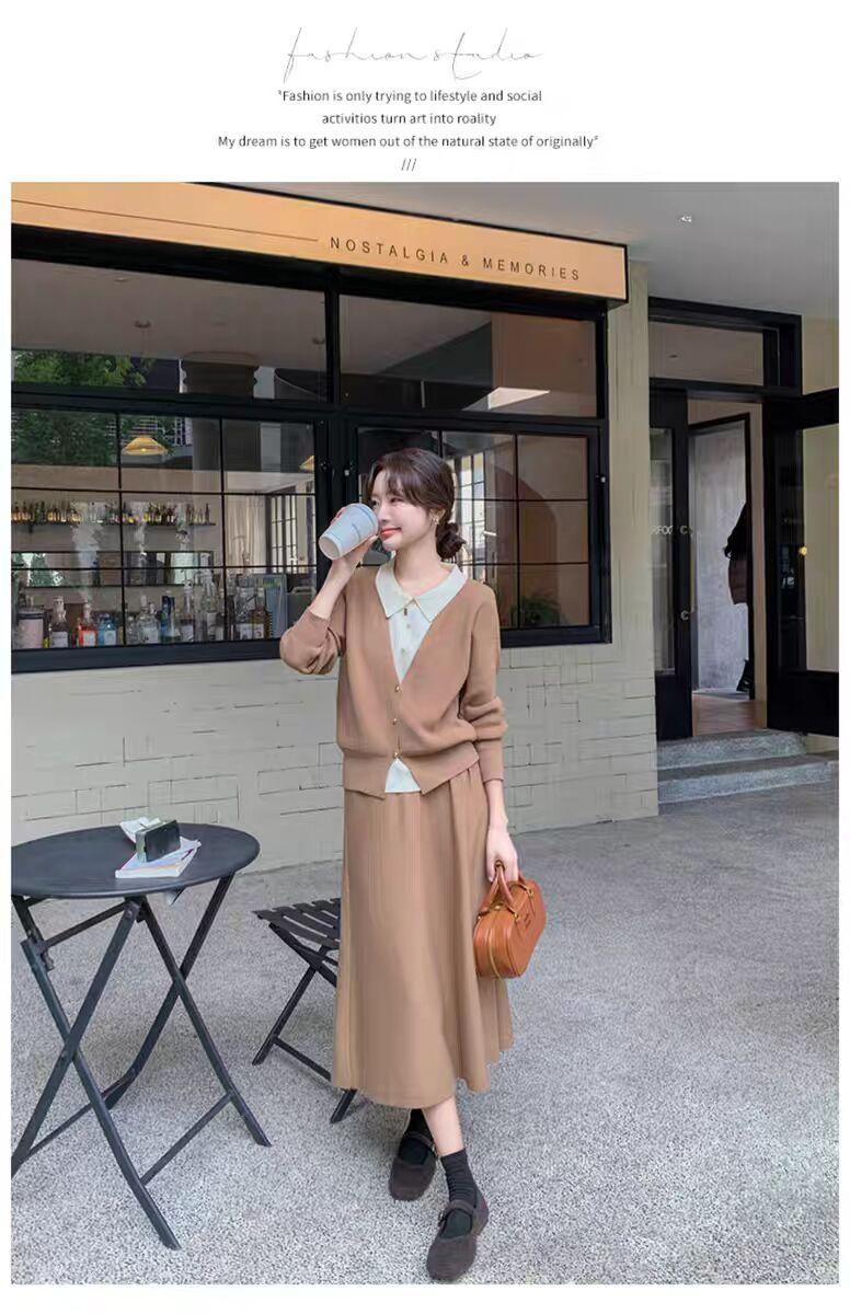 Conjunto de temperamento estilo coreano falda para mujer otoño nuevo costuras suéter de dos piezas falsas falda midi conjunto de dos piezas