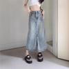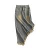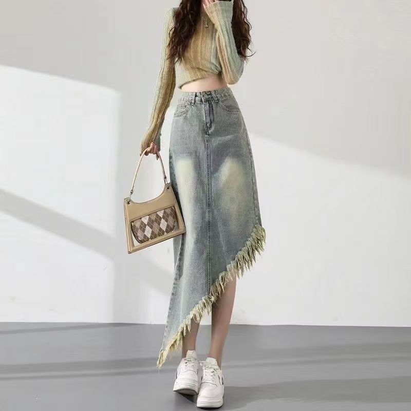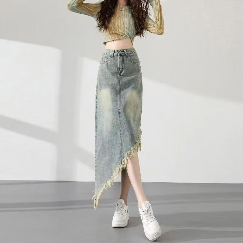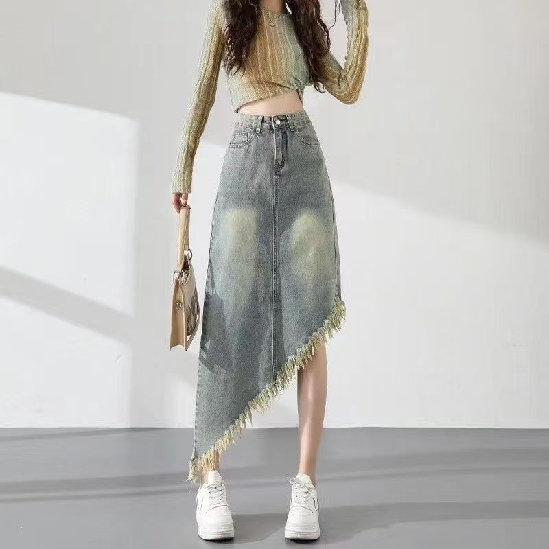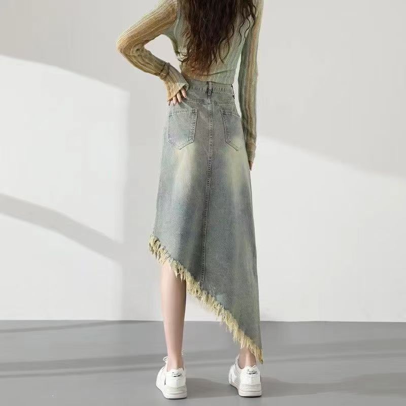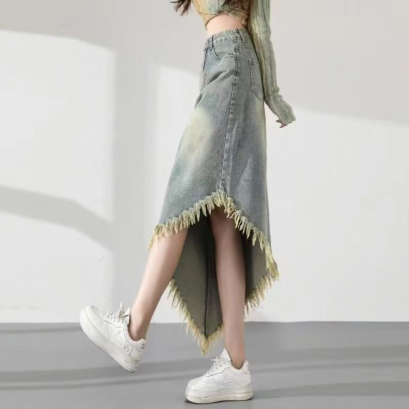 2025 Nueva Moda de Verano Versátil Falda de Mezclilla con Flecos y Bordes Crudos Diseño Slim de Cintura Alta Falda Línea A Trendy