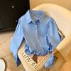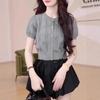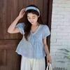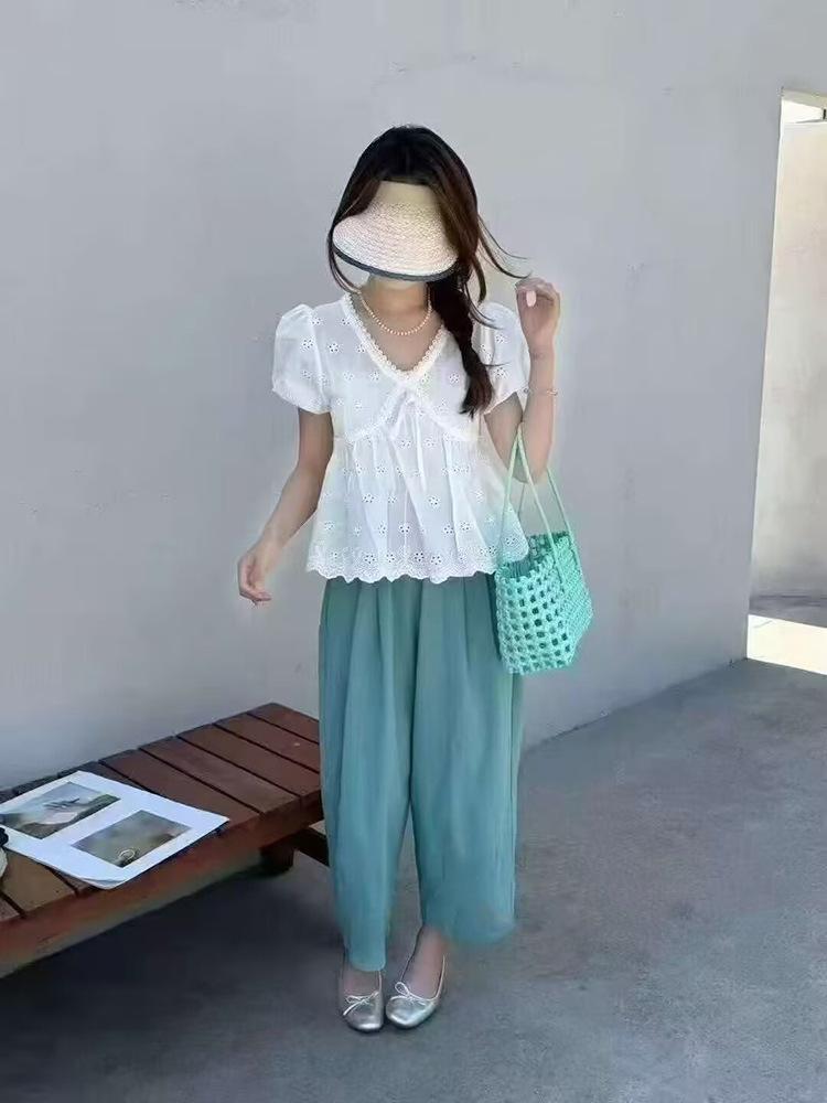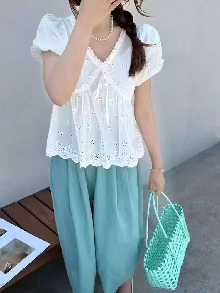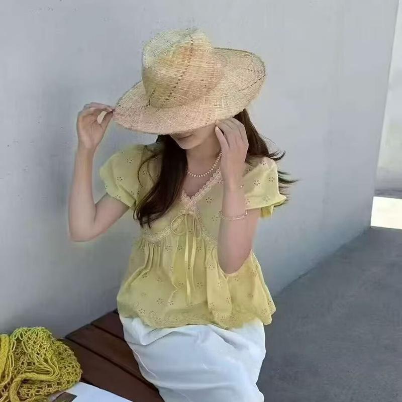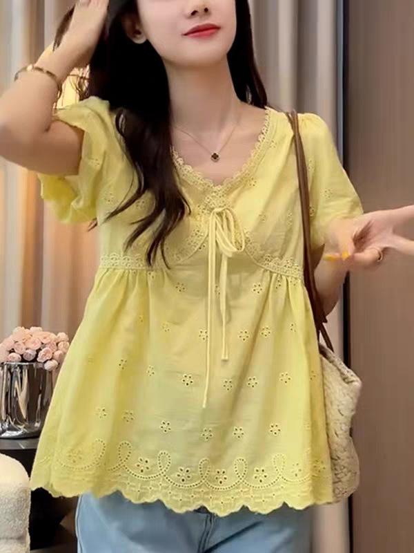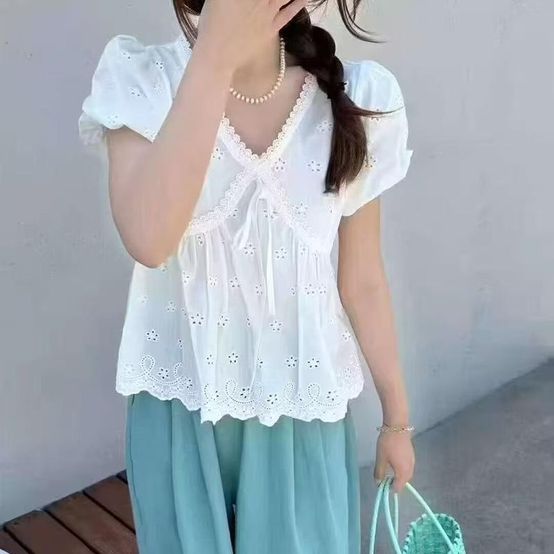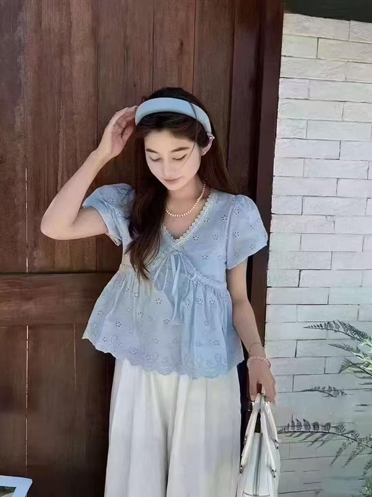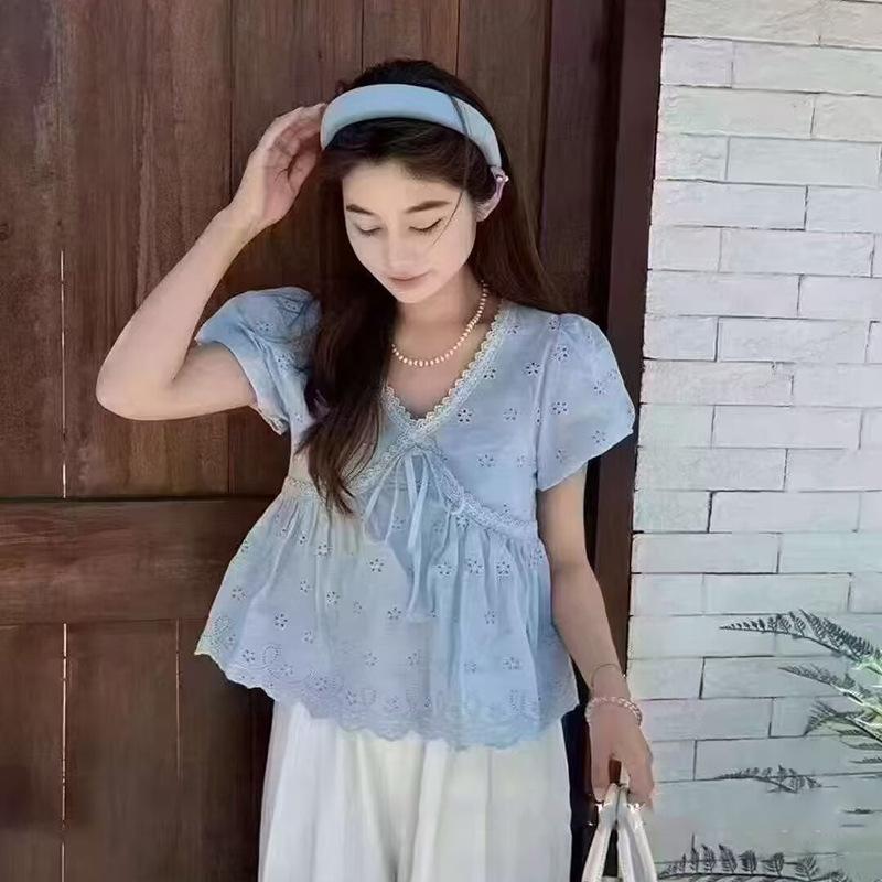 Camisa Bordada con Recortes Dulce Francesa que Reduce la Edad Top 2025 Verano Nuevo Estilo Camisa Hermosa y Delicada con Cuello en V
