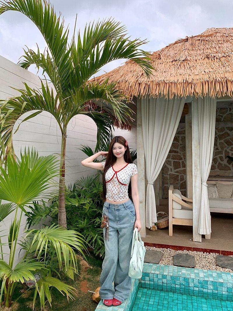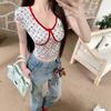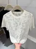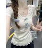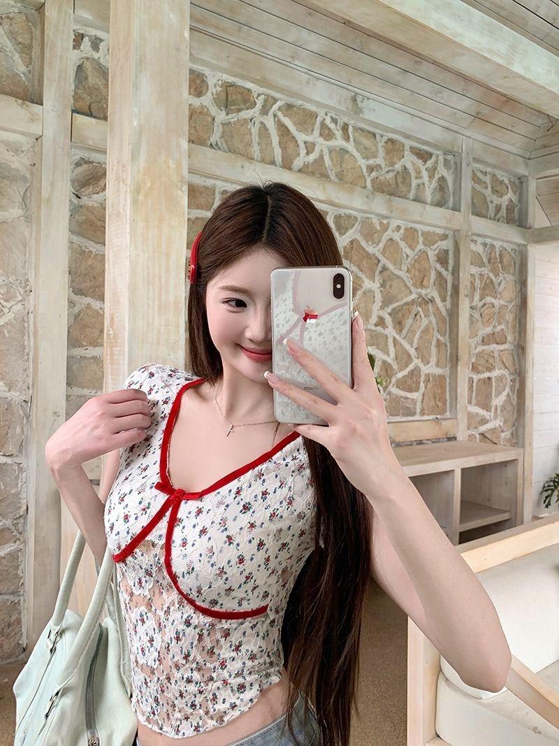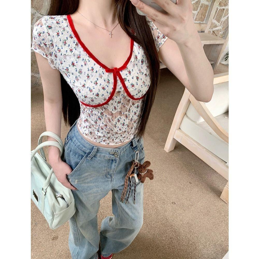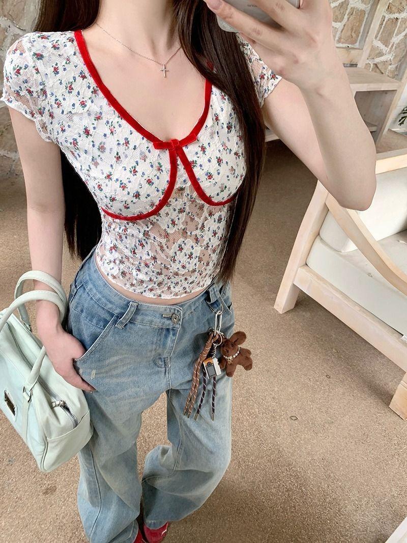 2025 Nueva Malla Sexy Dulce y Picante Reductor de Edad Floral Cuello en V Manga Corta Camiseta Top Adelgazante de Verano para Mujer Manga Corta Tendencia
