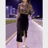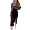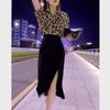 Cabello 9362 Gran Belleza Yiyuan 2023 Verano Nuevo Solapa Manga Corta Leopardo Punto Camisa Falda con Abertura Cintura Alta Mujer