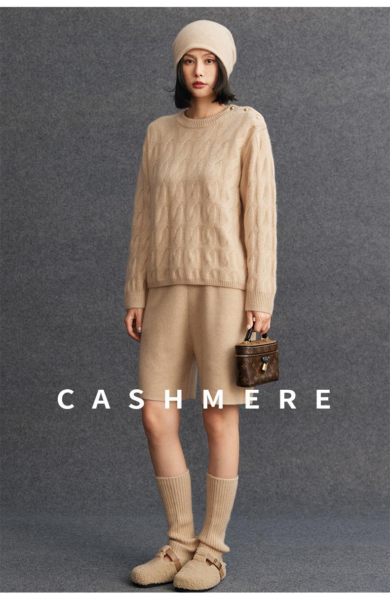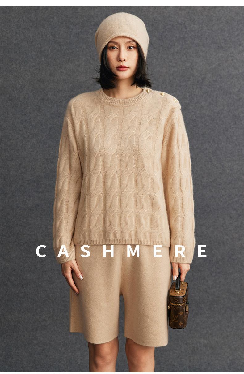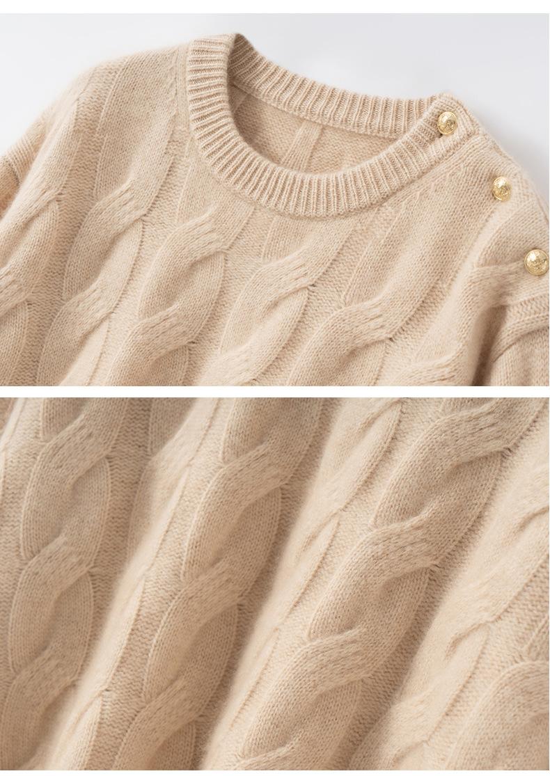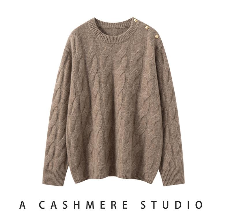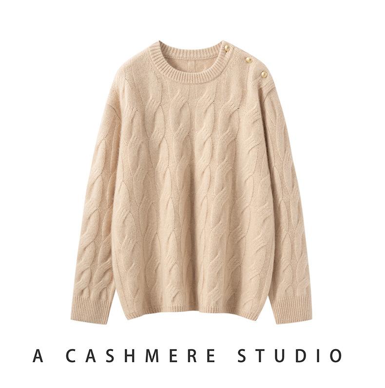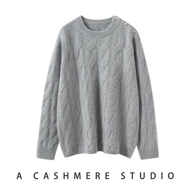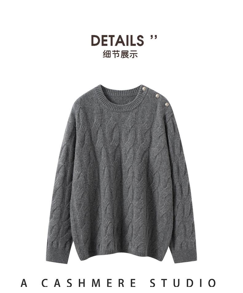 Suéter de Cachemira para Mujer Cuello Redondo Tejido de Cable Suelto Casual Estilo Perezoso Versátil Suéter de Punto Otoño e Invierno Nuevo Suéter de Cachemira Base