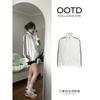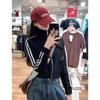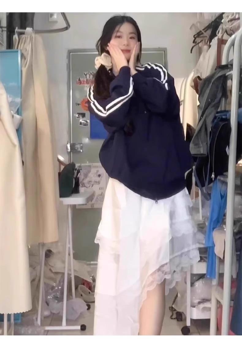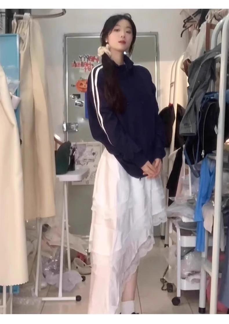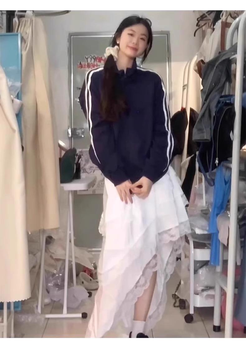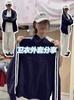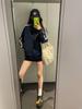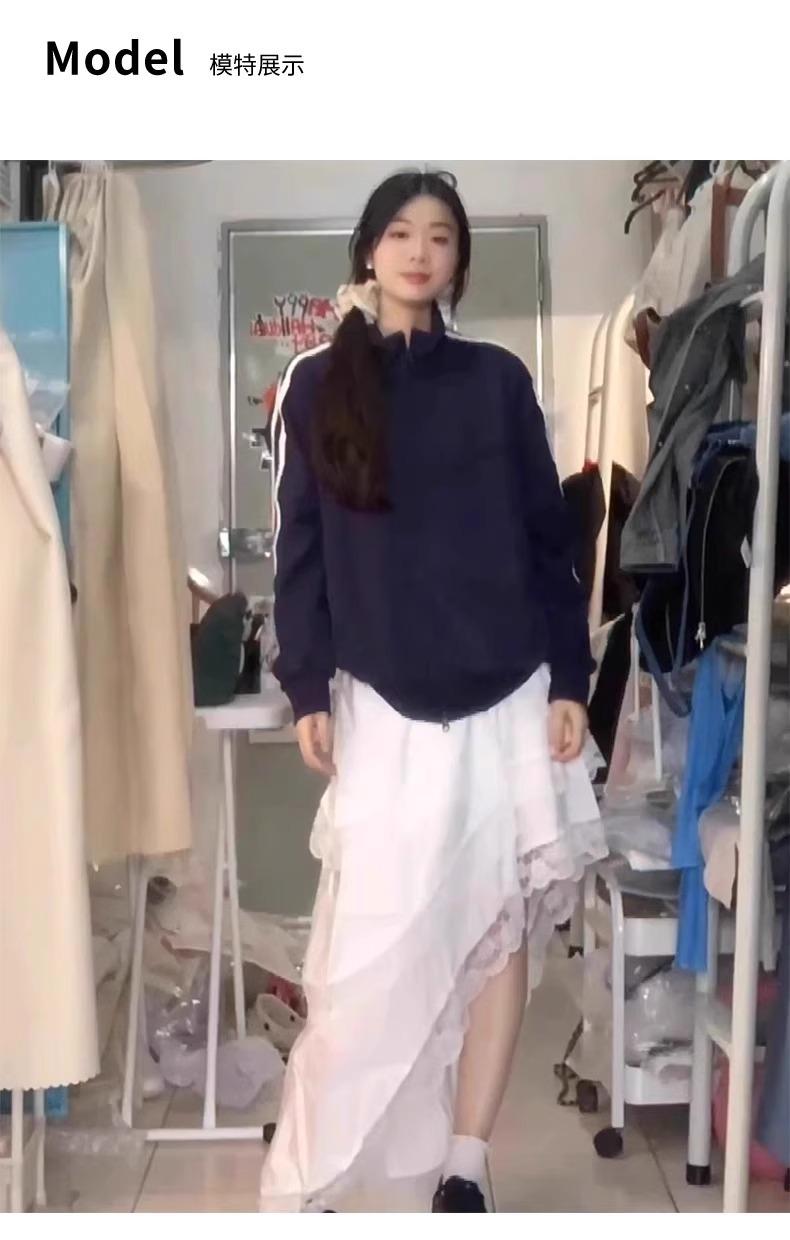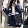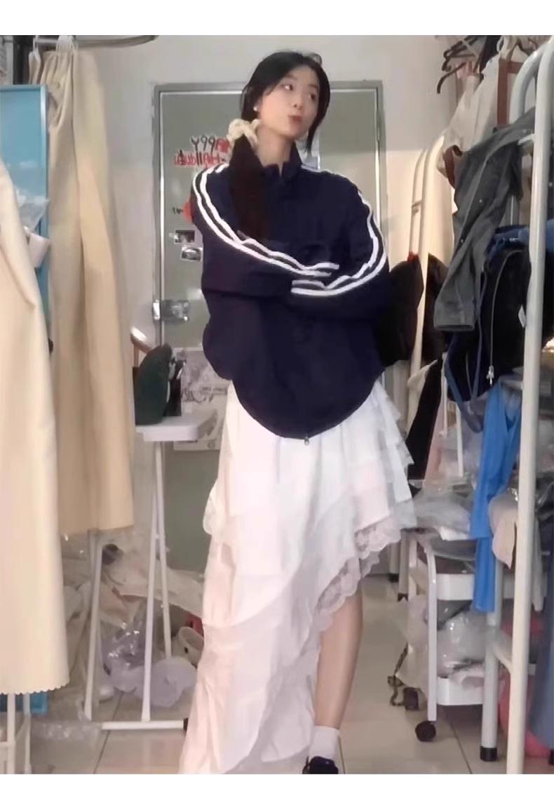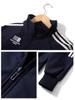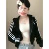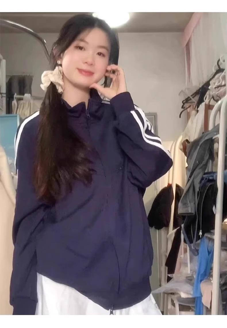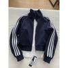 Chaqueta azul oscuro de dos rayas para mujer, top de cuello alto, uniforme de béisbol retro americano, chaqueta de otoño, estilo casual deportivo