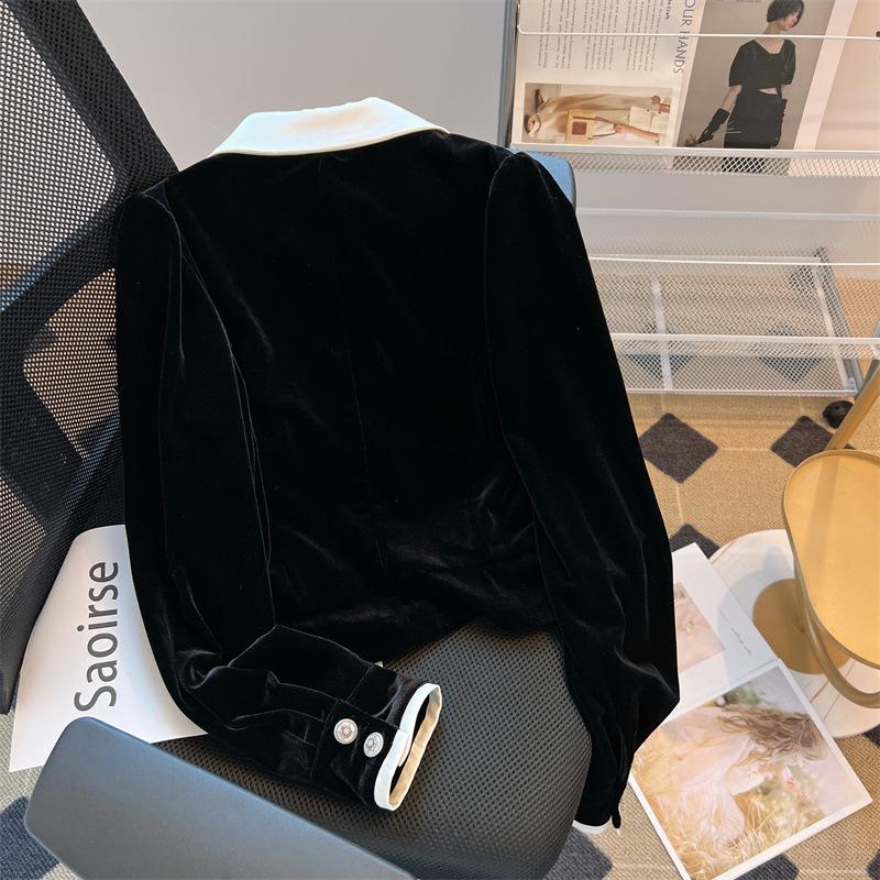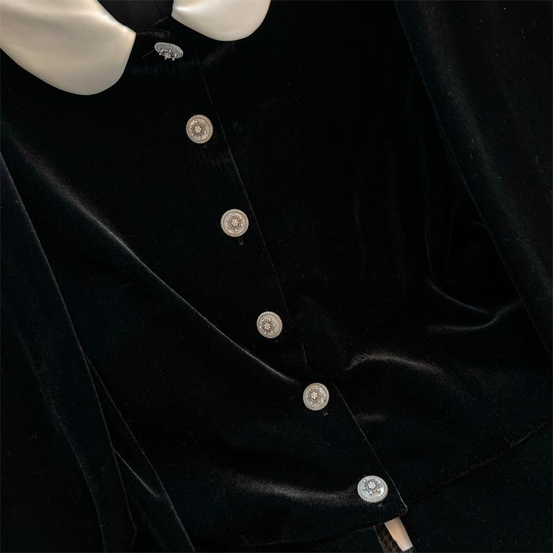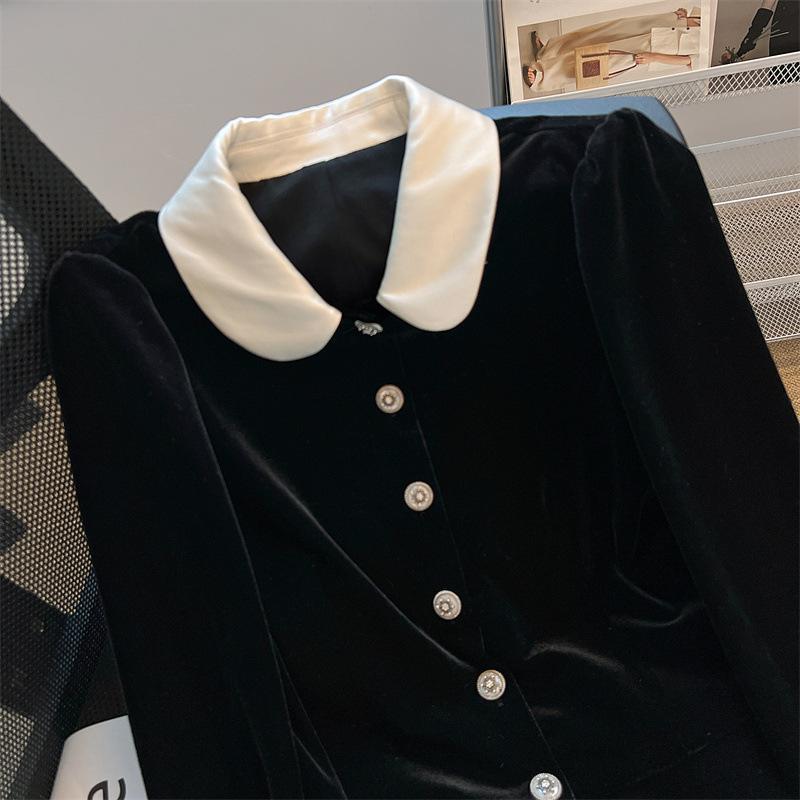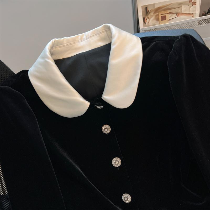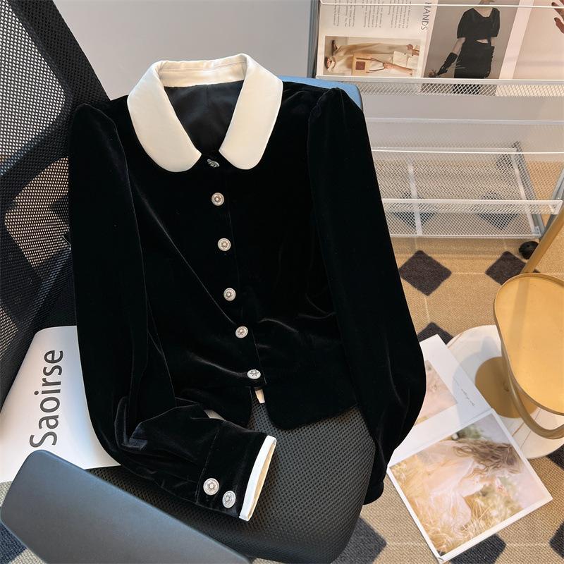 Foto en vivo~ Camisa de terciopelo negro con cuello Peter Pan para mujer, alta gama 2025, otoño, nueva moda, socialité, elegante, petite