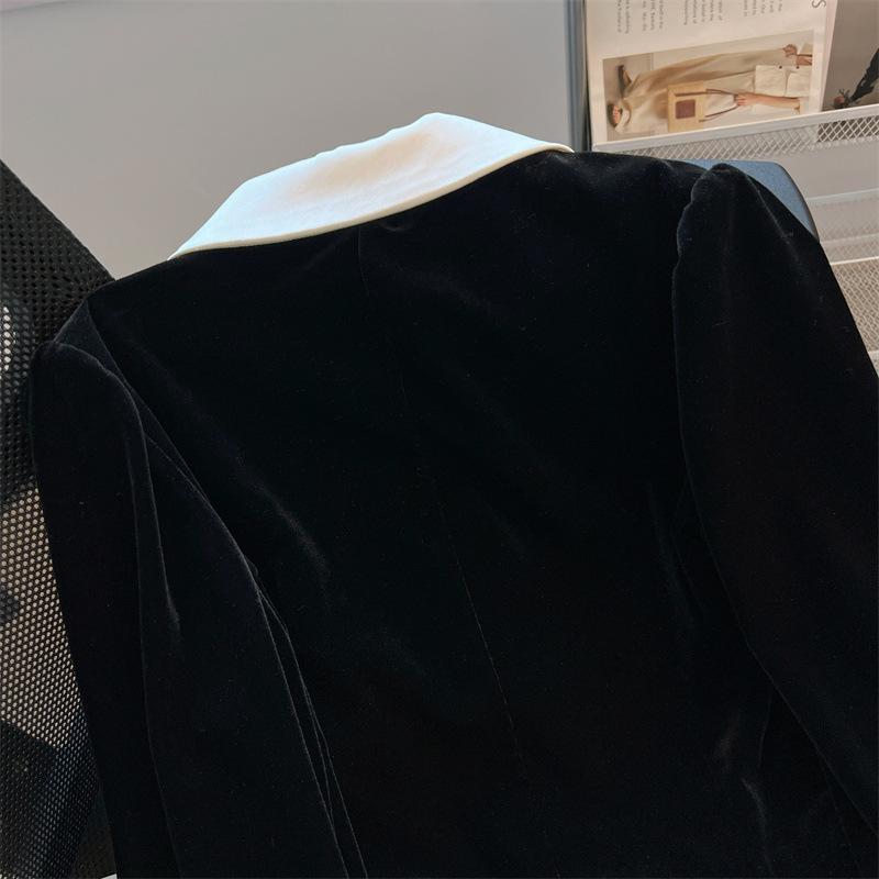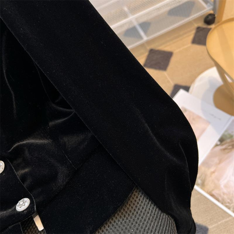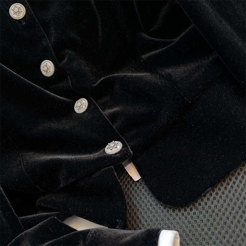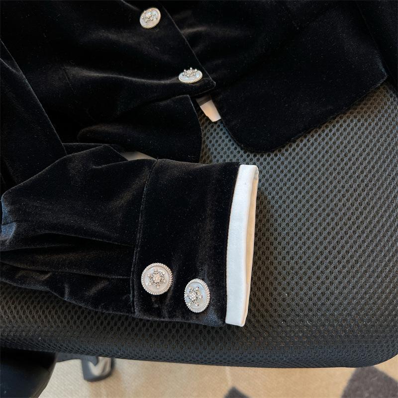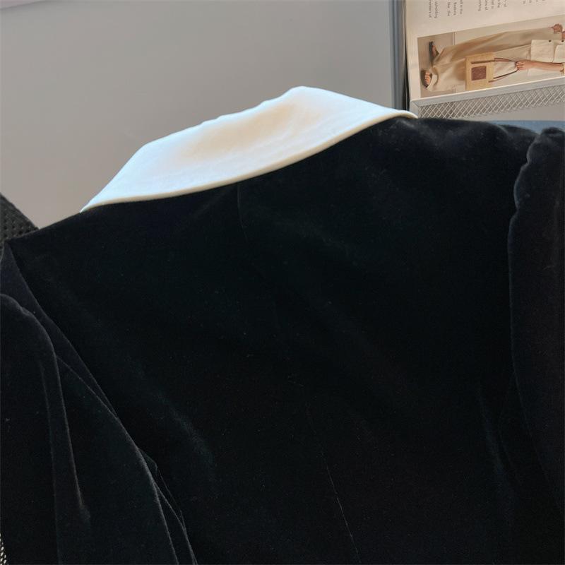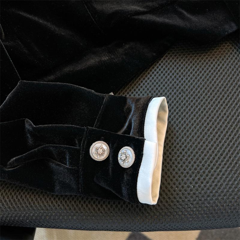 Foto en vivo~ Camisa de terciopelo negro con cuello Peter Pan para mujer, alta gama 2025, otoño, nueva moda, socialité, elegante, petite