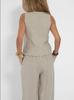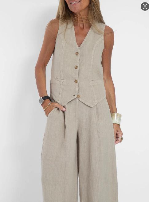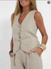2025 Moda Casual Transfronteriza Europea y Americana para Mujer Chaleco de Cuello en V Pantalones Largos Patchwork Empalme Algodón y Lino Set
