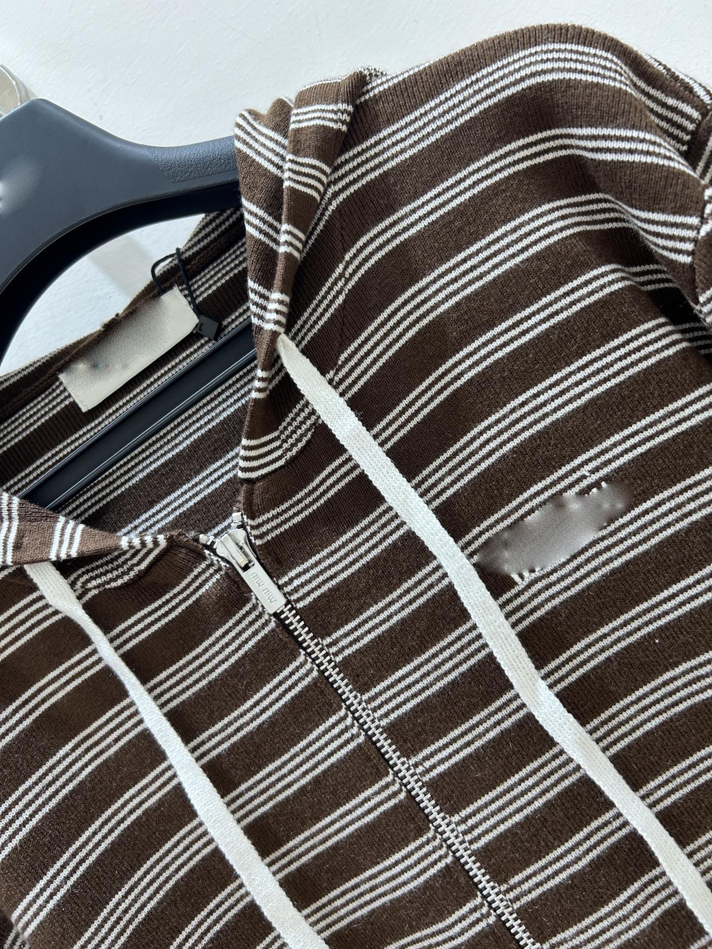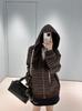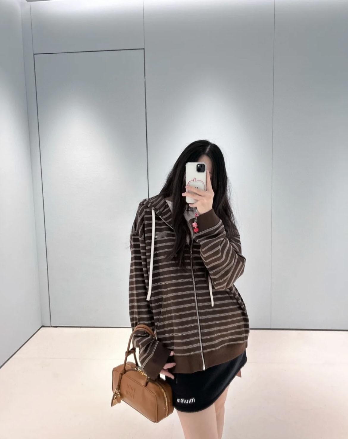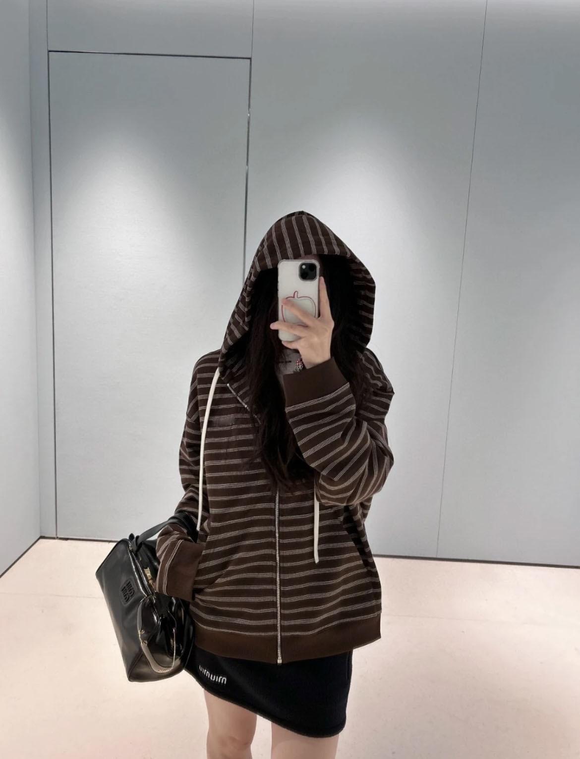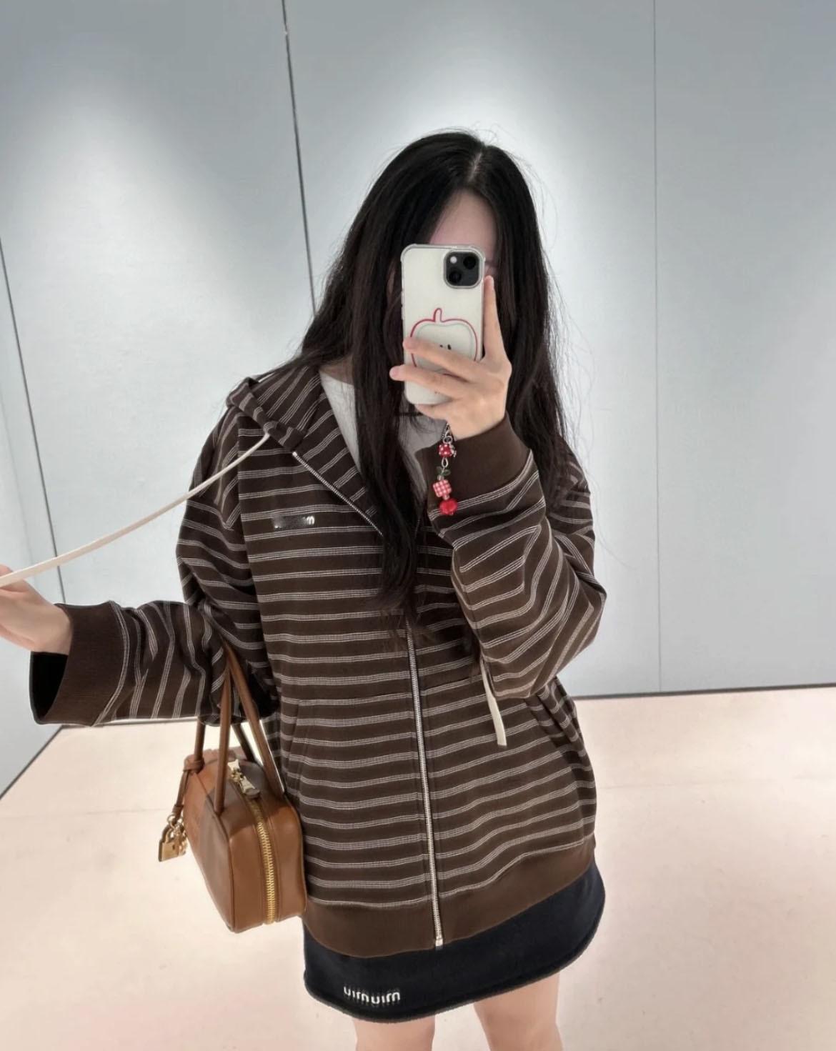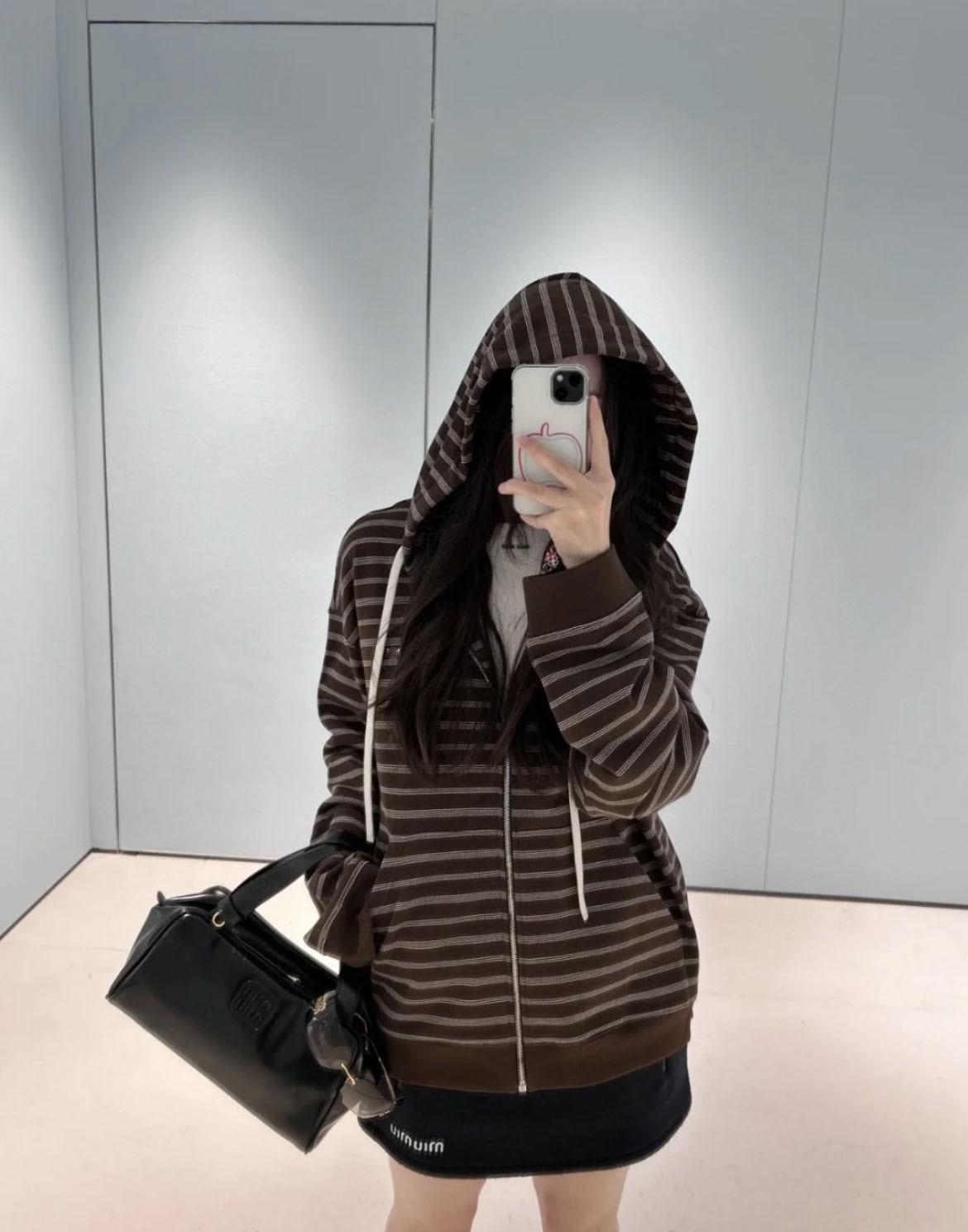 Chamarra con Capucha Rayada Retro Americana para Mujer Otoño Invierno 2025 Nuevo Cárdigan Holgado Casual Perezoso Estilo Universitario con Cierre