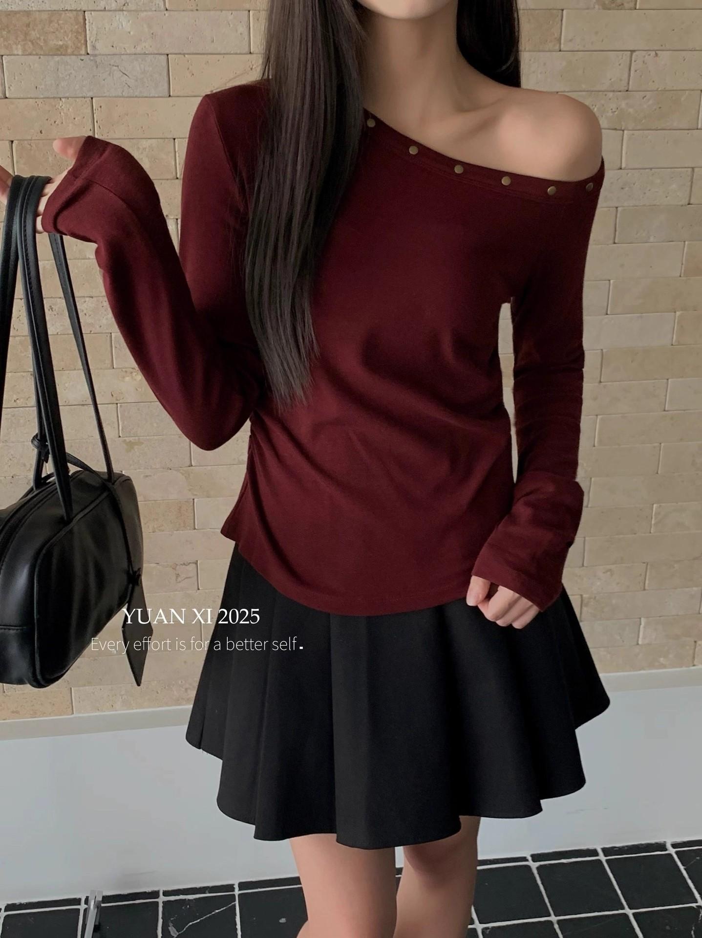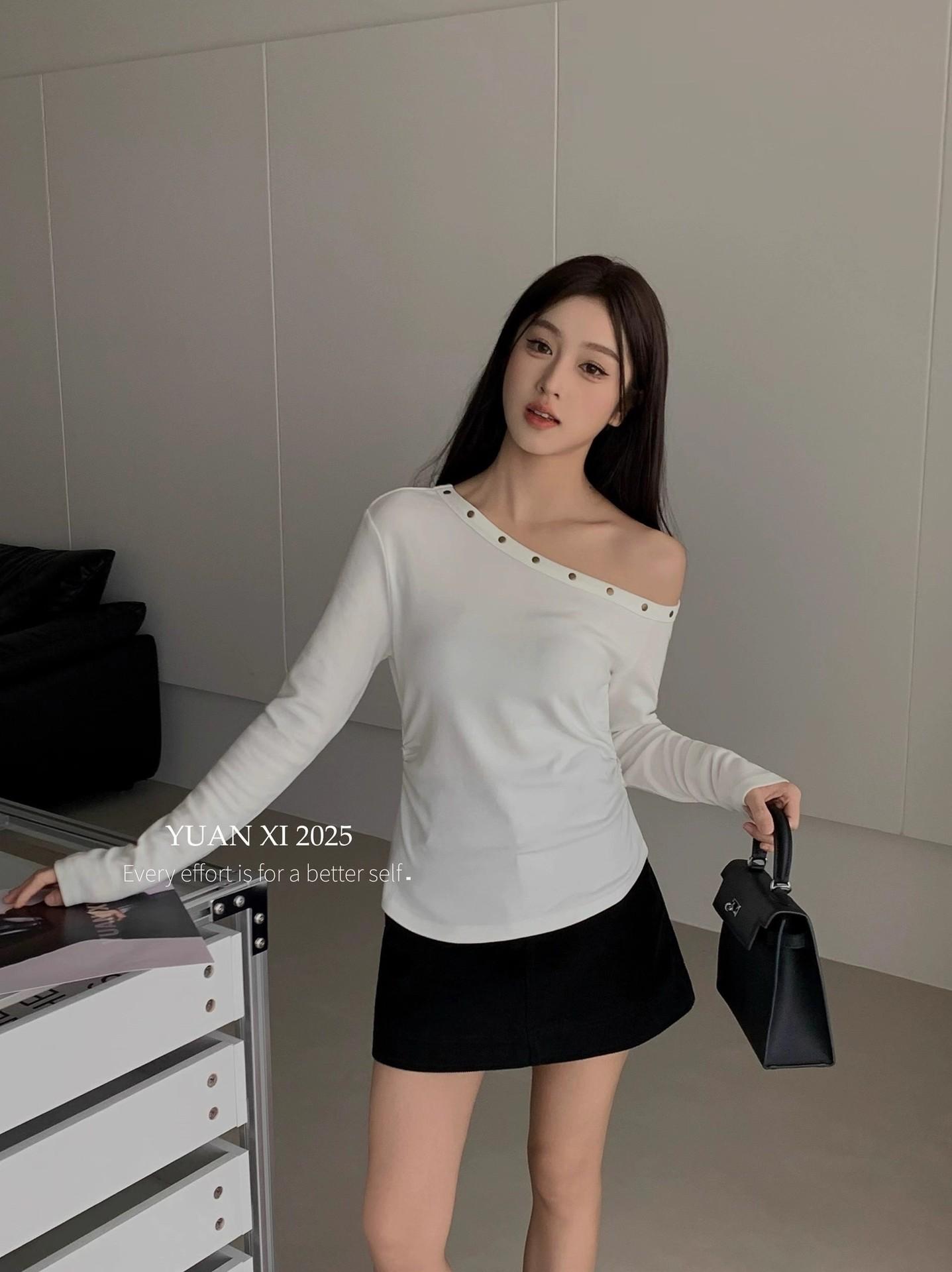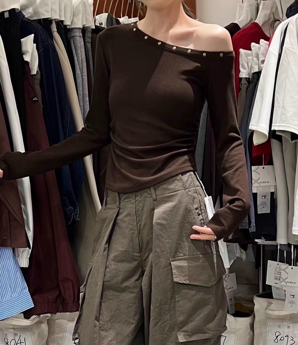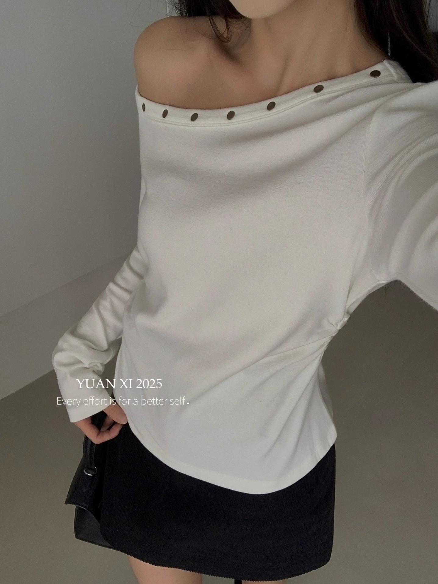 Otoño 2025 Nueva Personalidad Tendencia Estilo Coreano Remache Temperamento Camiseta de un Hombro Mujer Slim Versátil Adelgazante Top