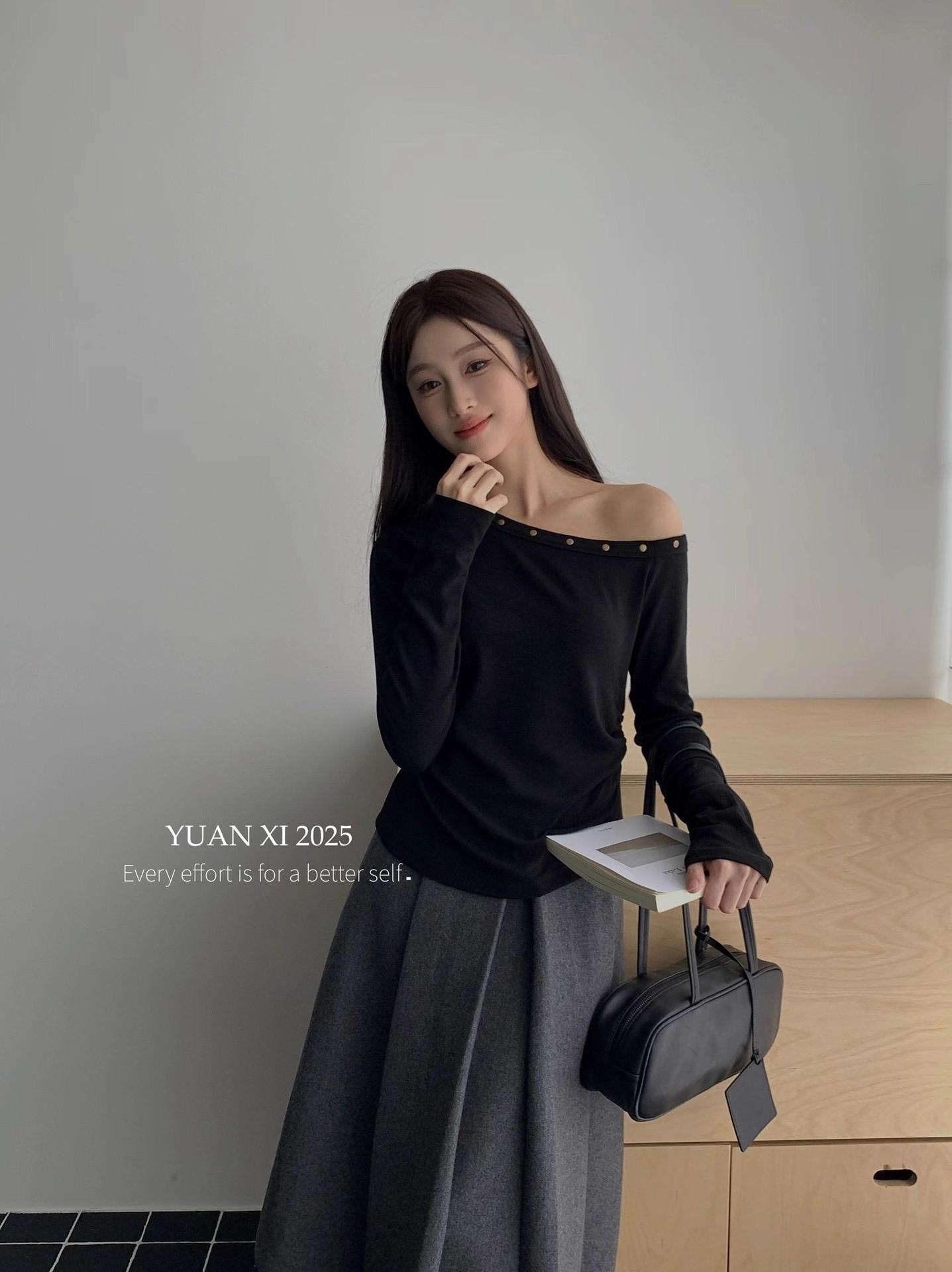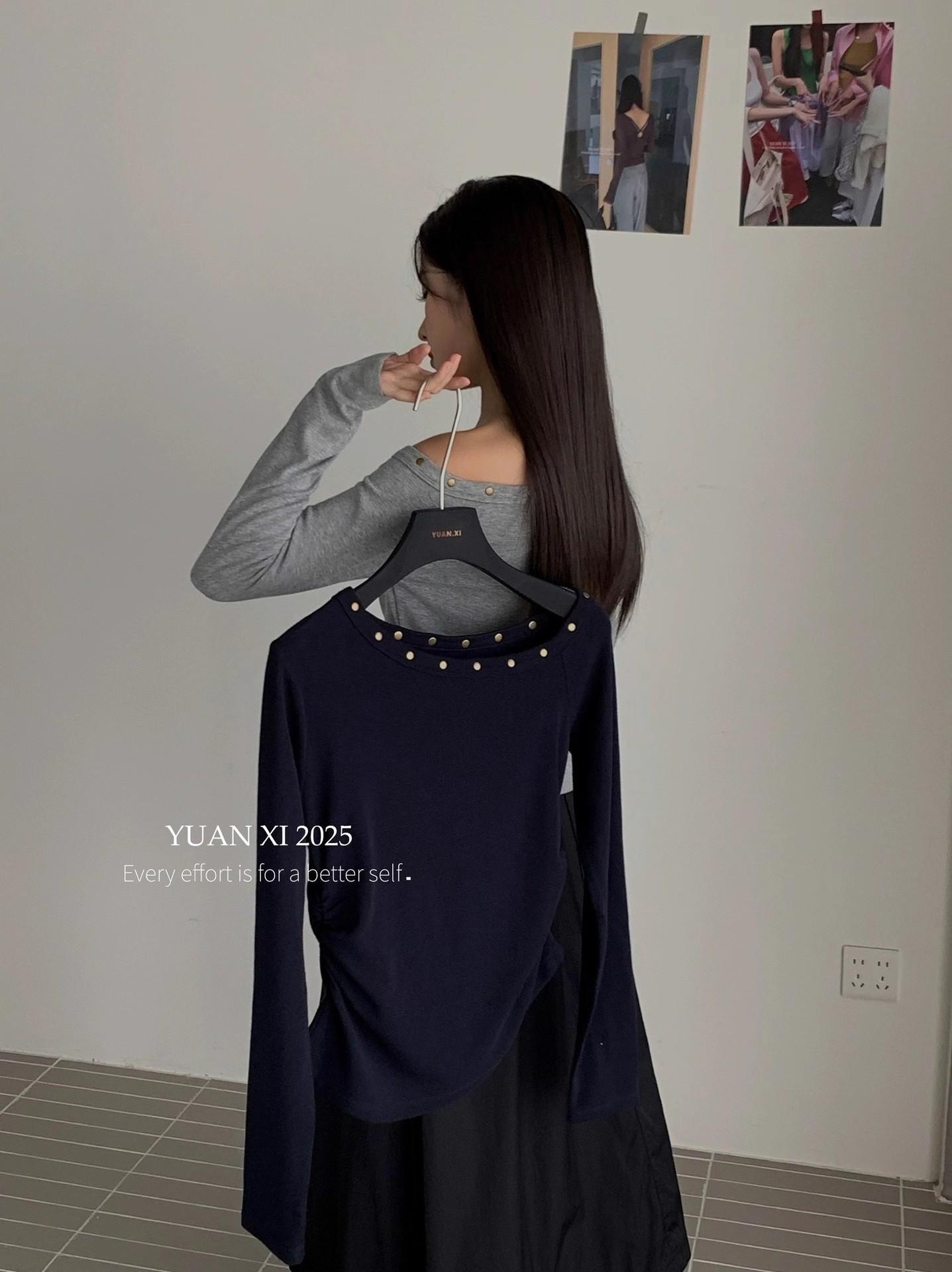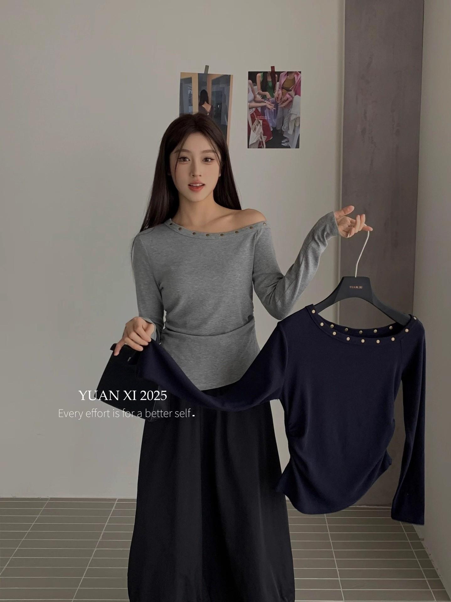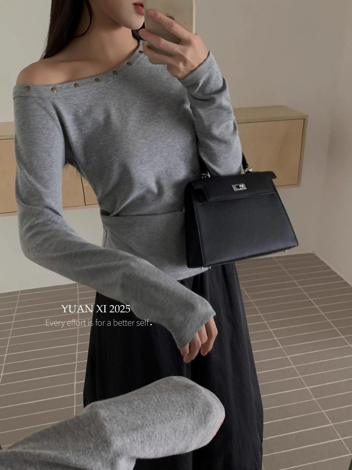 Otoño 2025 Nueva Personalidad Tendencia Estilo Coreano Remache Temperamento Camiseta de un Hombro Mujer Slim Versátil Adelgazante Top