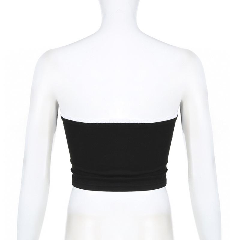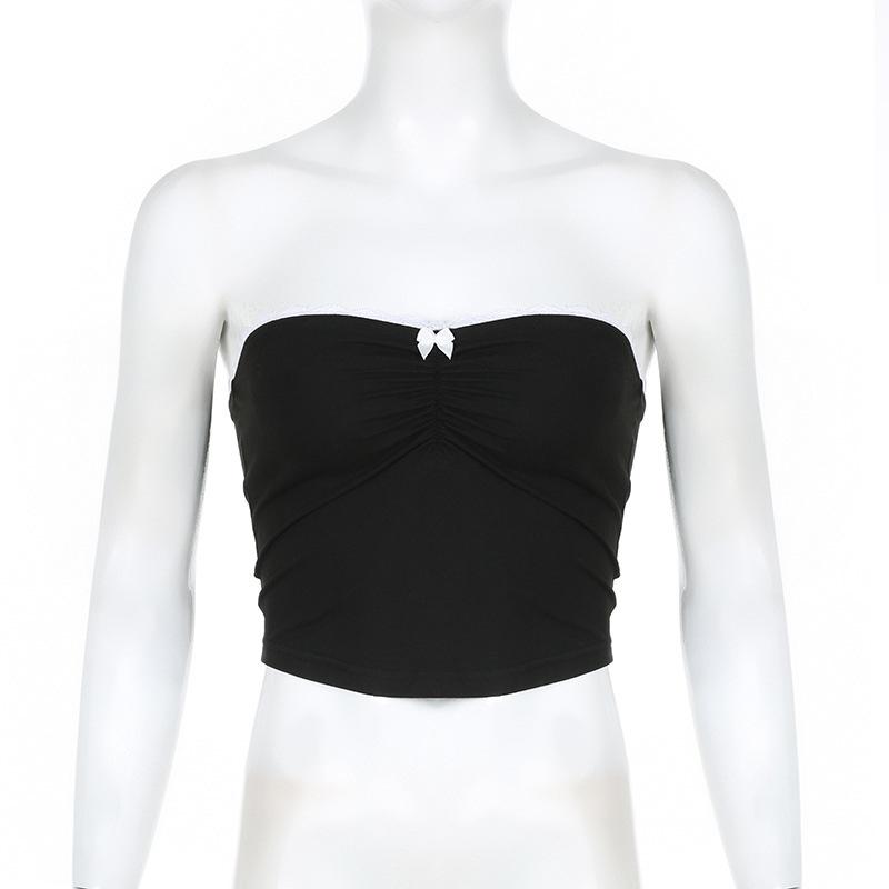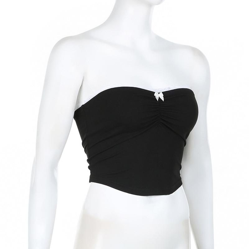 Nuevo Sexy Europeo y Americano Top de Tubo de Color Puro con Plisados y Lazo de Encaje Empalmado Chaleco Trendy Sexy Ajustado para Mujer