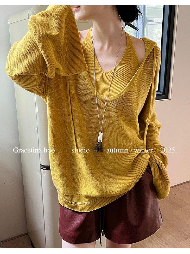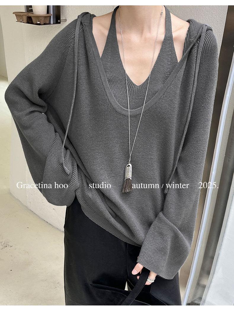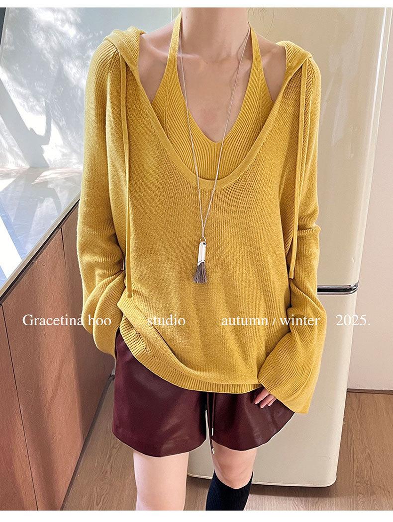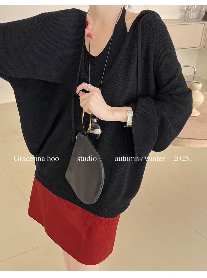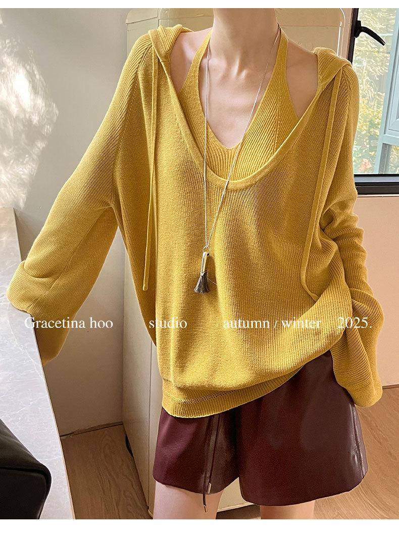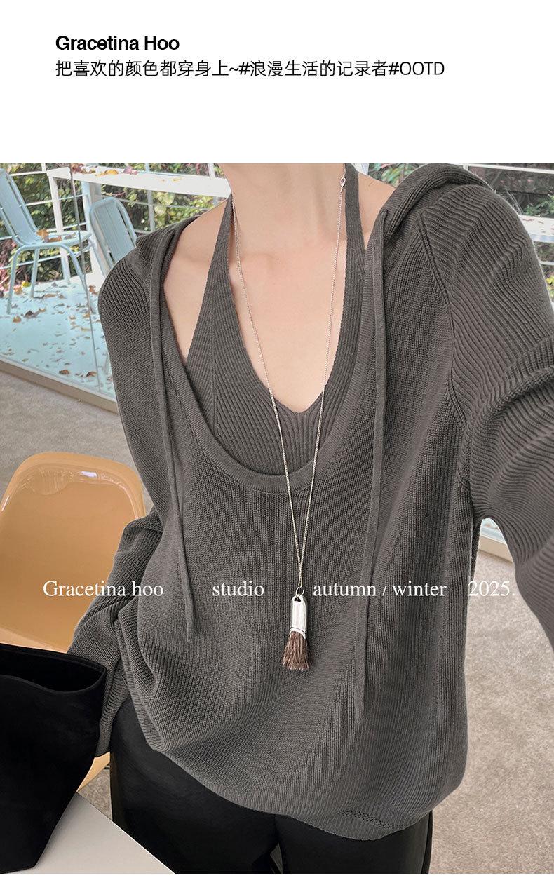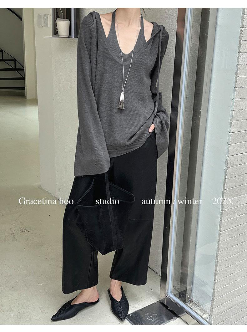 GRACETINAHOO Otoño Nuevo Lana Mercerizada Chaleco Halter Francés Versátil Conjunto de Punto con Capucha ZC6121