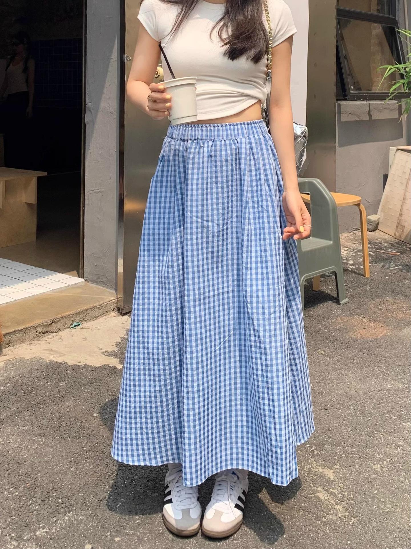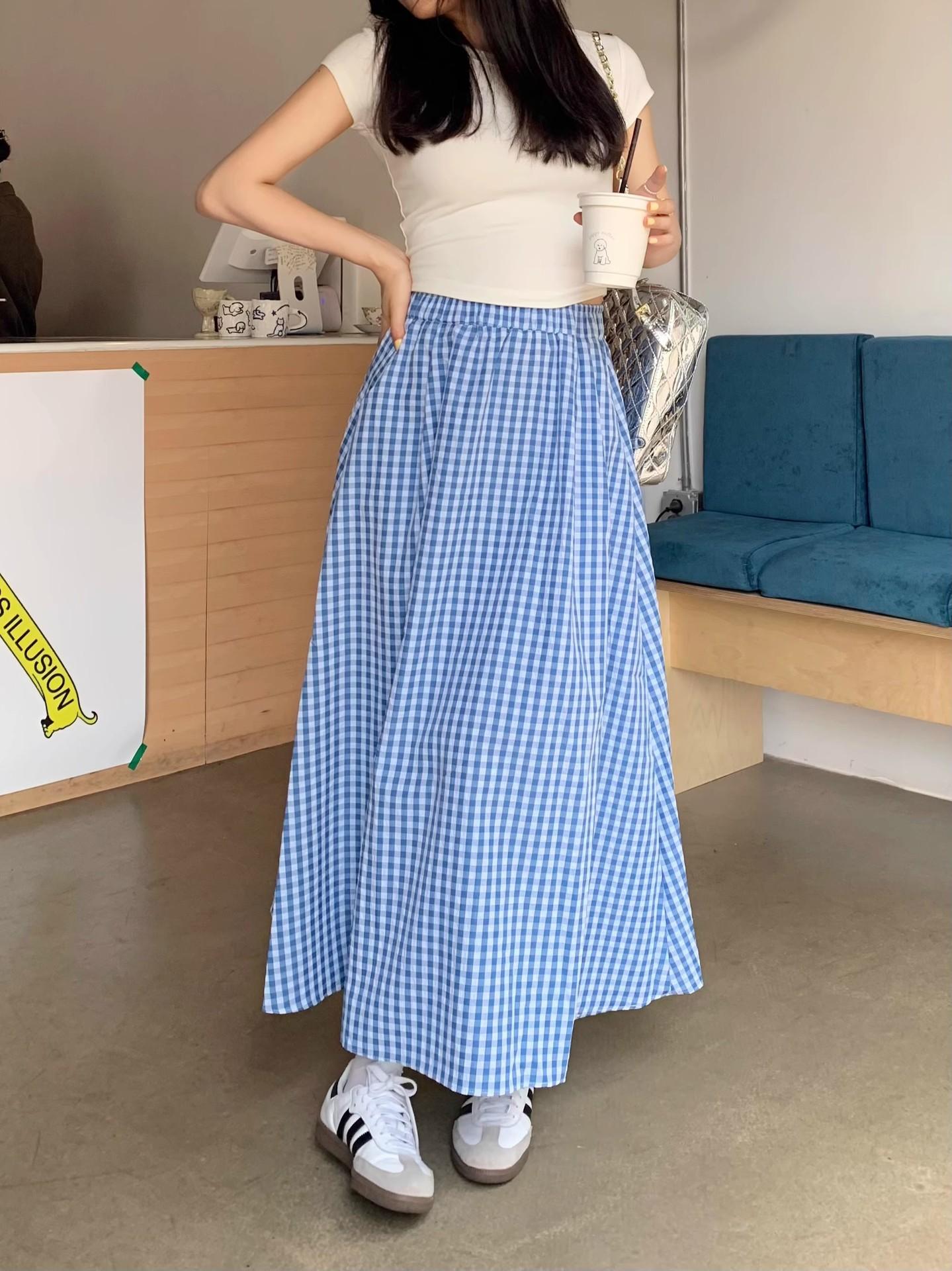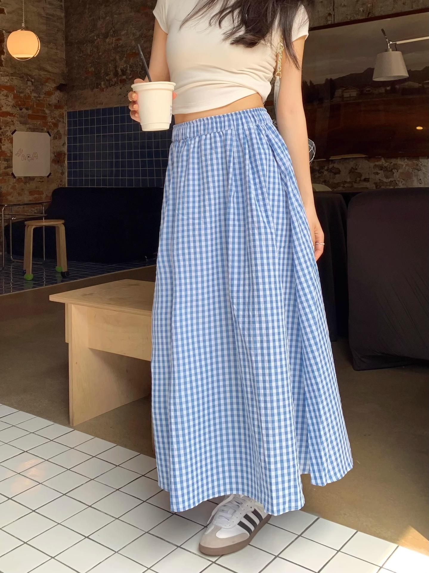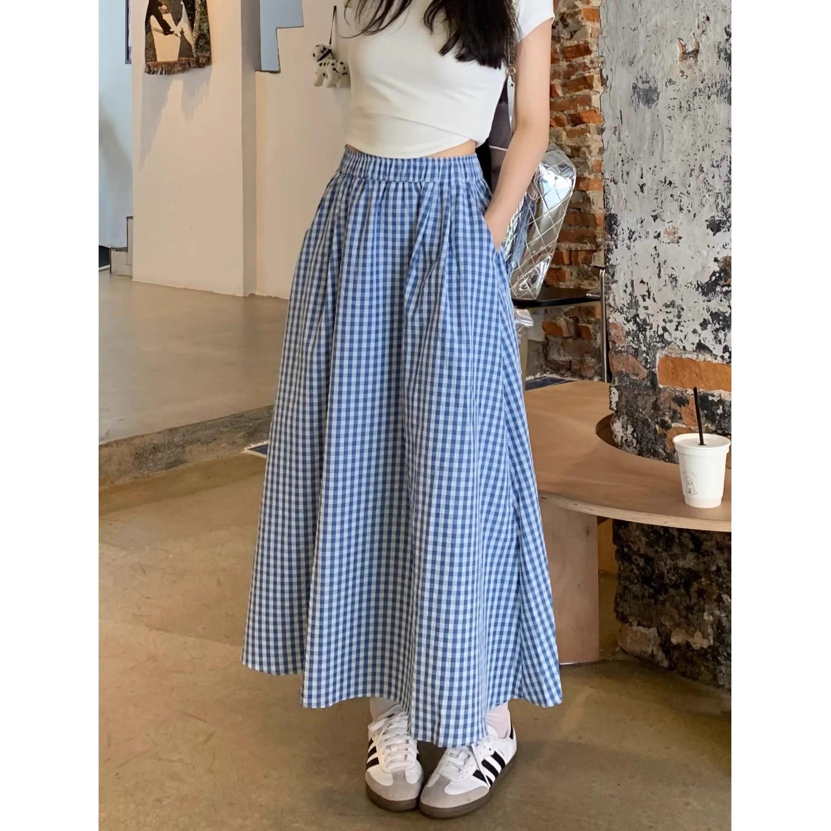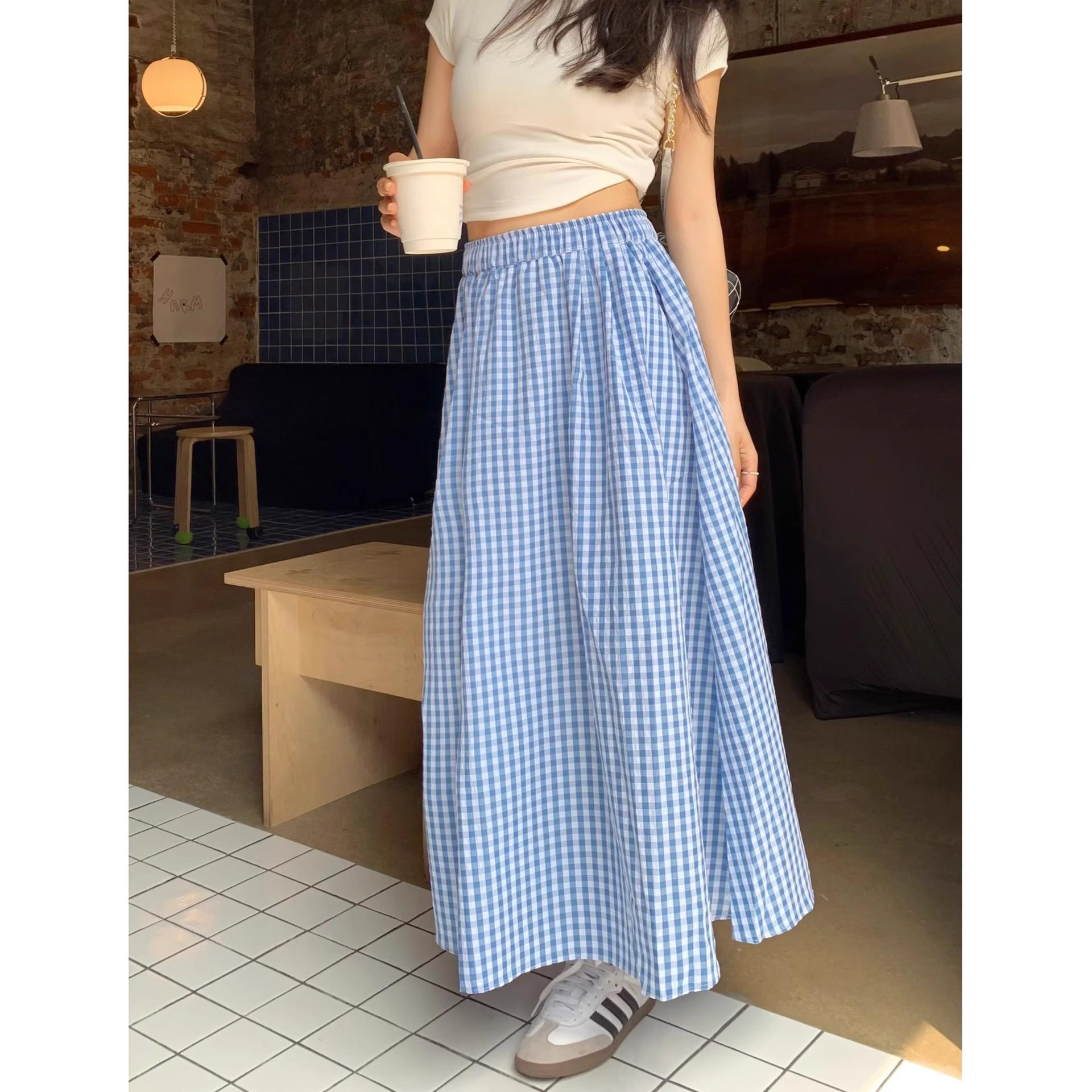 Falda Cuadros Azul Mujer Largo Medio 2025 Verano Nuevo Estilo Coreano Cintura Alta Adelgazante Corte A Cintura Elástica Falda Paraguas