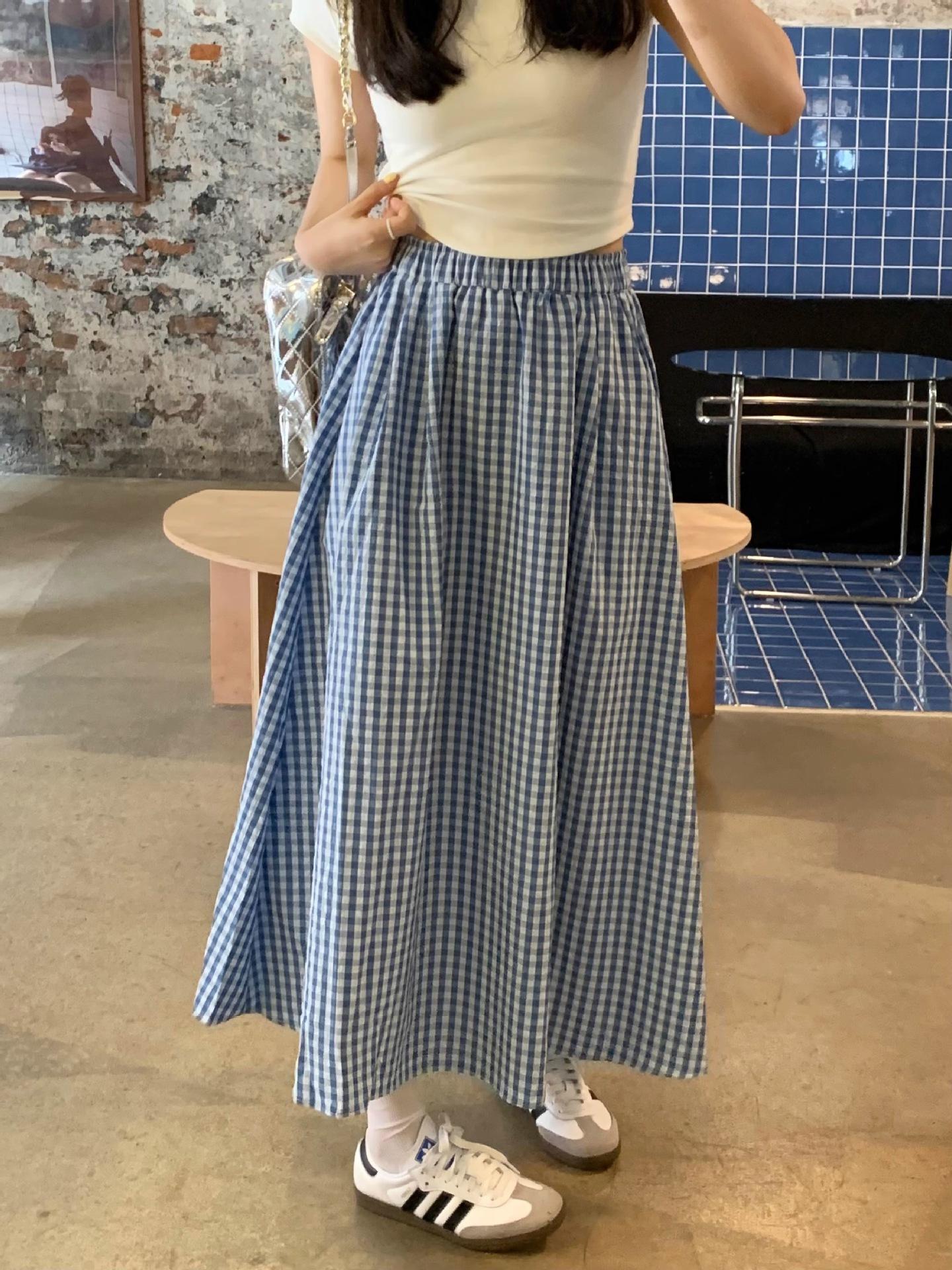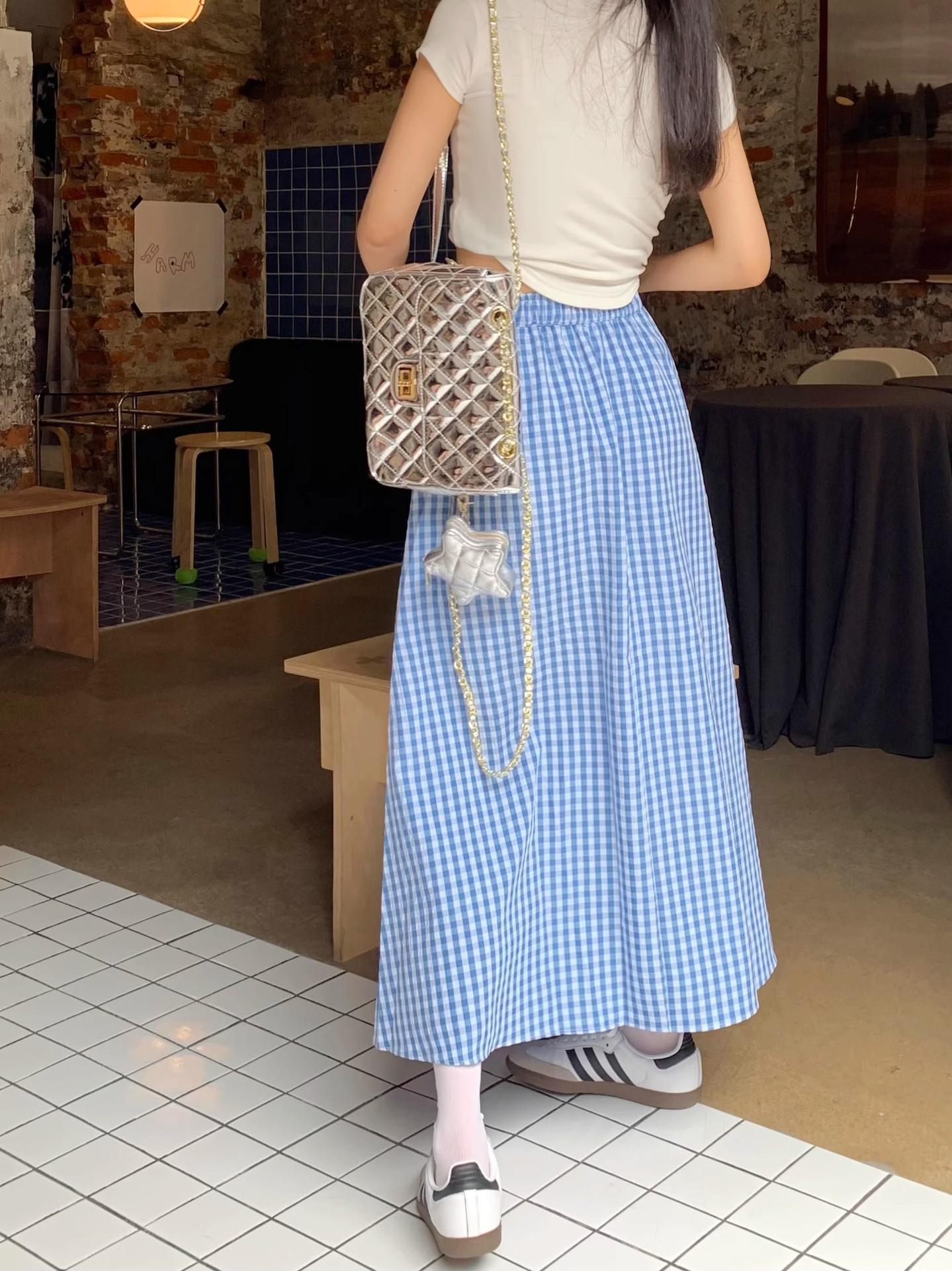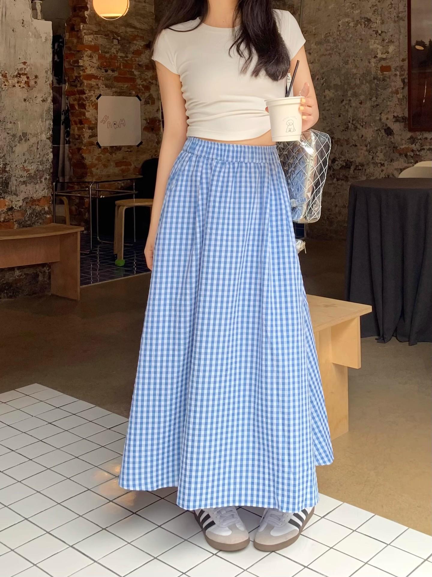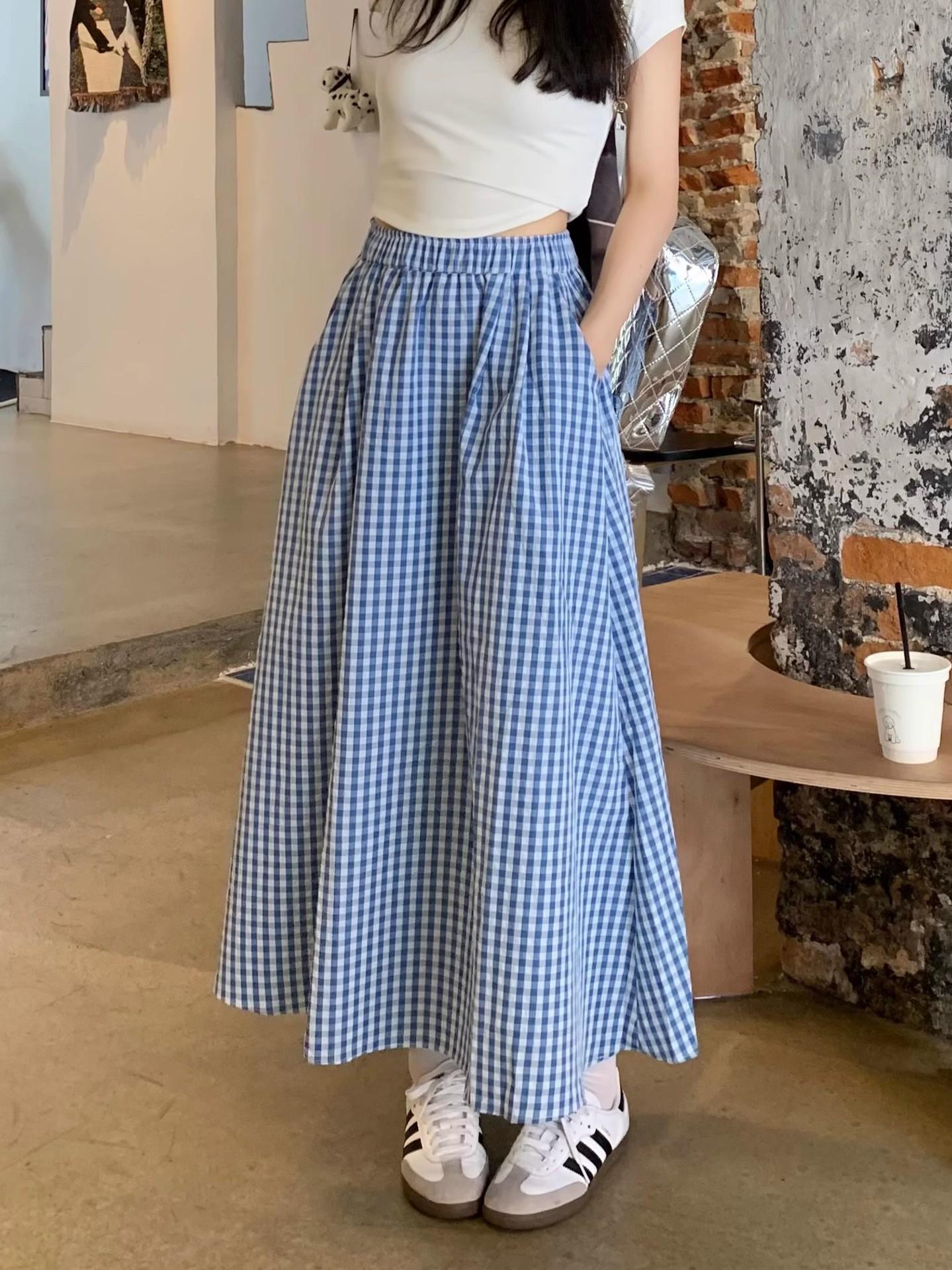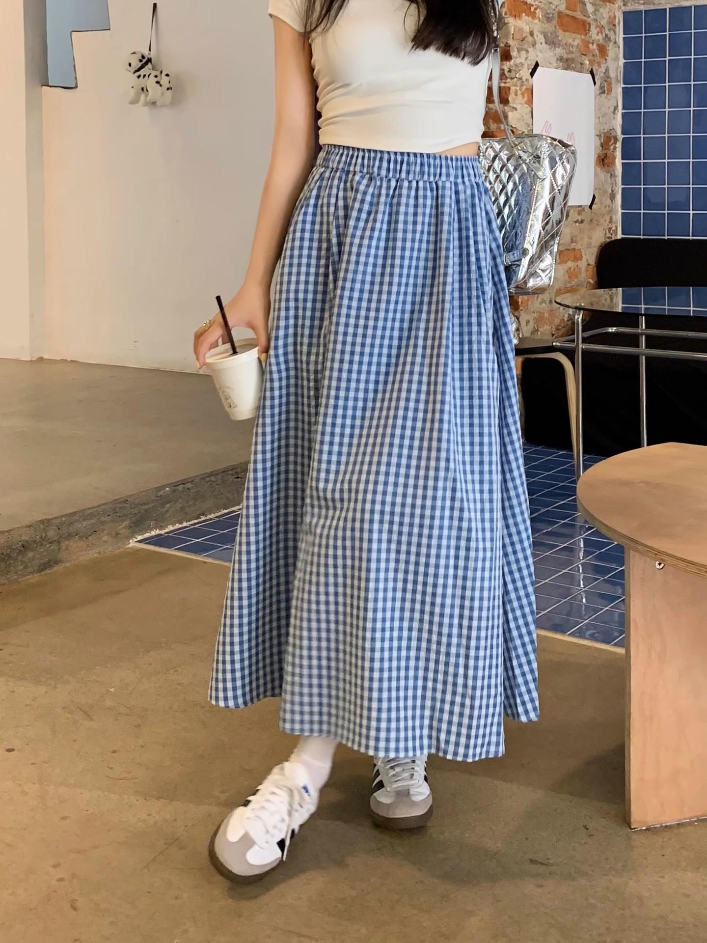 Falda Cuadros Azul Mujer Largo Medio 2025 Verano Nuevo Estilo Coreano Cintura Alta Adelgazante Corte A Cintura Elástica Falda Paraguas
