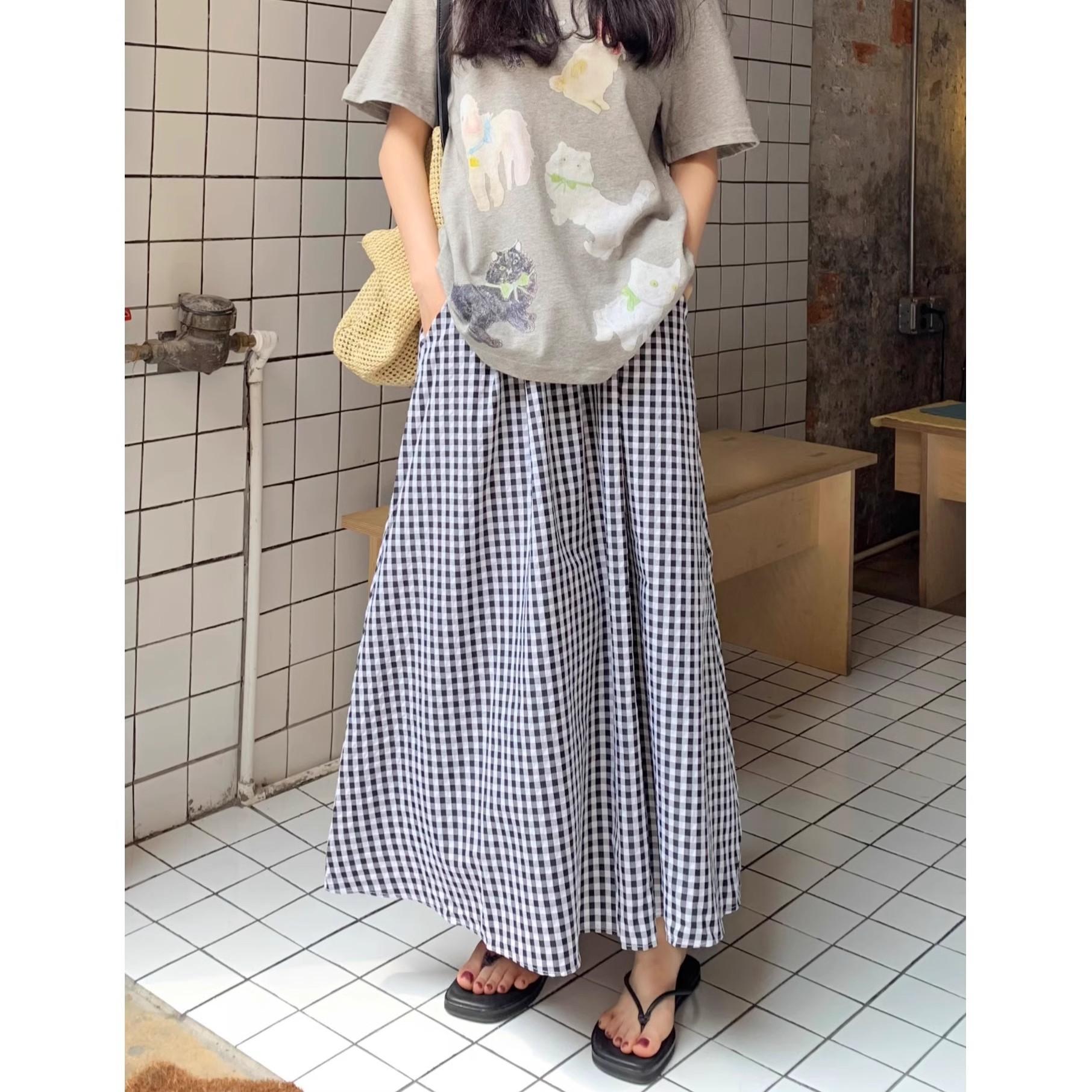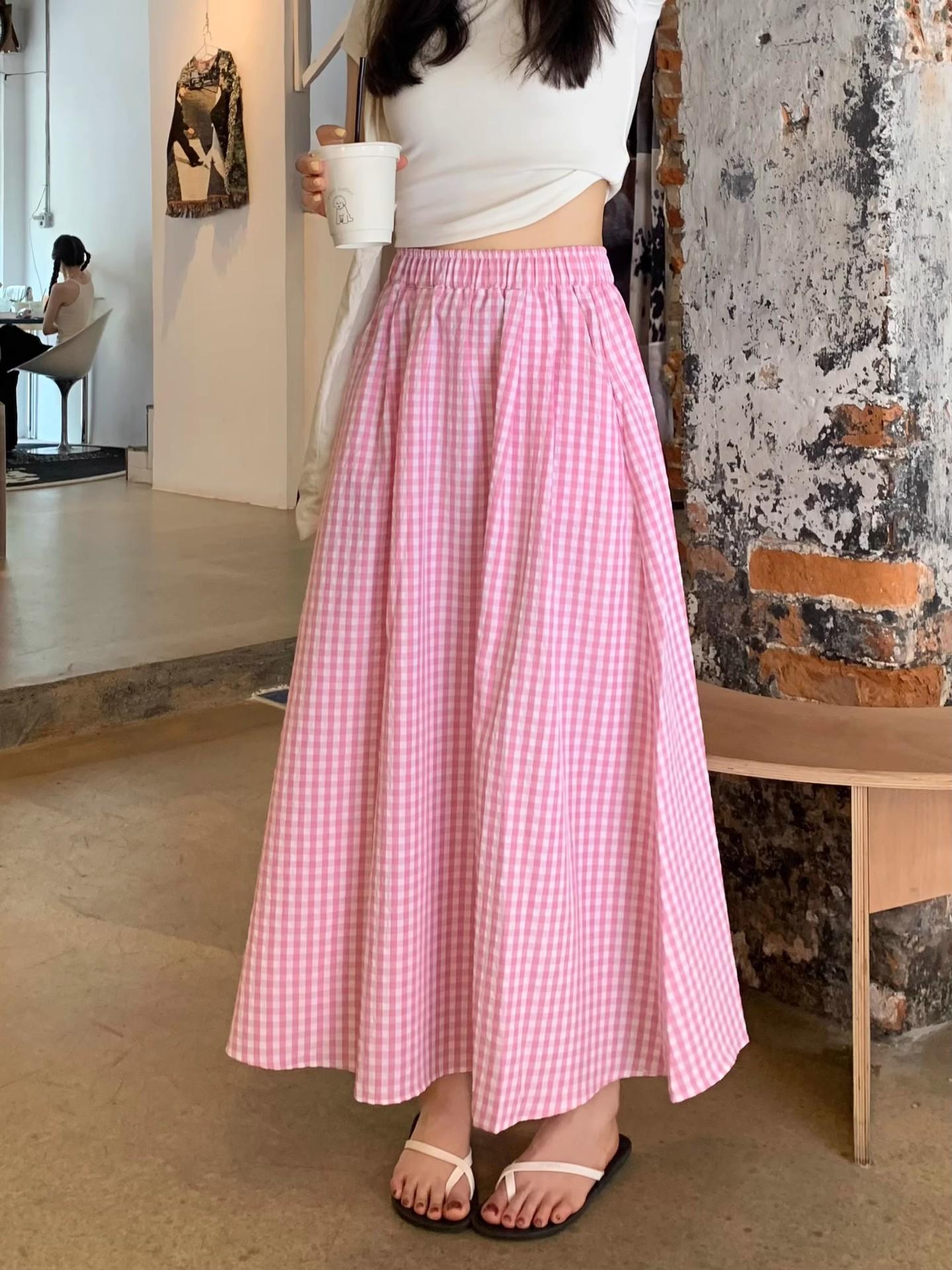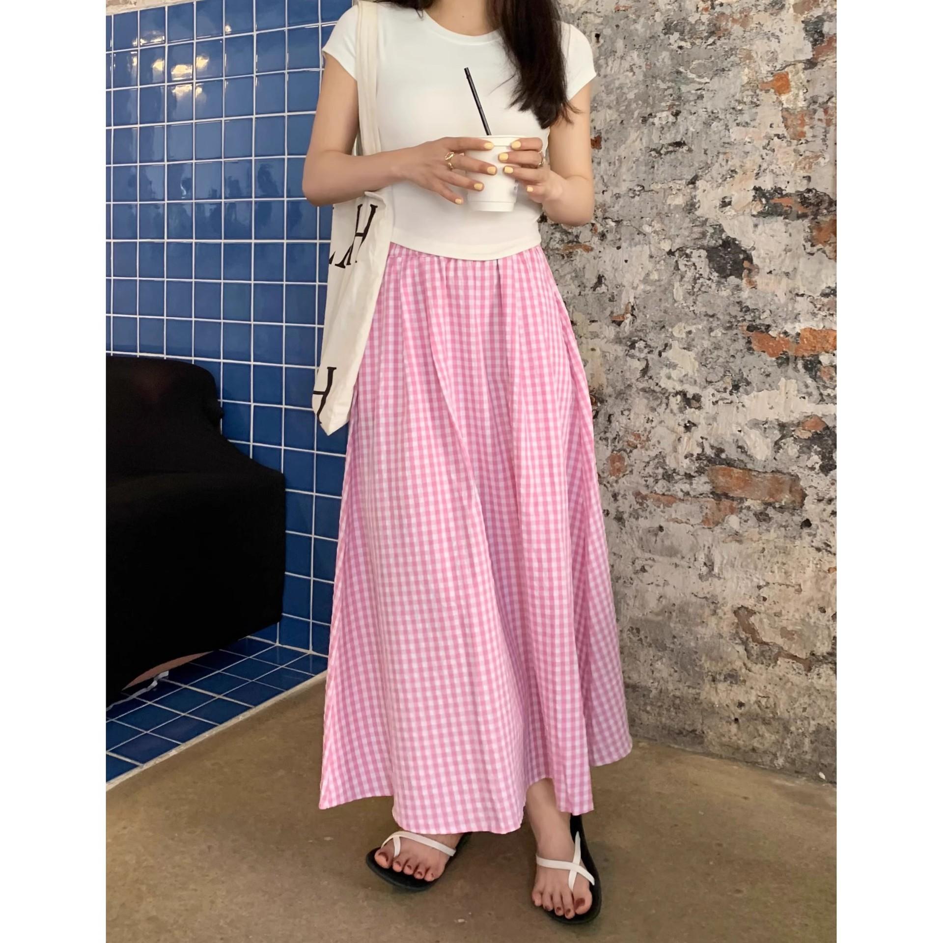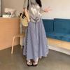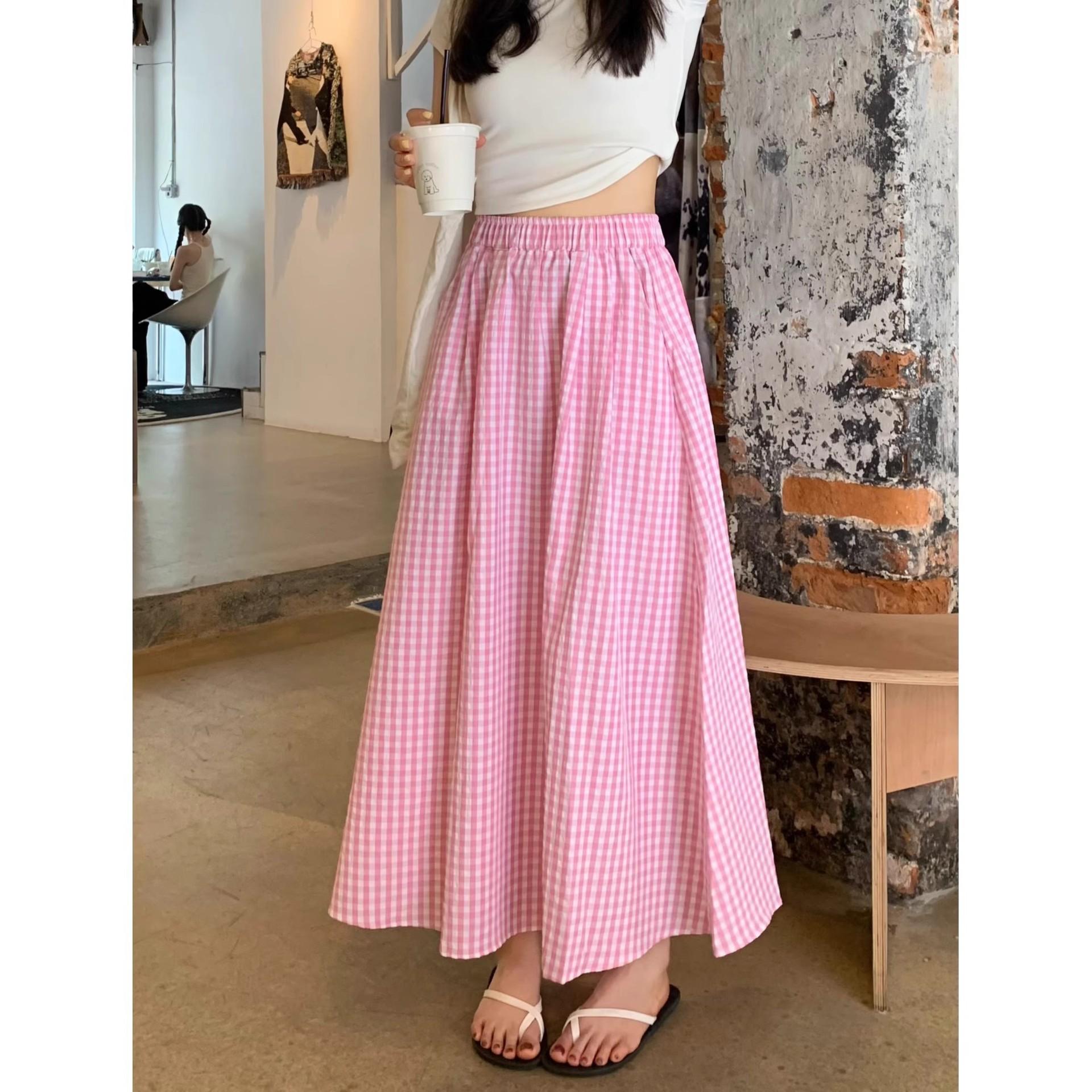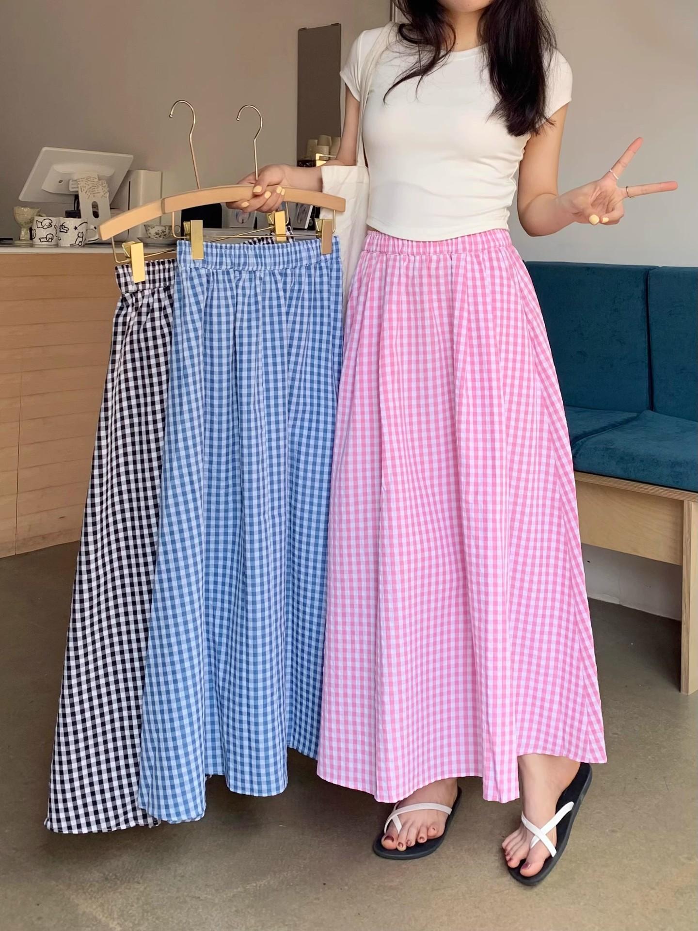 Falda Cuadros Azul Mujer Largo Medio 2025 Verano Nuevo Estilo Coreano Cintura Alta Adelgazante Corte A Cintura Elástica Falda Paraguas