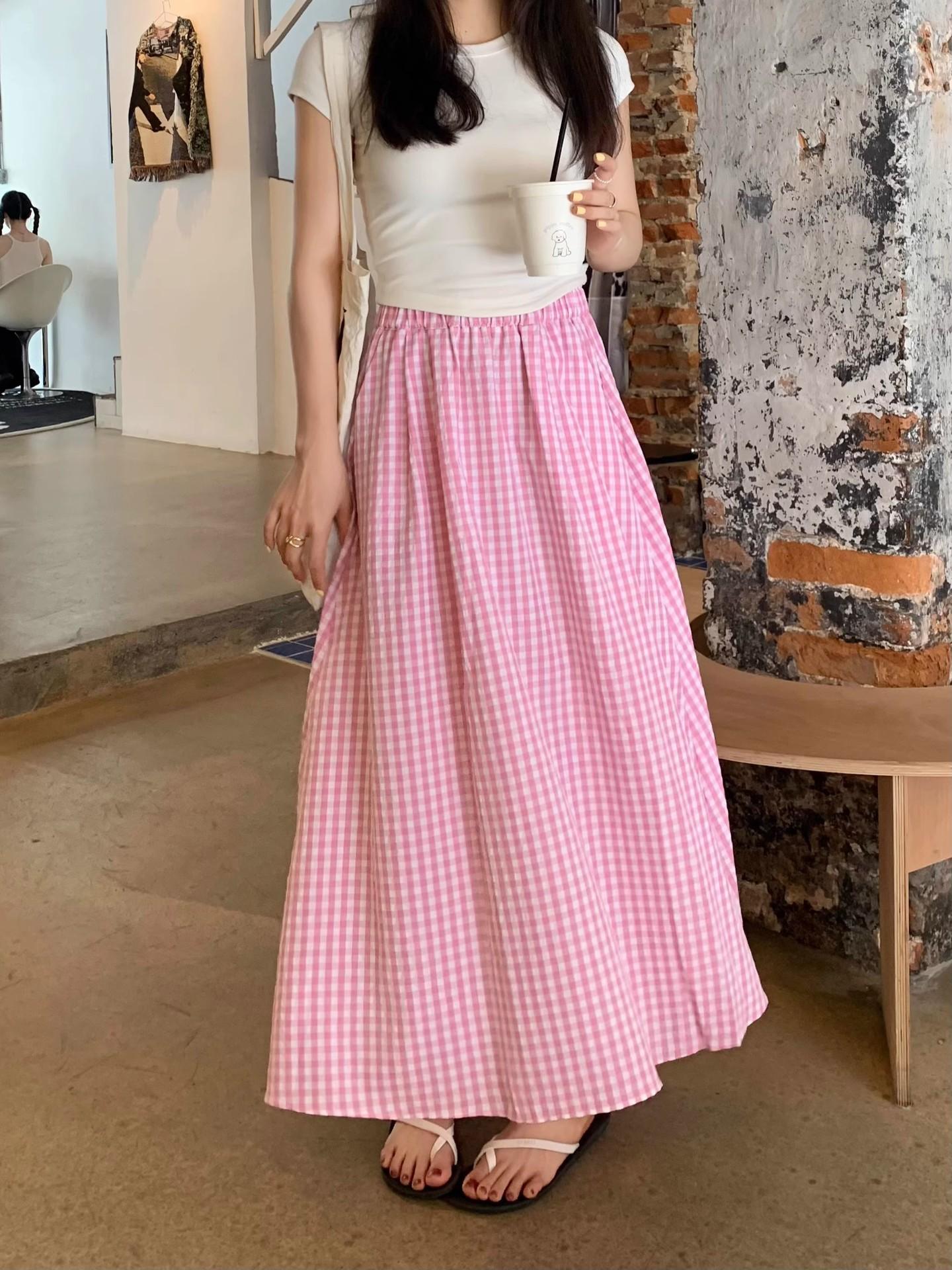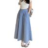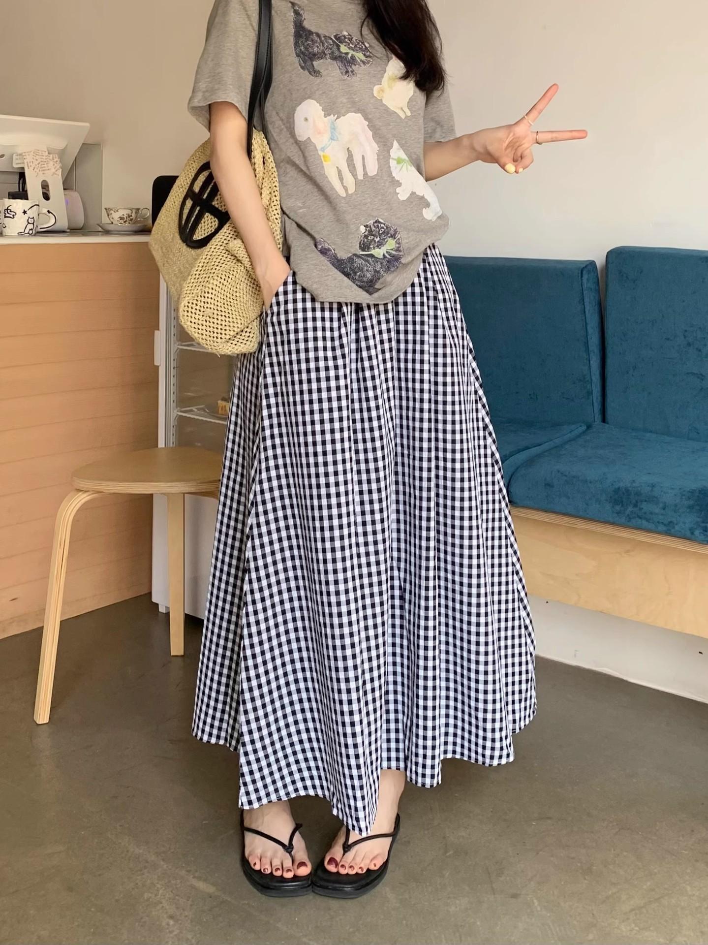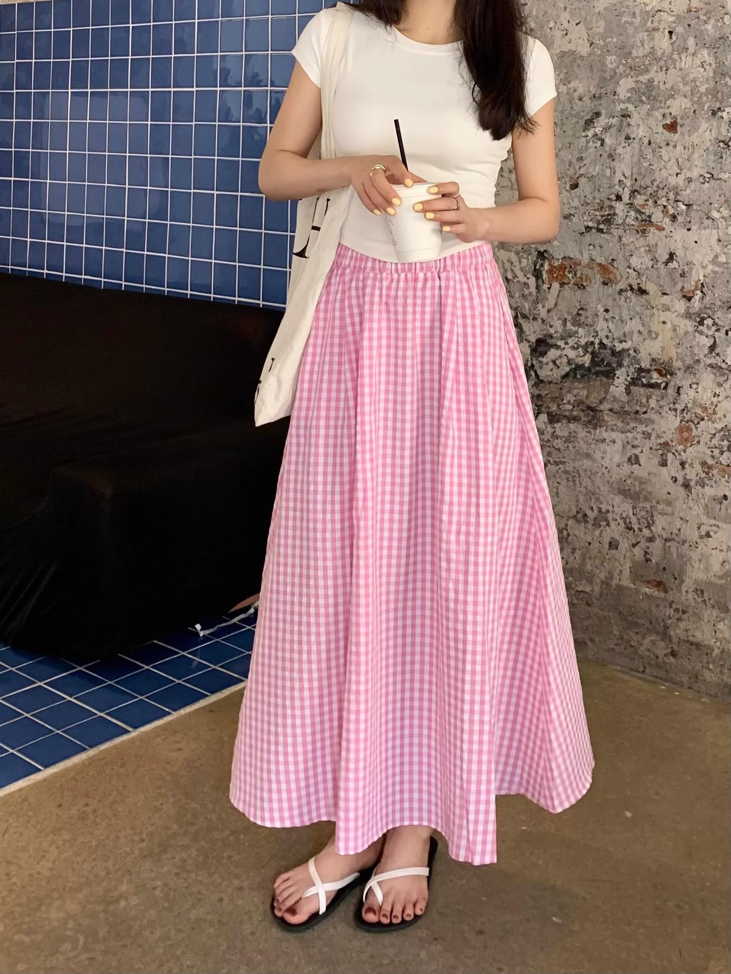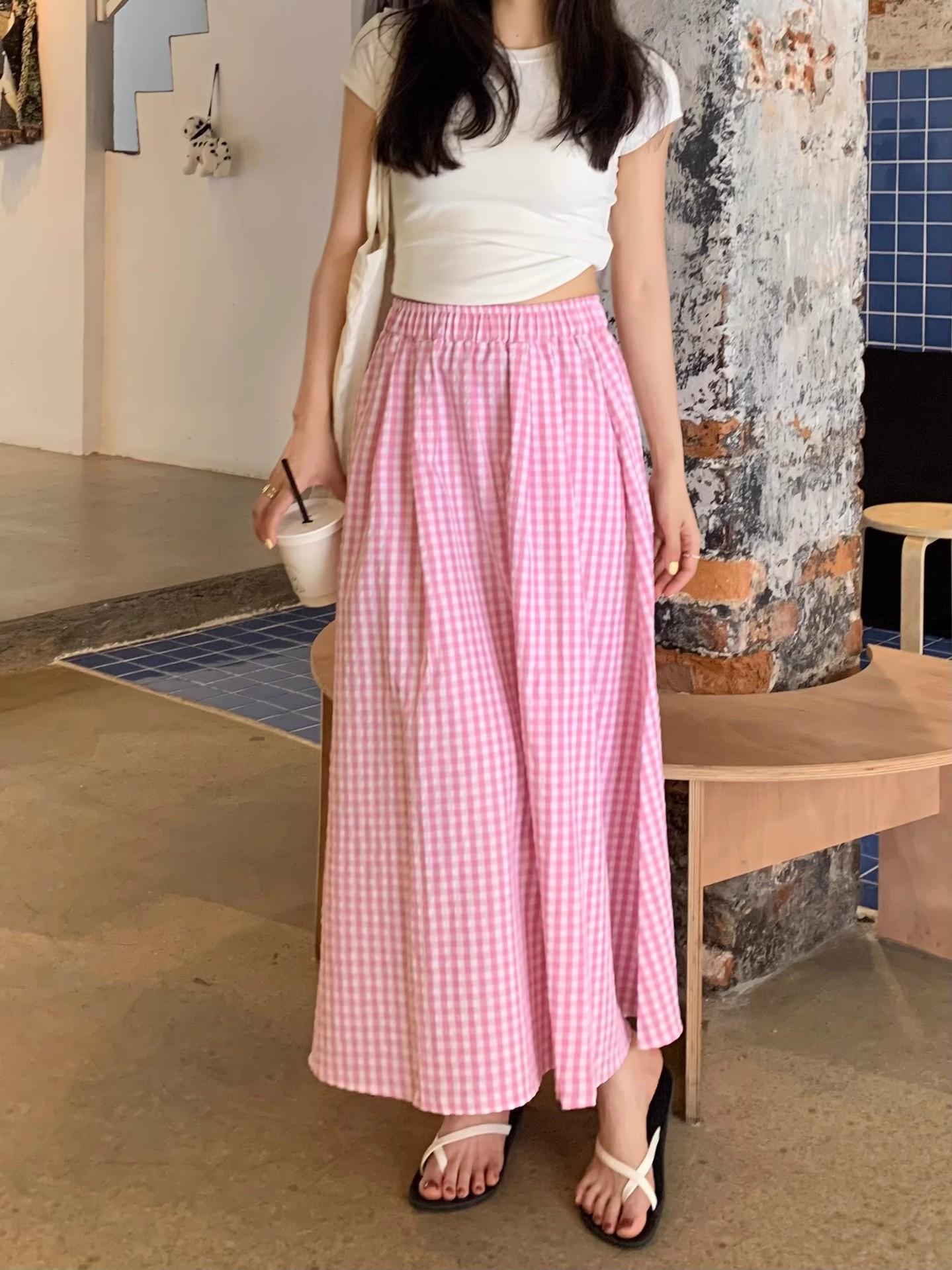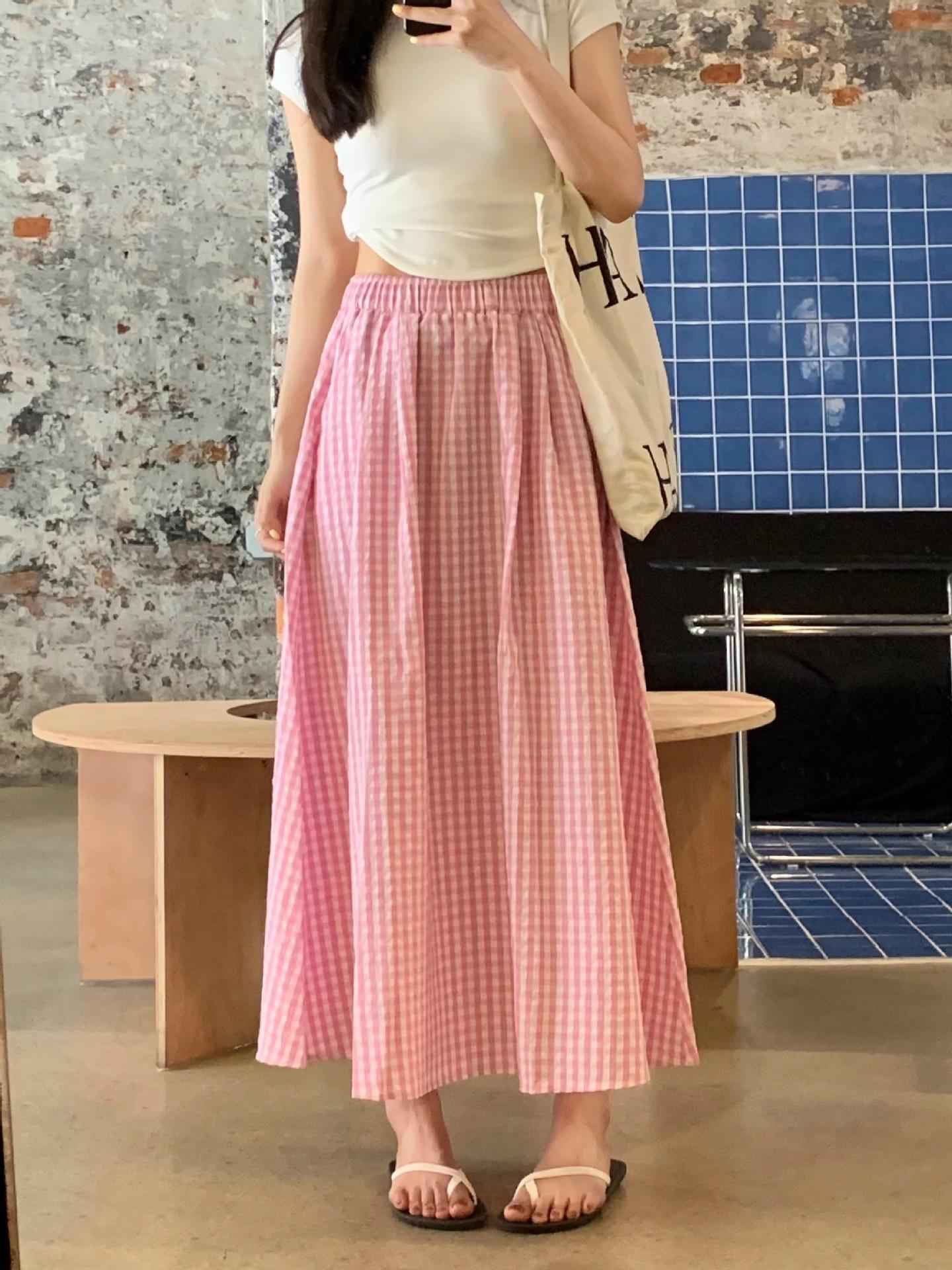 Falda Cuadros Azul Mujer Largo Medio 2025 Verano Nuevo Estilo Coreano Cintura Alta Adelgazante Corte A Cintura Elástica Falda Paraguas