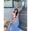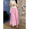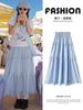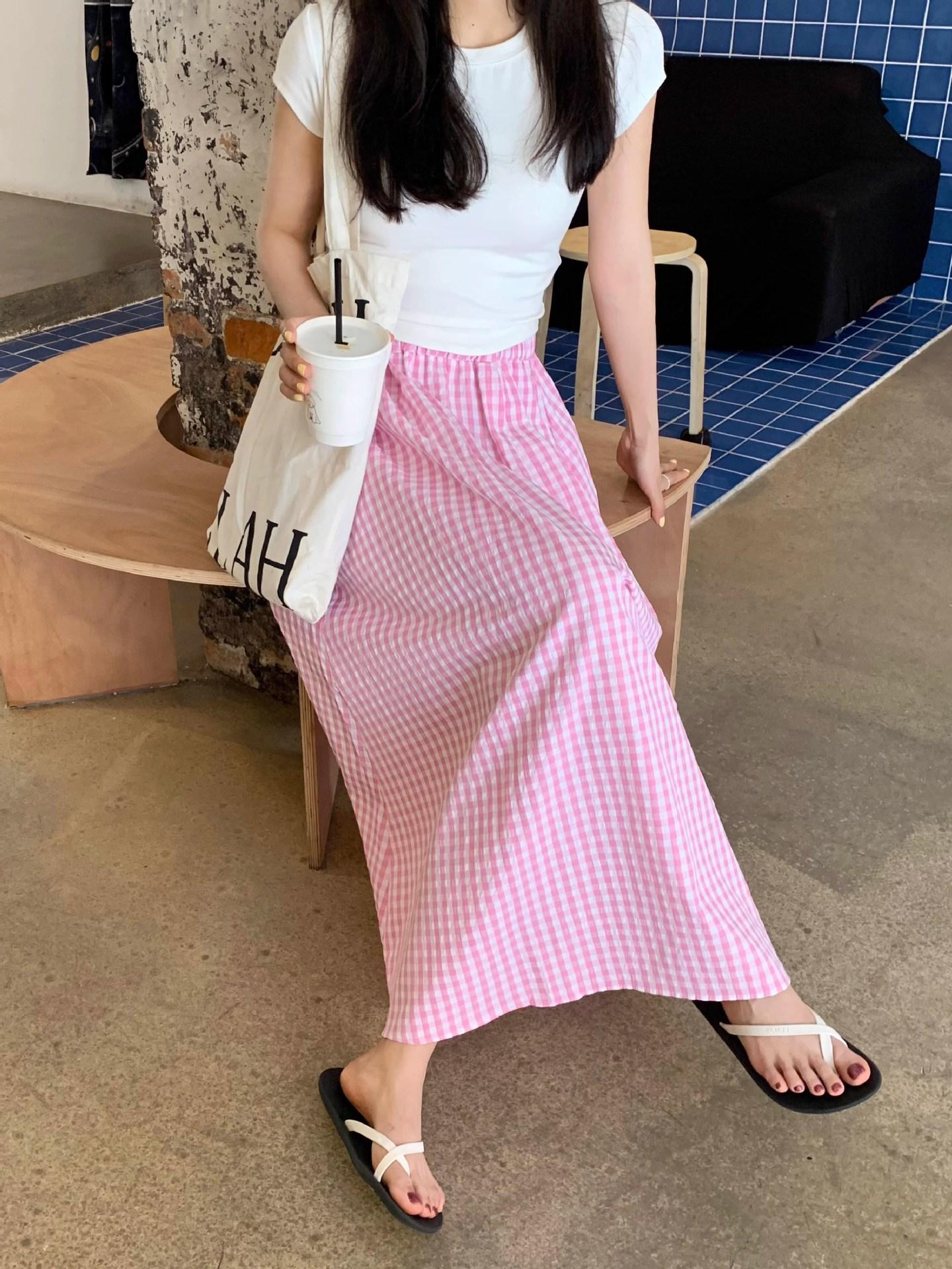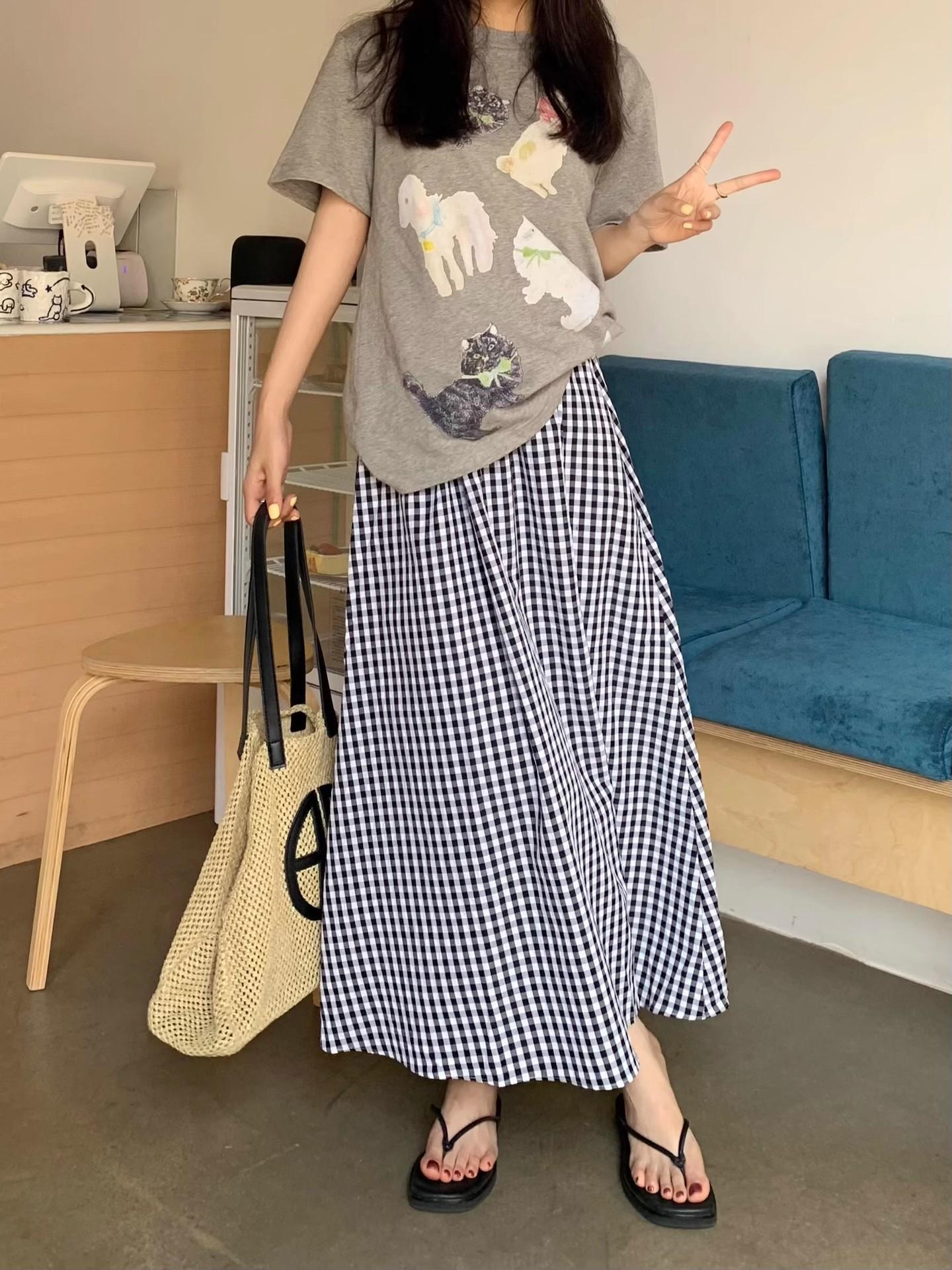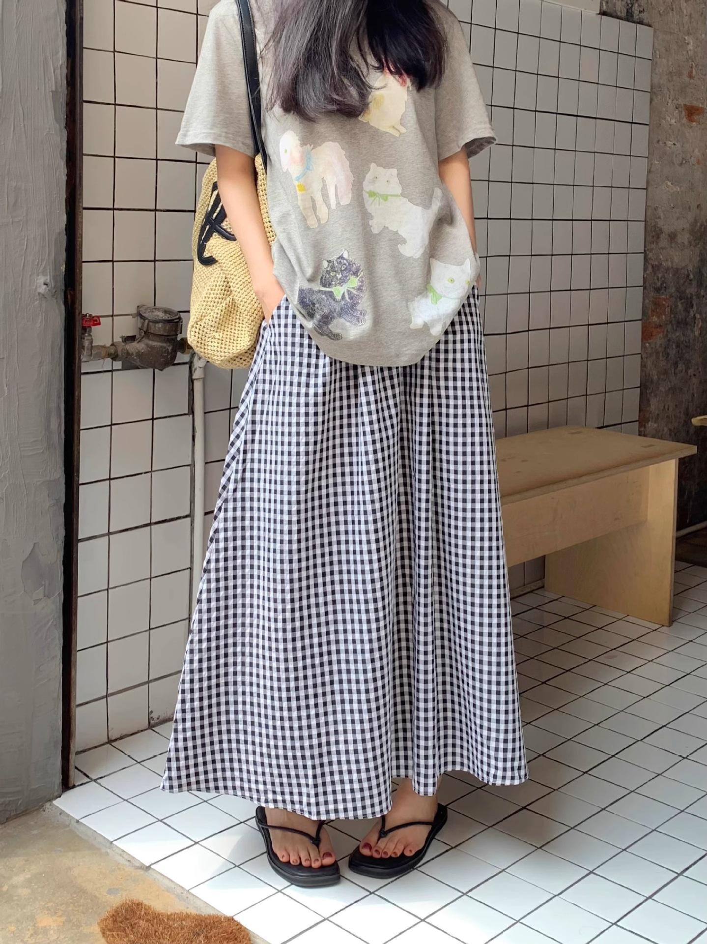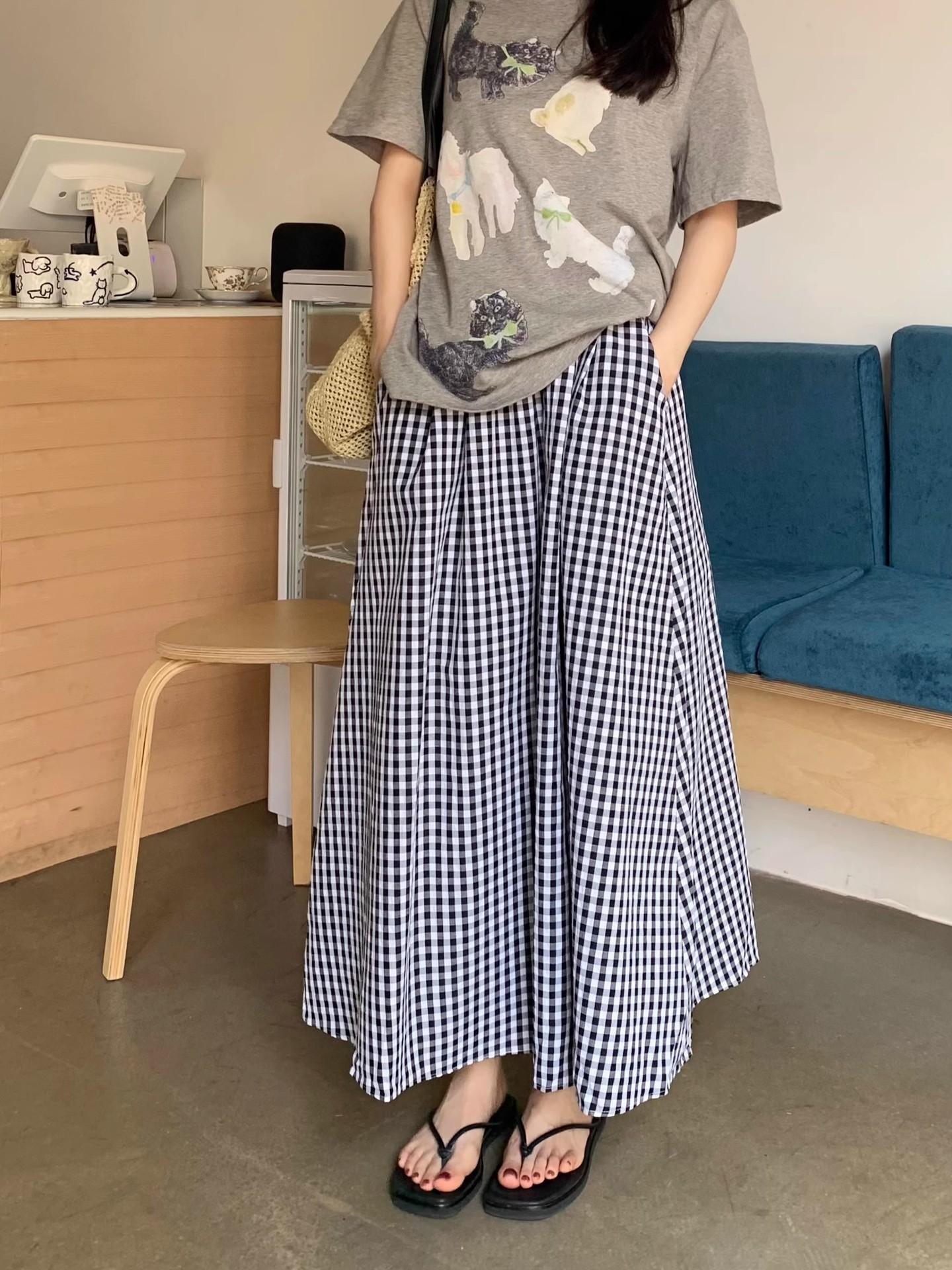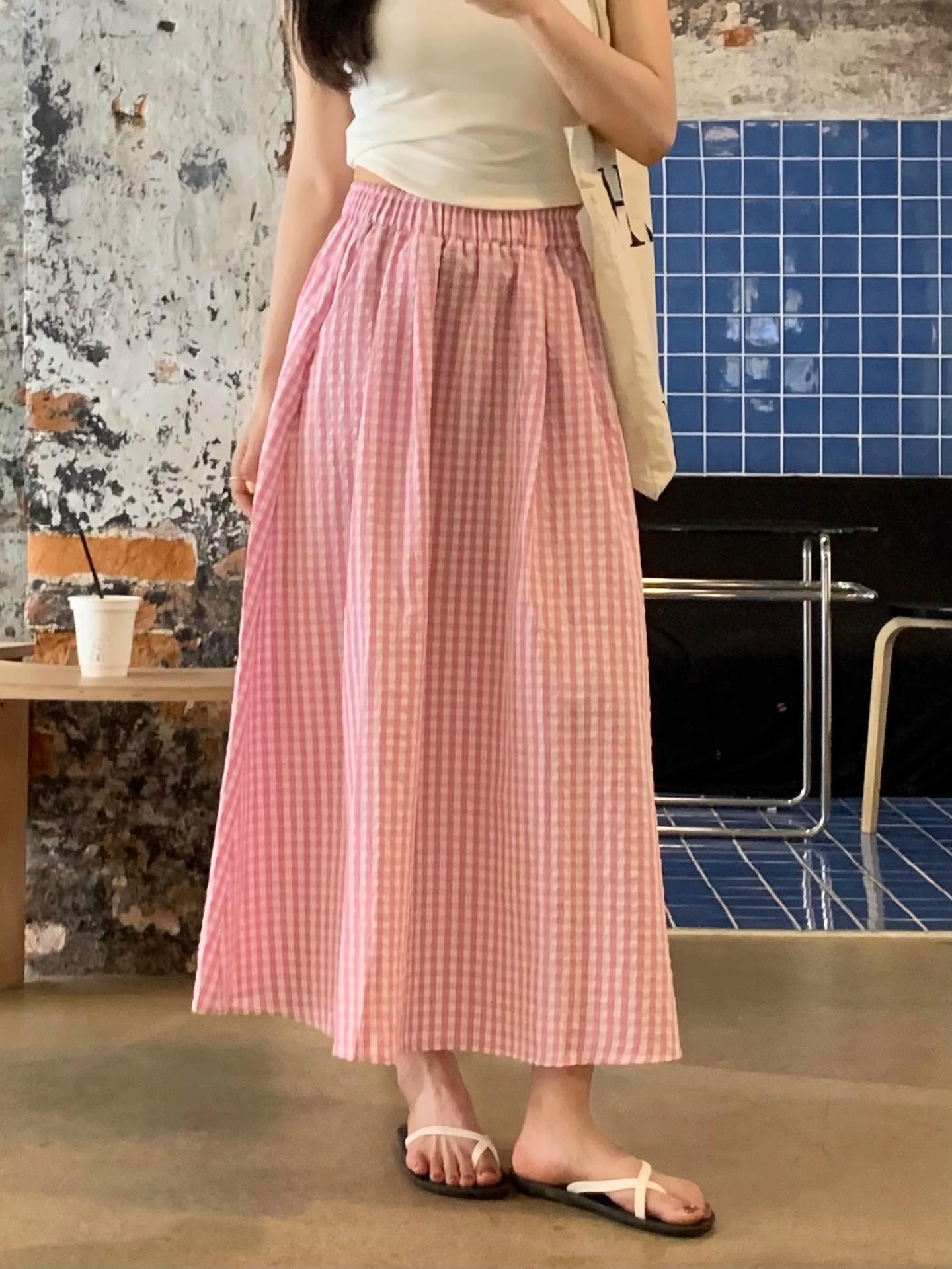 Falda Cuadros Azul Mujer Largo Medio 2025 Verano Nuevo Estilo Coreano Cintura Alta Adelgazante Corte A Cintura Elástica Falda Paraguas