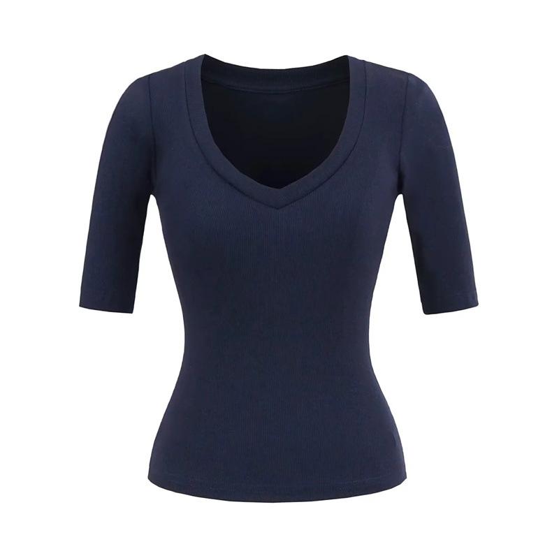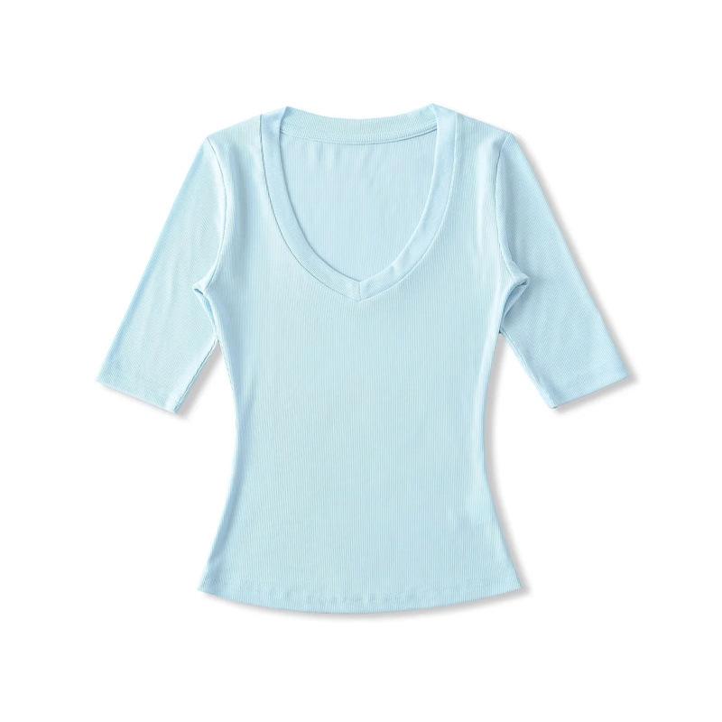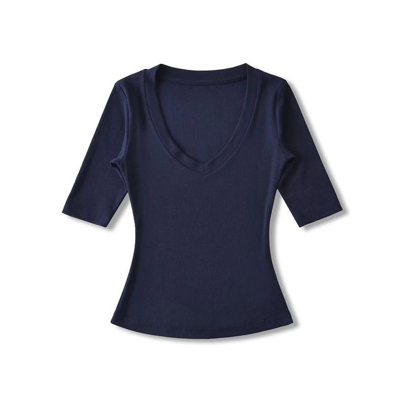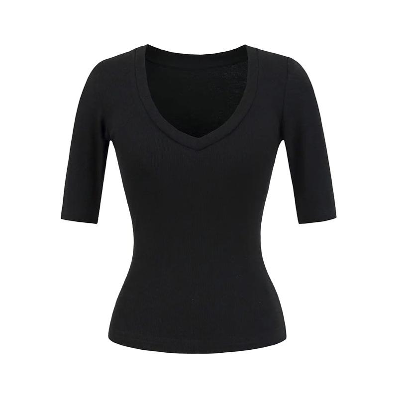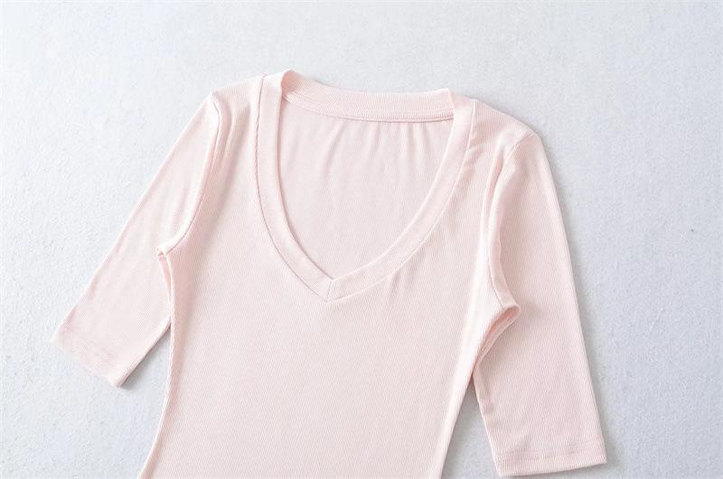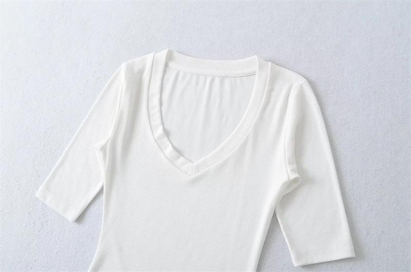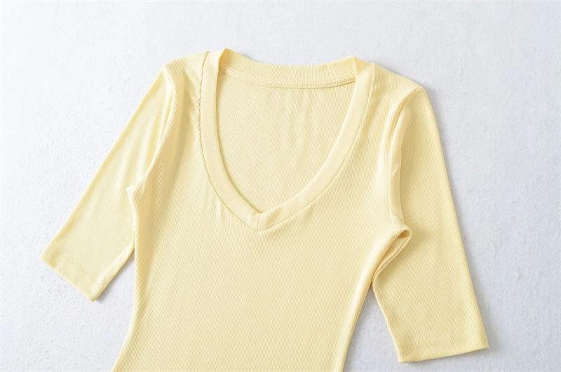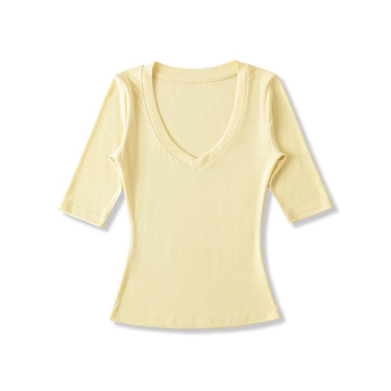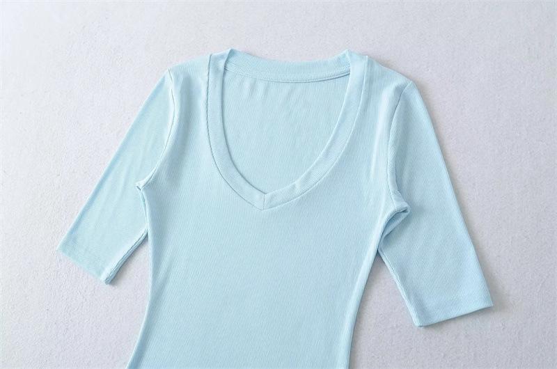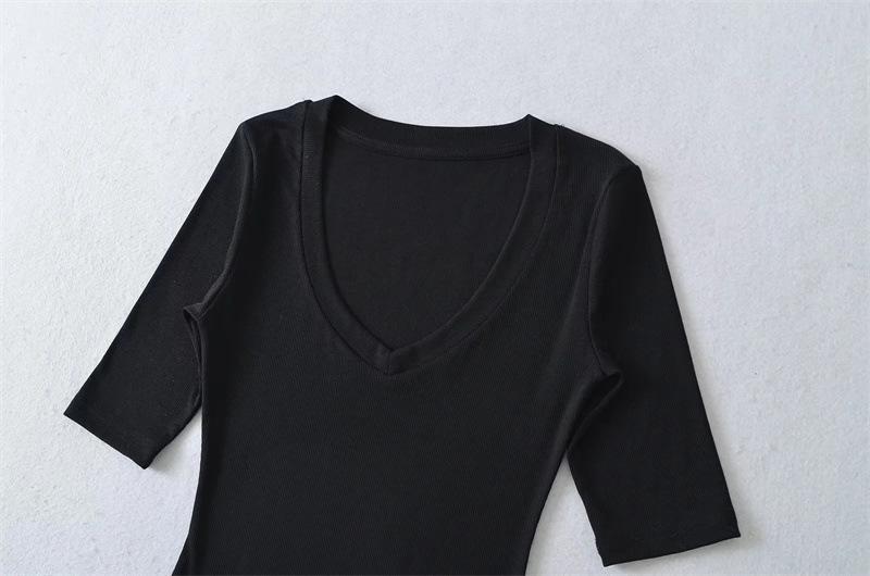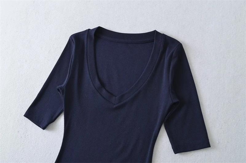 Verano Nuevo Estilo Europeo y Americano Sexy Cuello en V Manga Media Top Base Elástico Entallado Básico Simple Color Sólido Camiseta