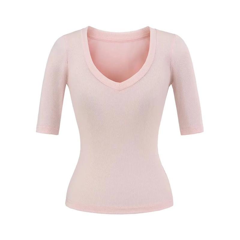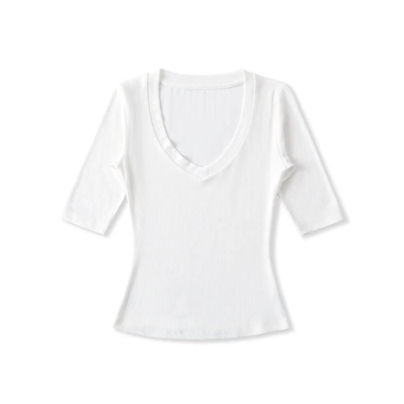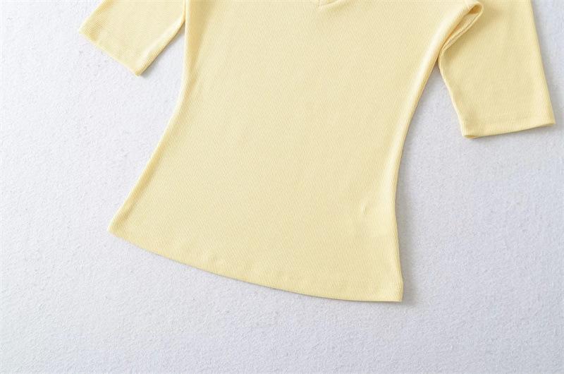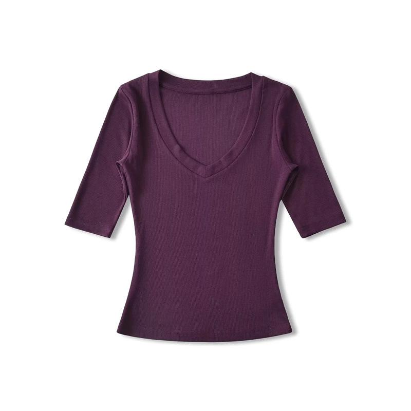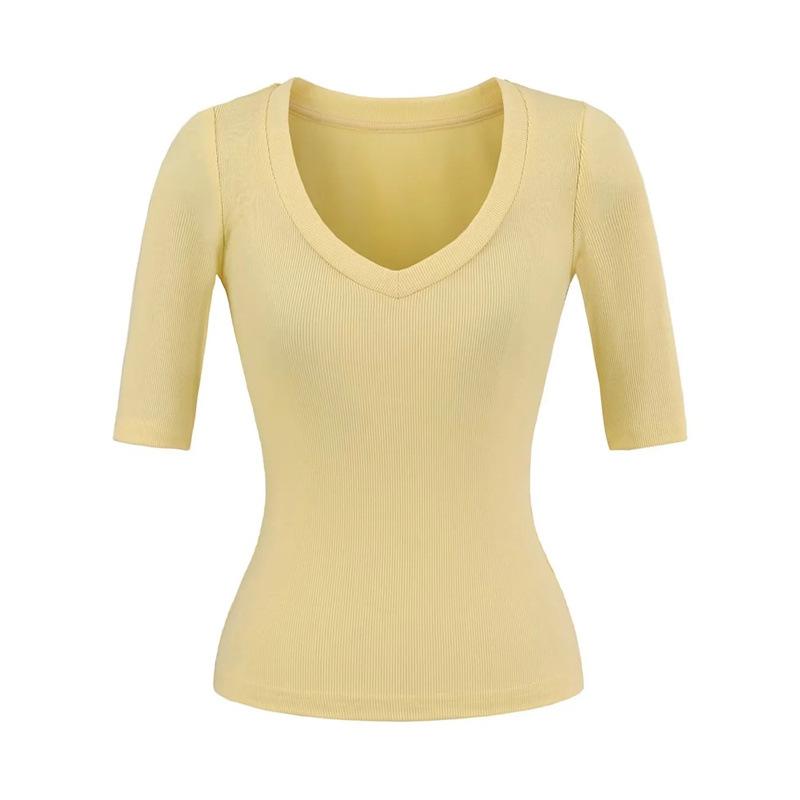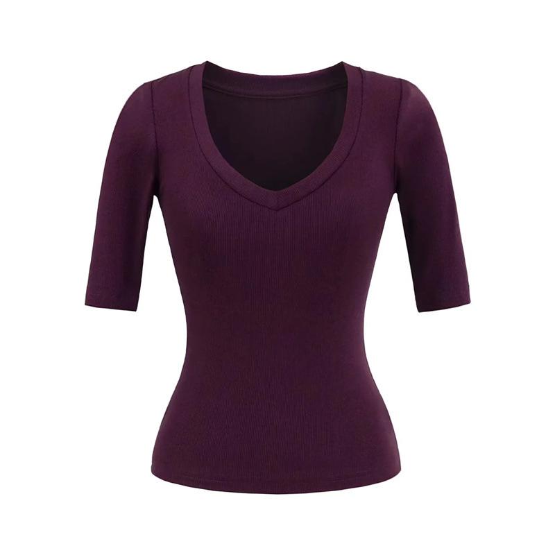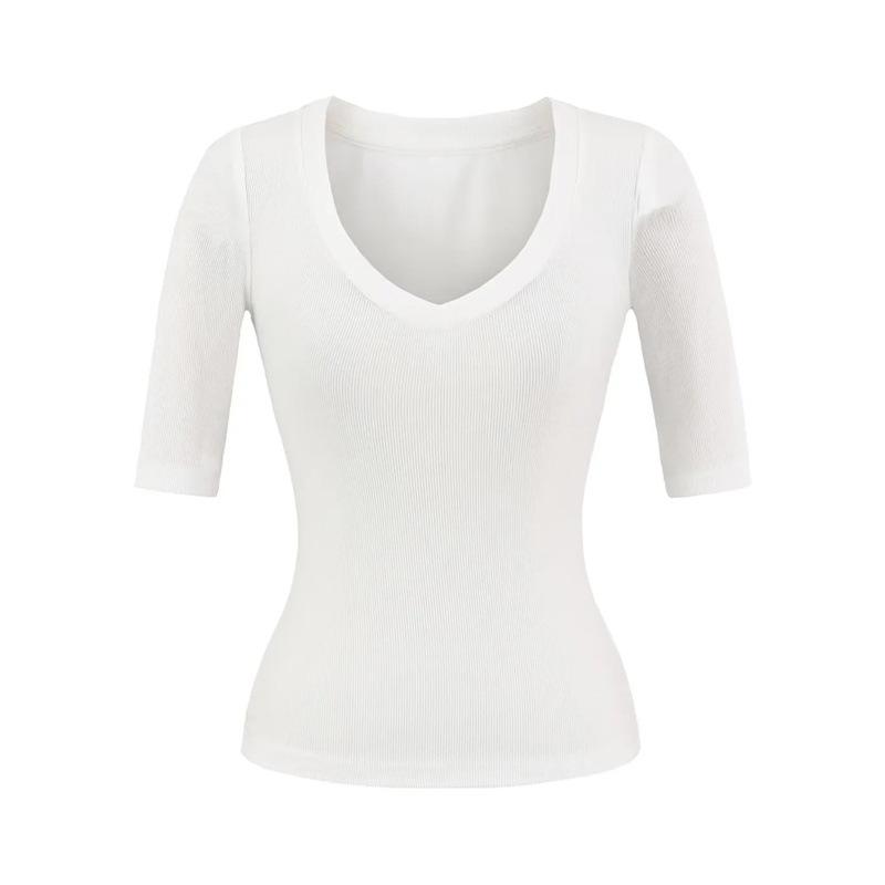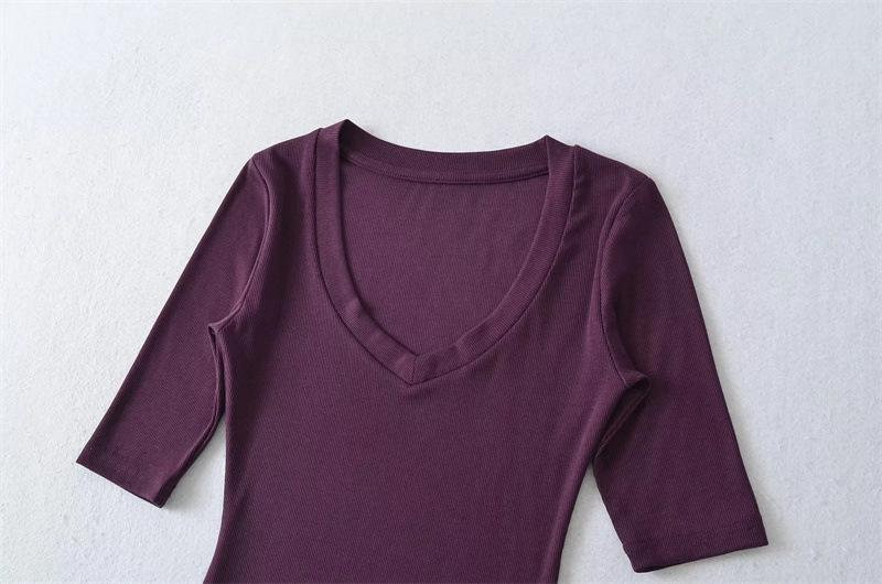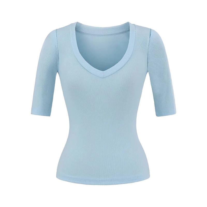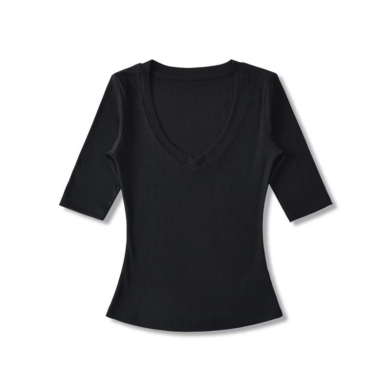 Verano Nuevo Estilo Europeo y Americano Sexy Cuello en V Manga Media Top Base Elástico Entallado Básico Simple Color Sólido Camiseta