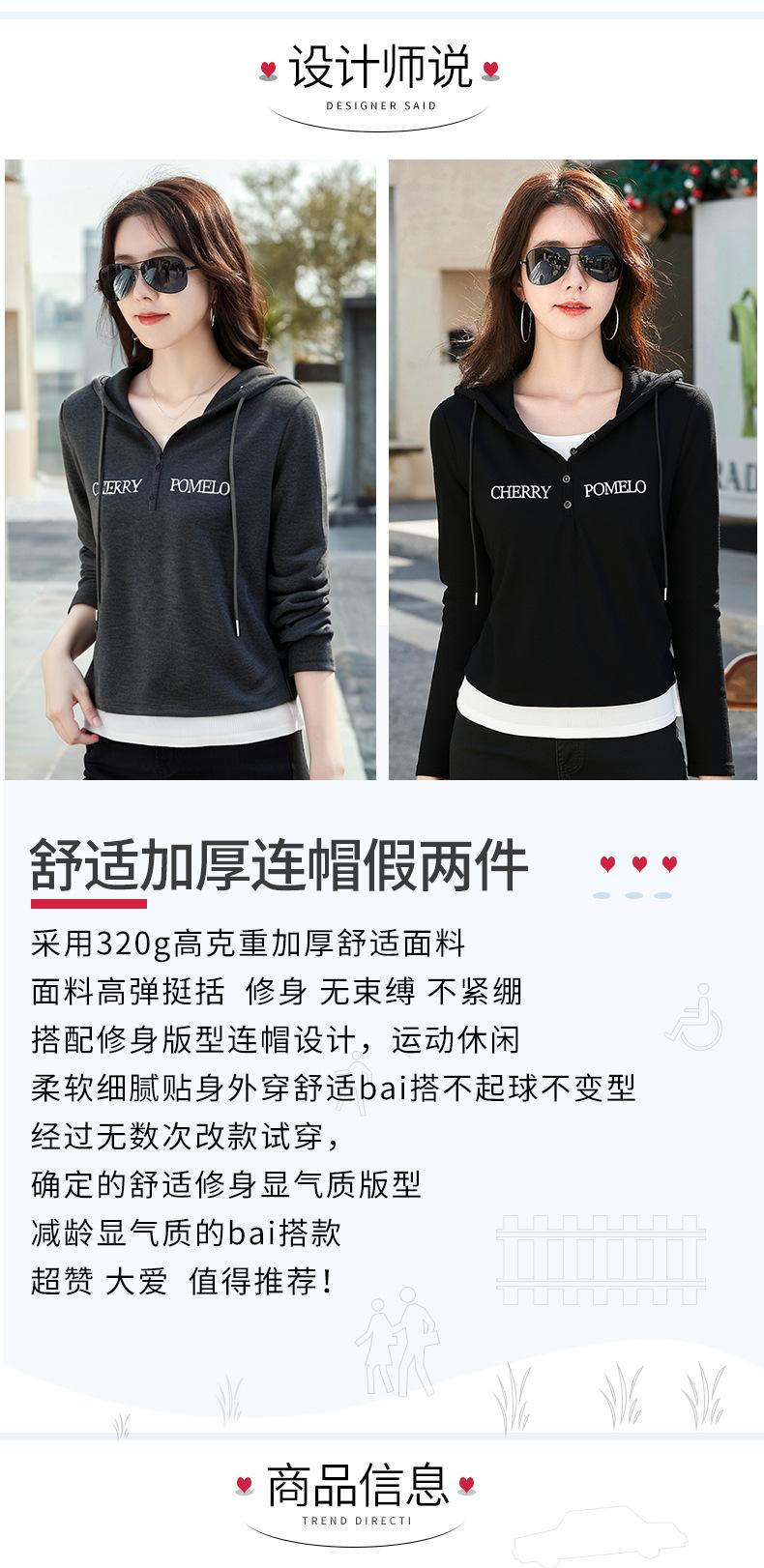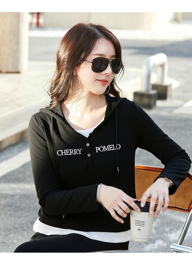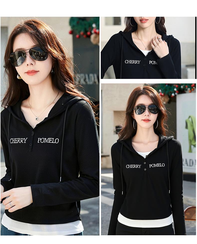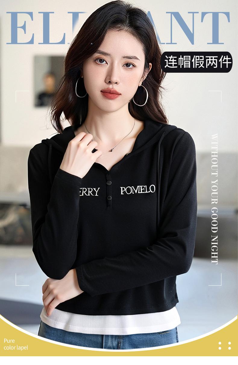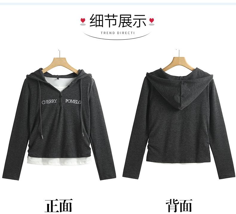 Sudadera con capucha bordada de manga larga para mujer, camiseta versátil, moderna y cómoda, de imitación de dos piezas, estilo coreano, temperamental, top para mujer 215-1