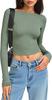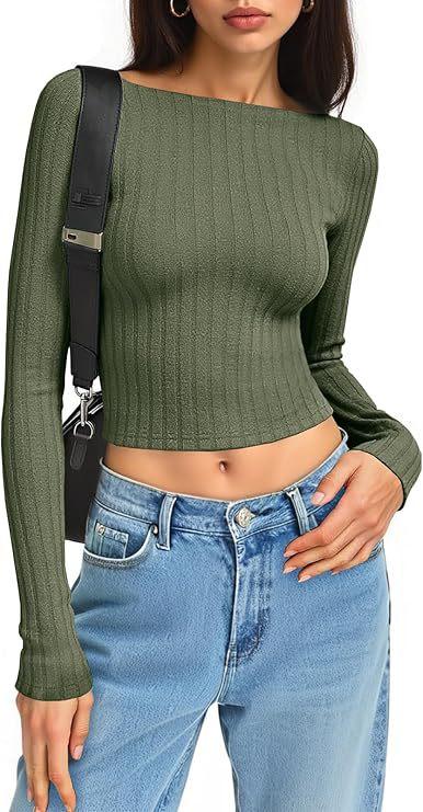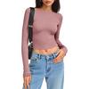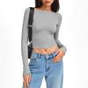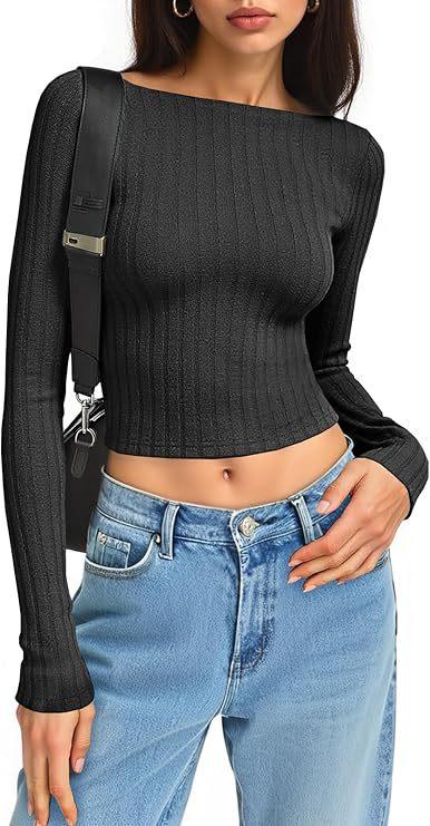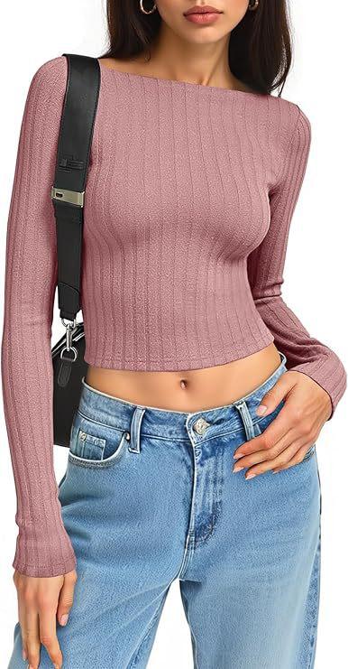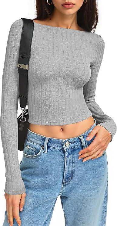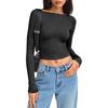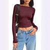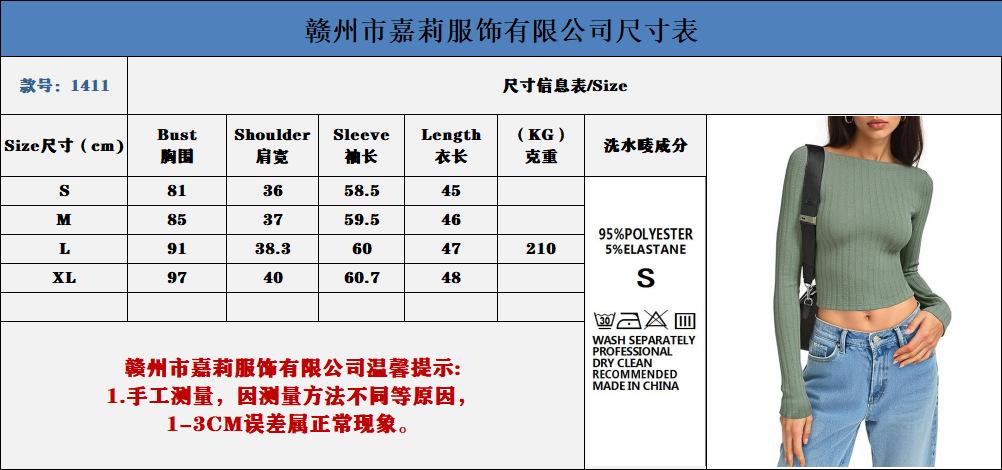 Europeo y Americano Transfronterizo 2025 Otoño/Invierno Nuevo Simple Versátil Acanalado Manga Larga Crop Top Cuello Barco Adelgazante Camiseta Mujer