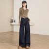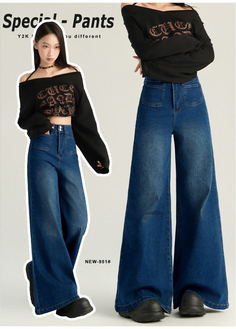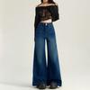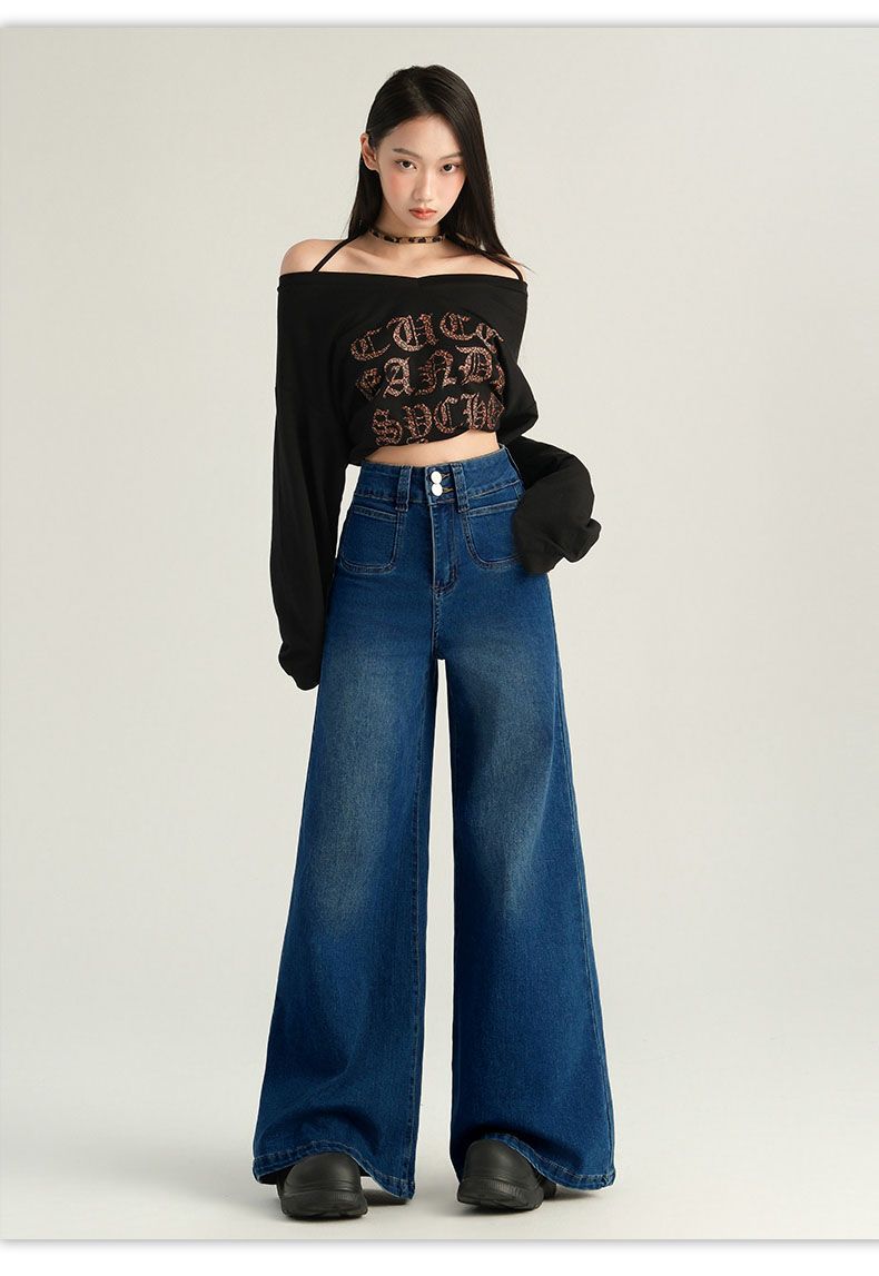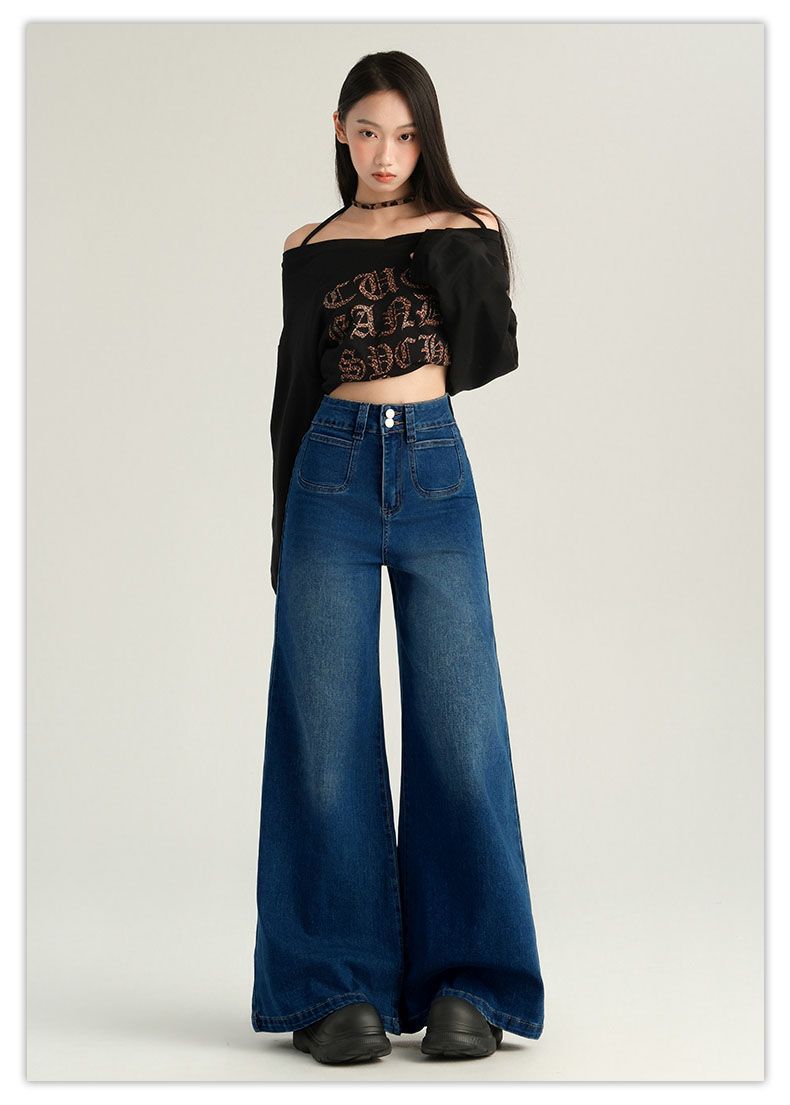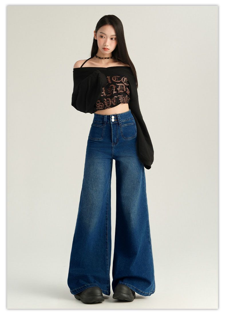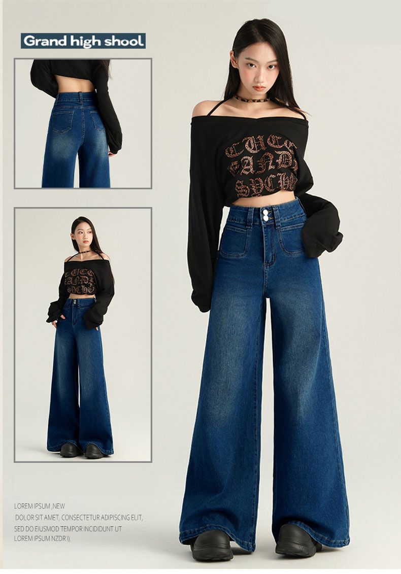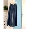 Pantalones Sueltos de Pierna Ancha con Dos Botones, Diseño Estilo Americano 2025, Jeans Altos y Ajustados, Elásticos para Mujer Azul Retro