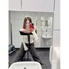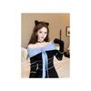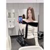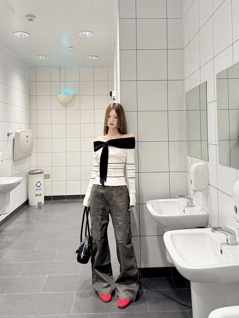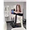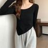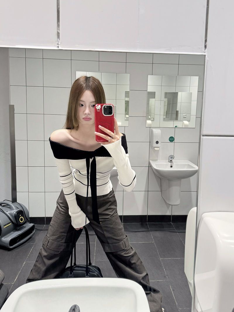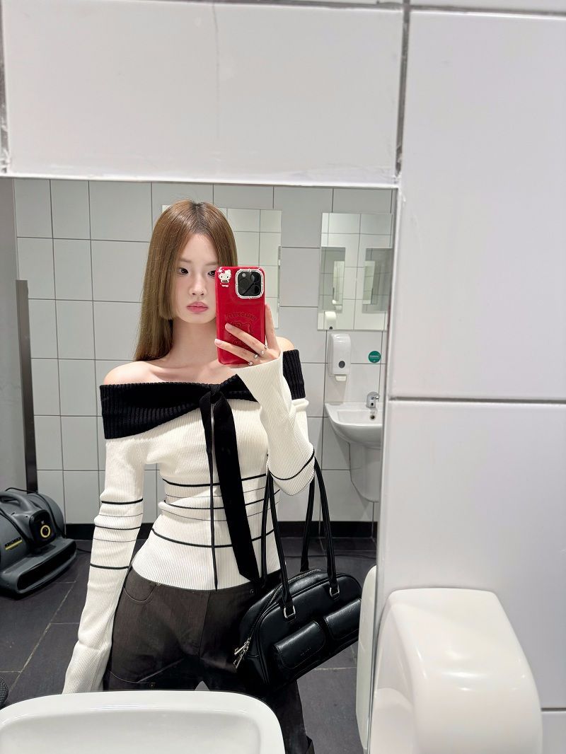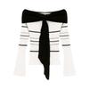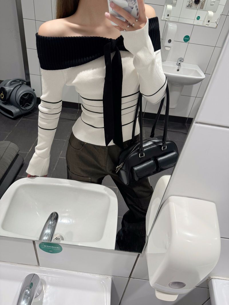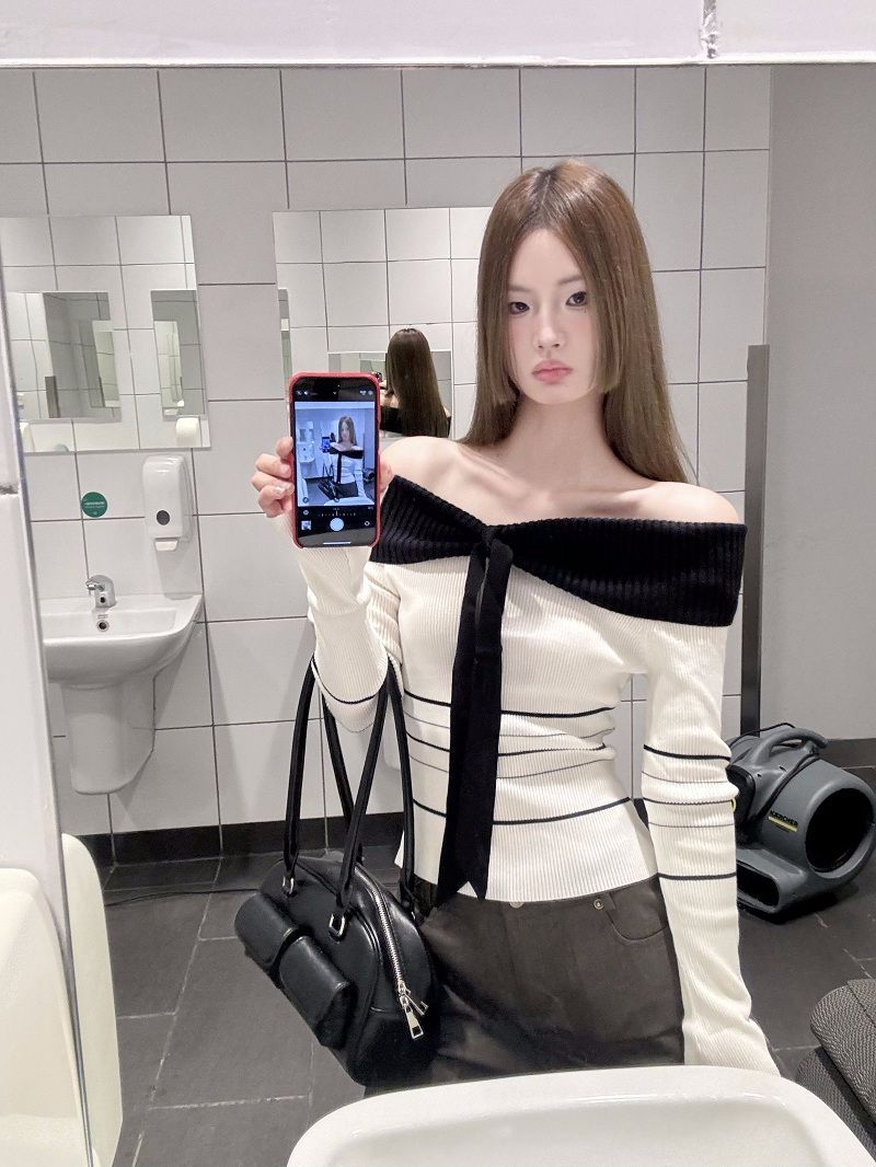 Sentido del Diseño Nicho Contraste de Color Rayado Camiseta Tejida de Manga Larga con Hombros Descubiertos Principios de Otoño Spice Girls Sexy Ajustada Top de Hombro
