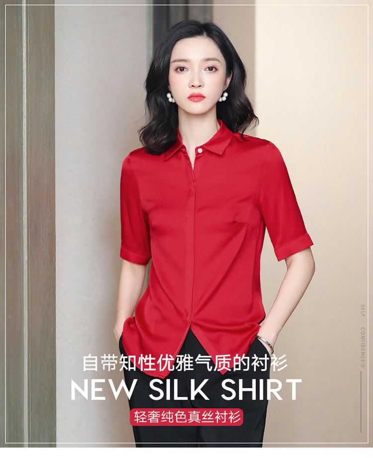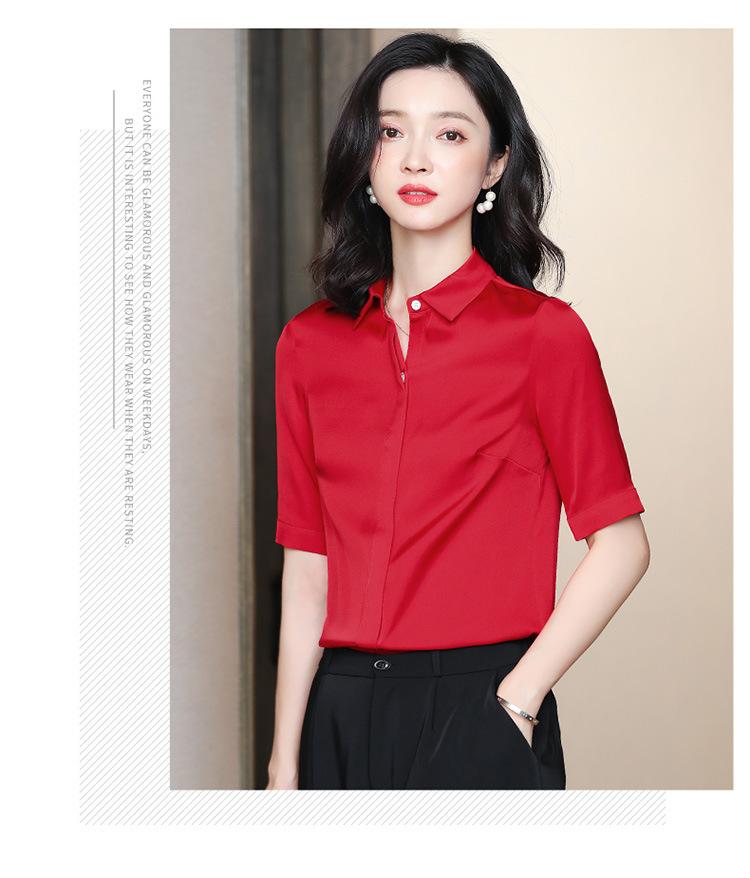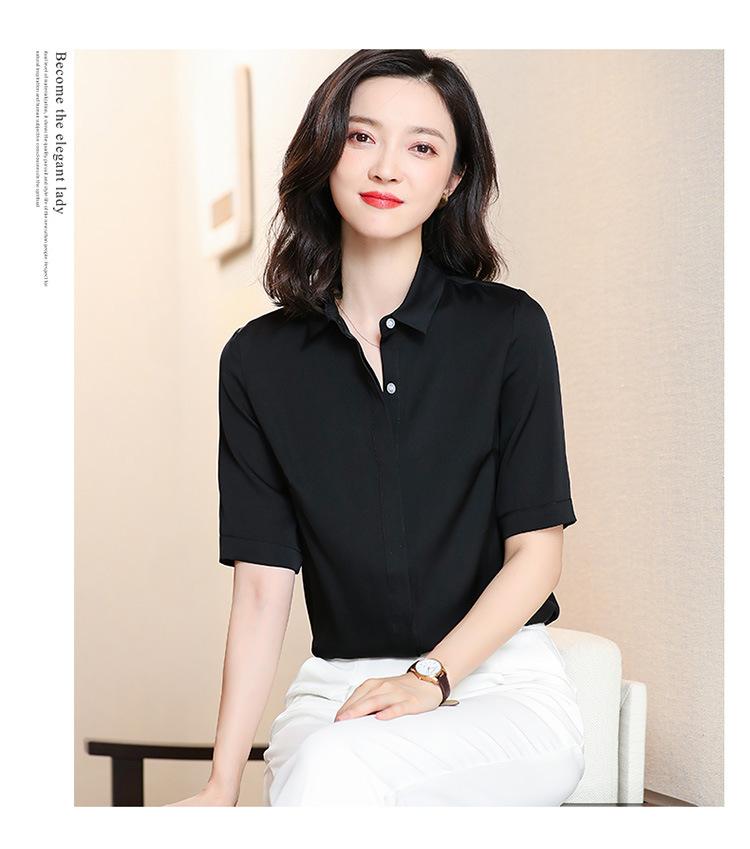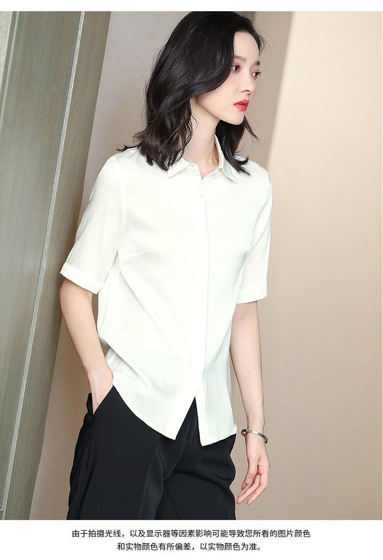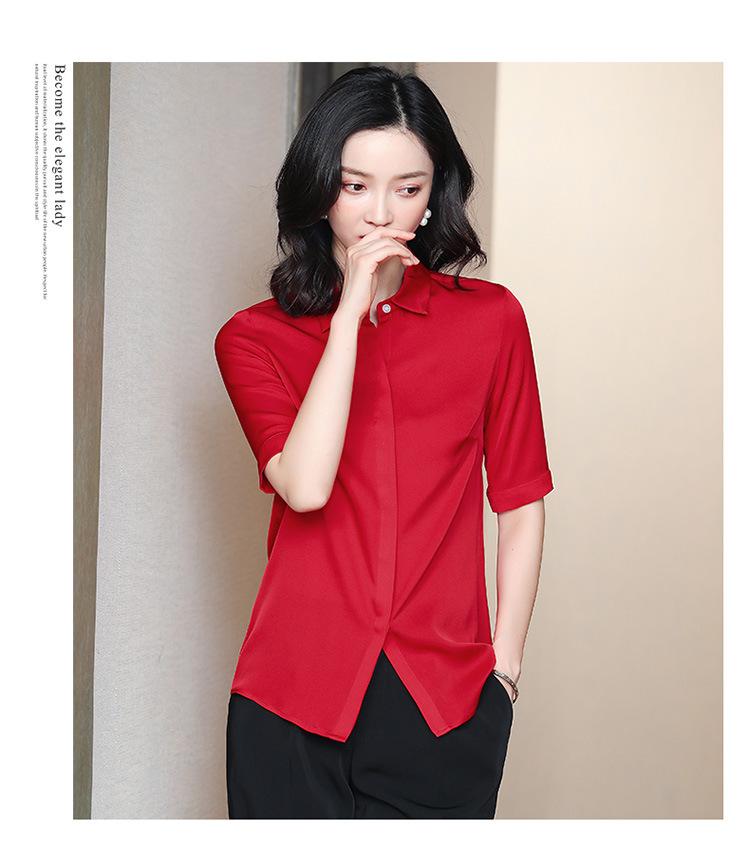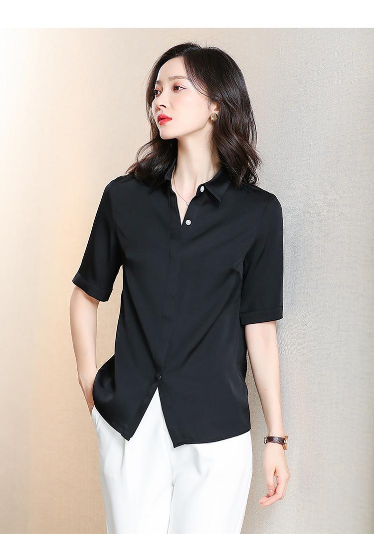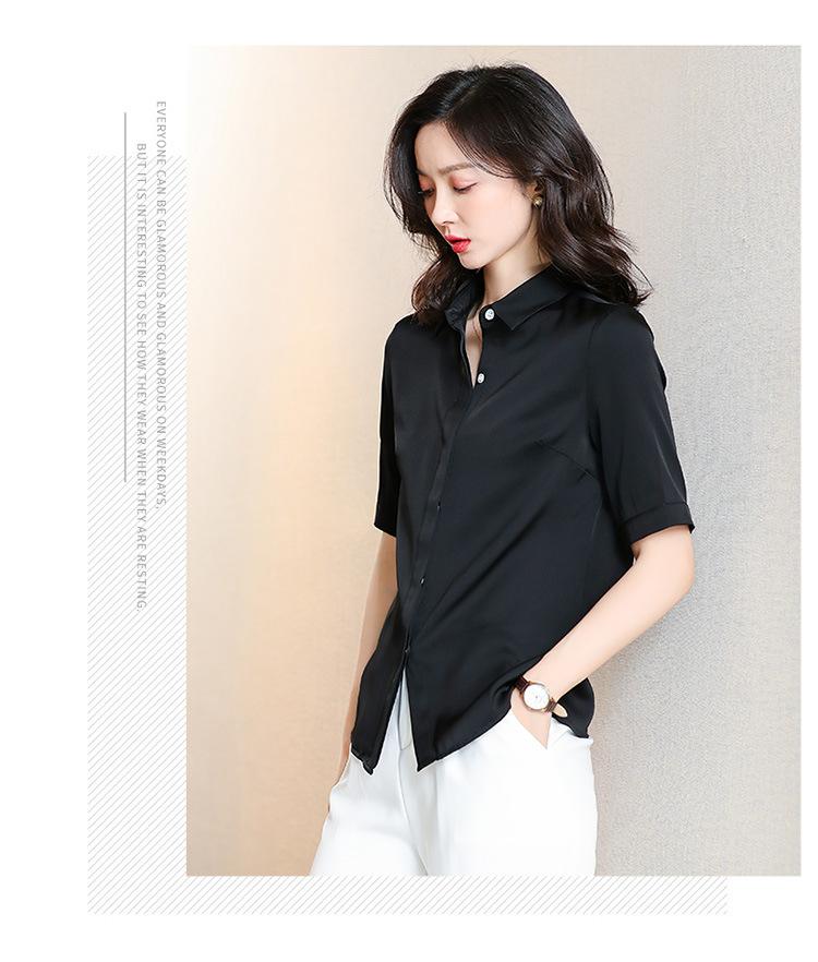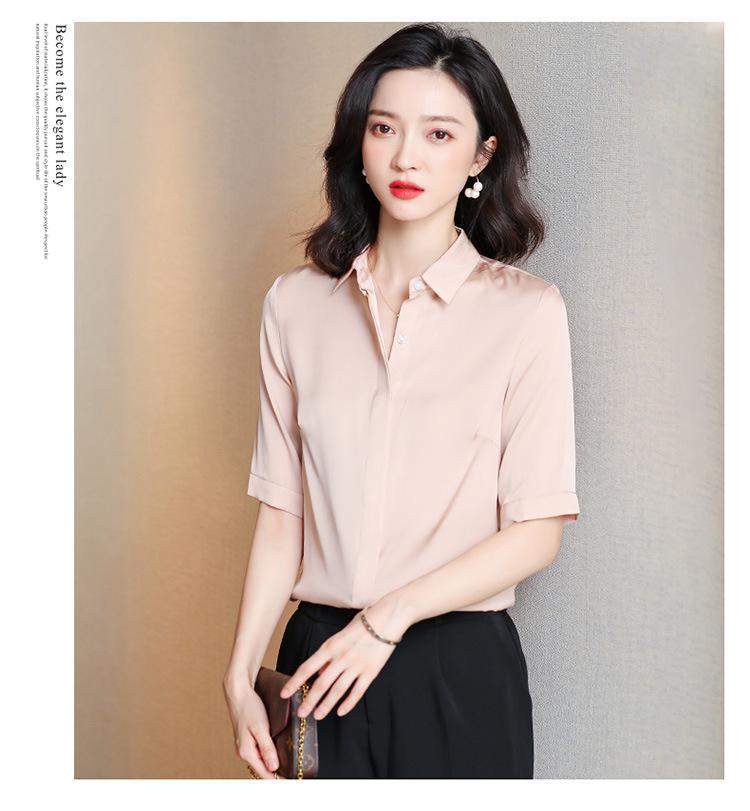 Camisa de Seda de Manga Corta Estilo Verano para Mujer, Elegante Color Sólido de Botonadura Sencilla, Stock Listo Camisa de Seda para Mujer