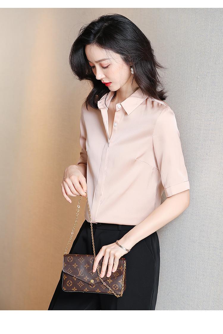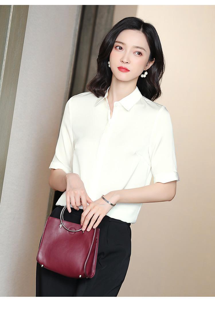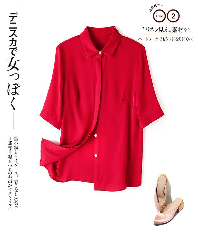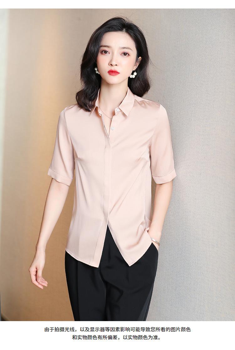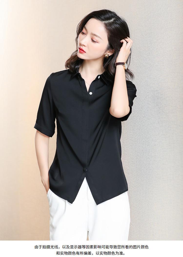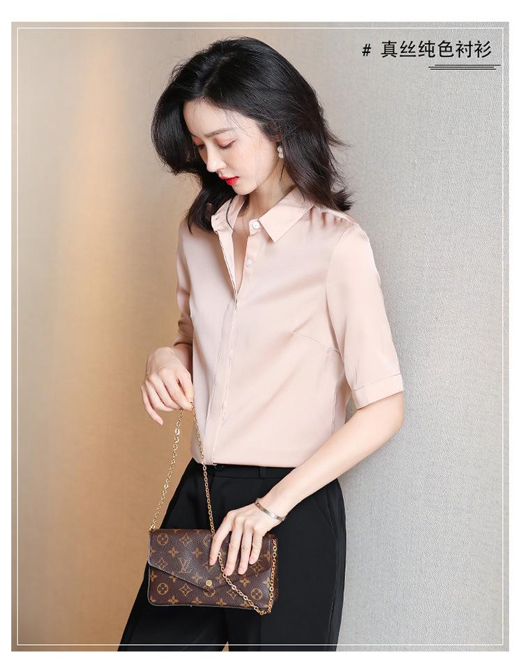 Camisa de Seda de Manga Corta Estilo Verano para Mujer, Elegante Color Sólido de Botonadura Sencilla, Stock Listo Camisa de Seda para Mujer