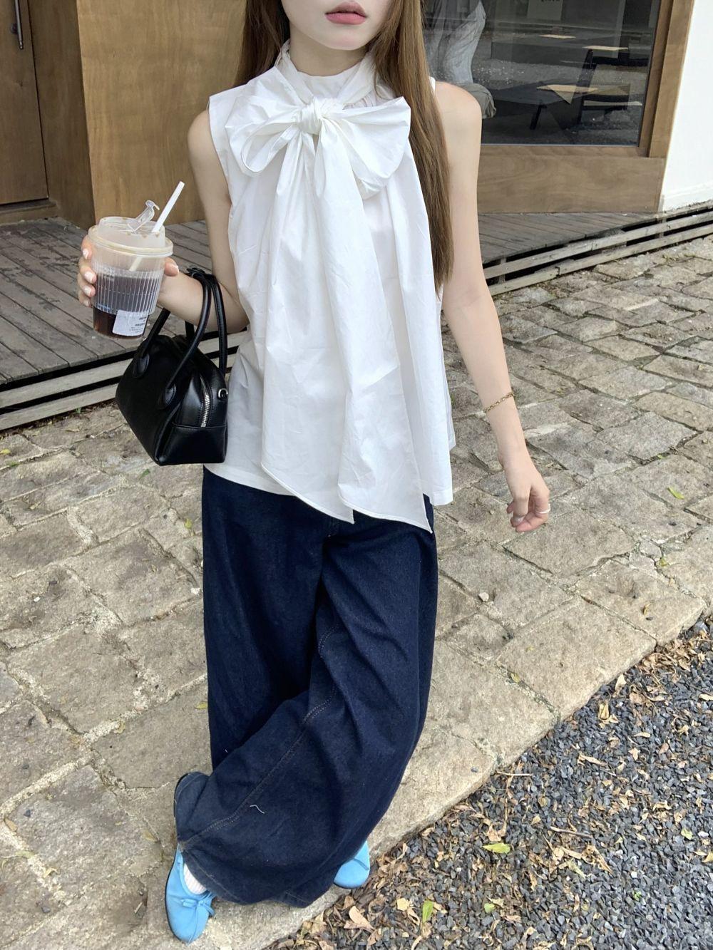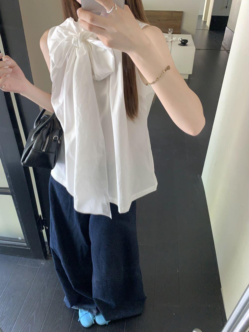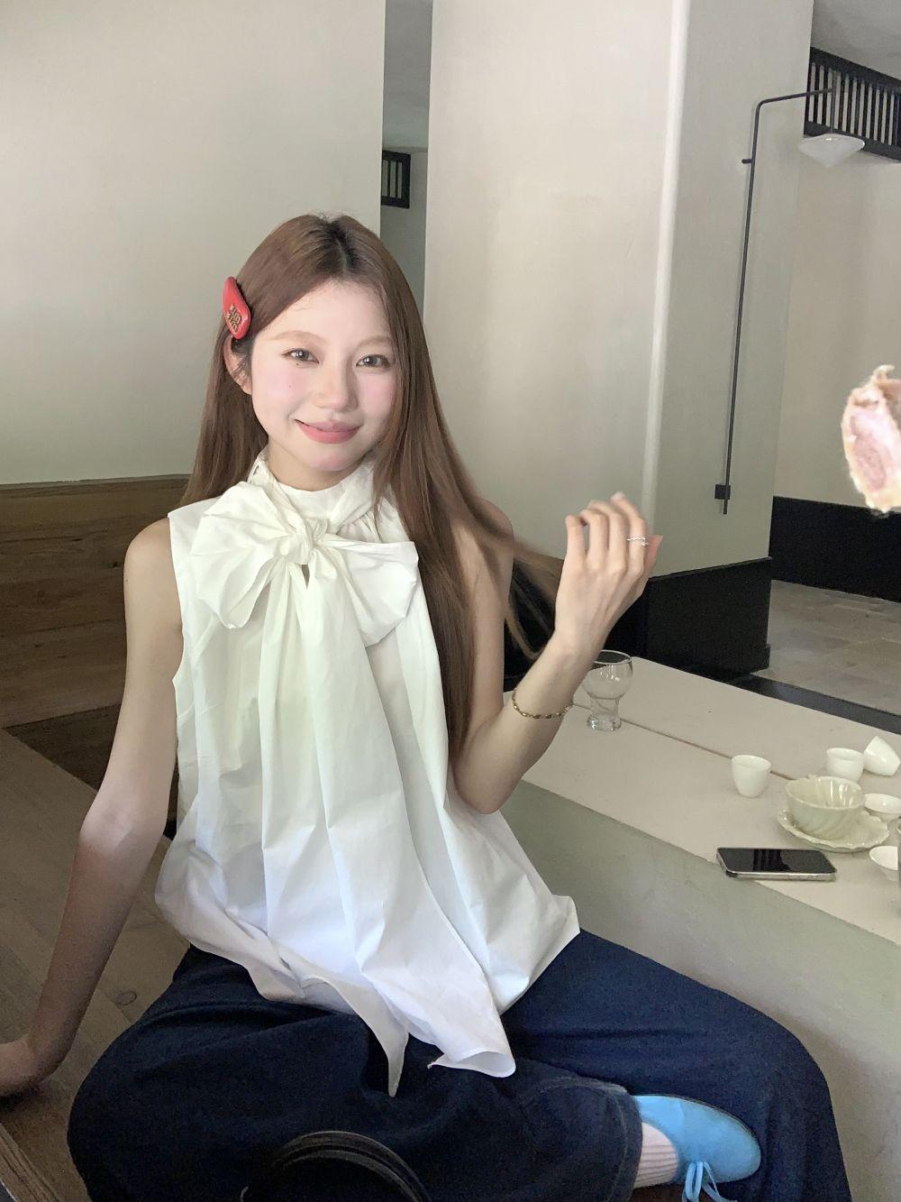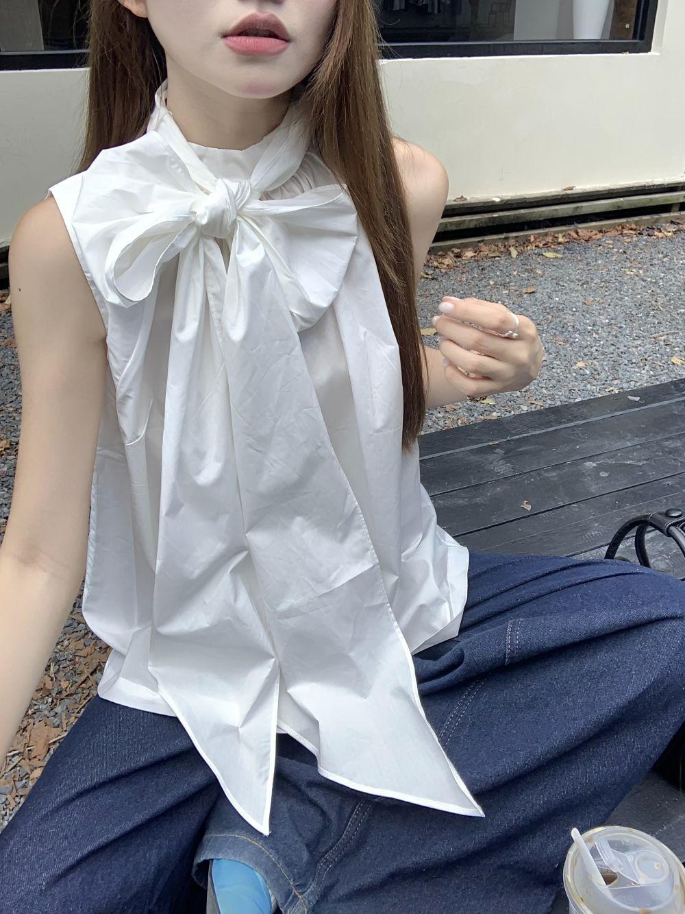 Foto real verano 2025 diseño estilo coreano cuello con lazo camisa sin mangas top temperamento de mujer camisa pequeña para mujer