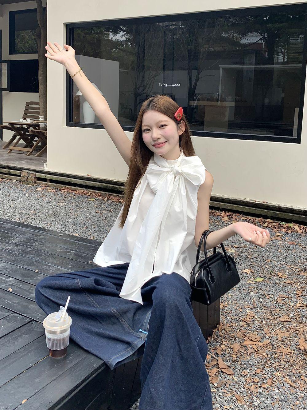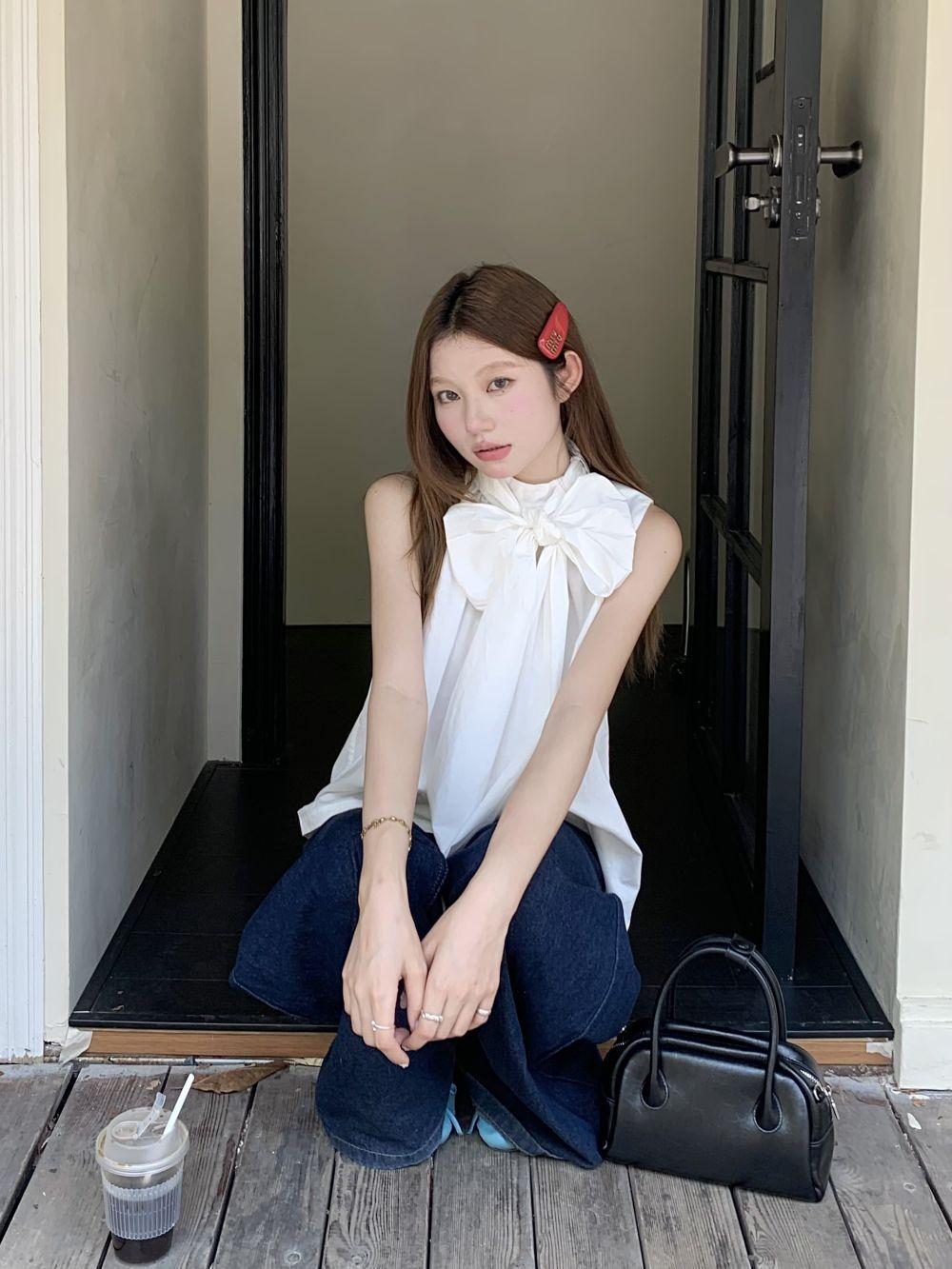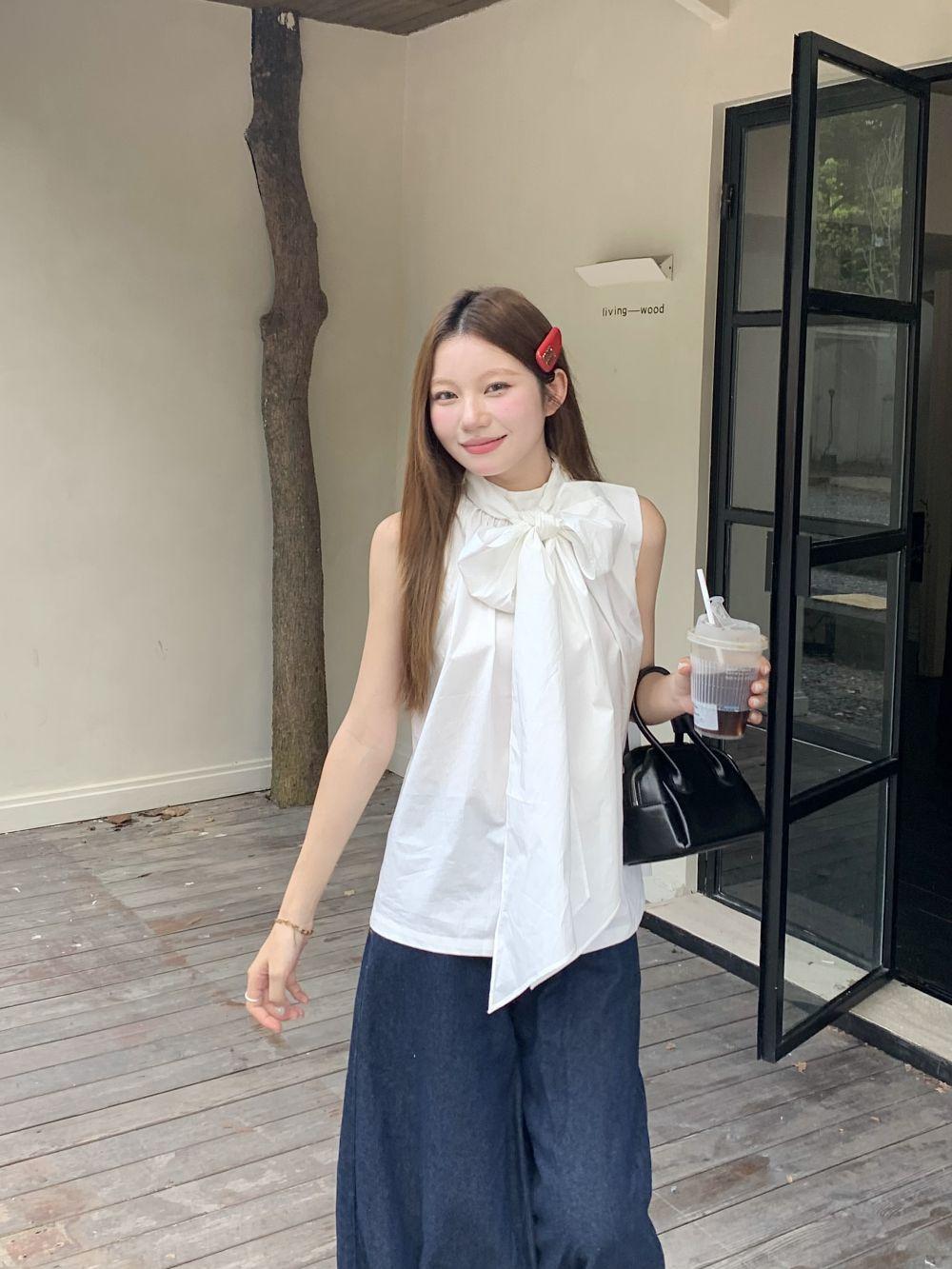 Foto real verano 2025 diseño estilo coreano cuello con lazo camisa sin mangas top temperamento de mujer camisa pequeña para mujer