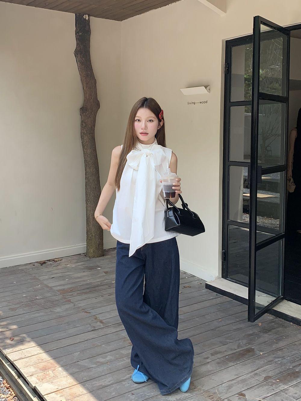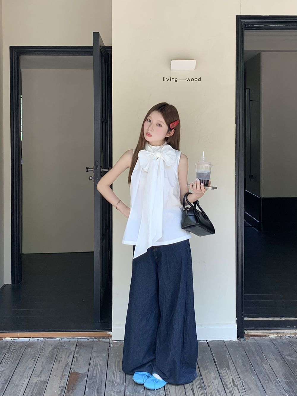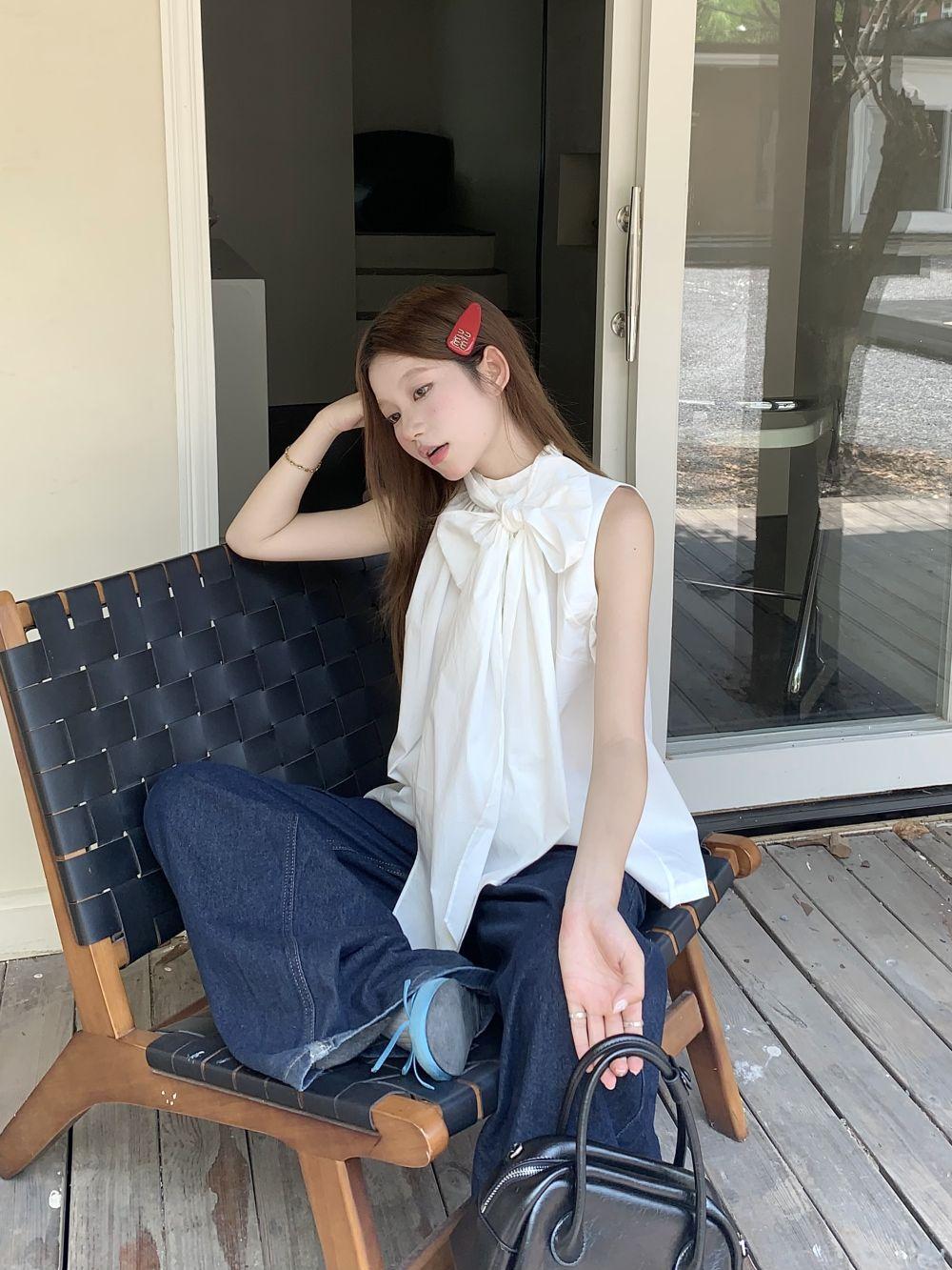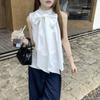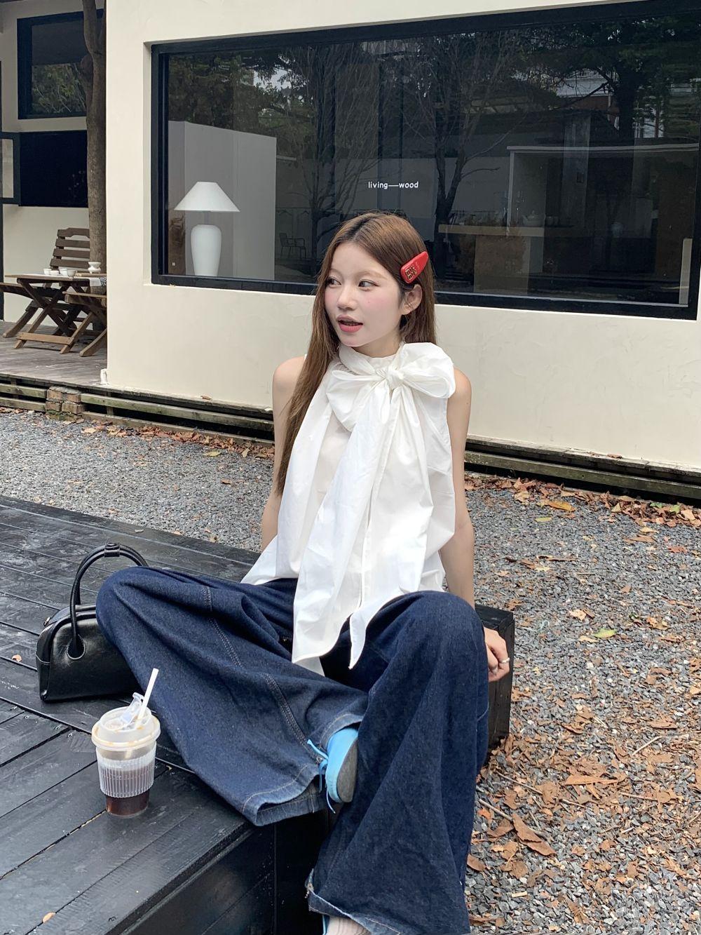 Foto real verano 2025 diseño estilo coreano cuello con lazo camisa sin mangas top temperamento de mujer camisa pequeña para mujer