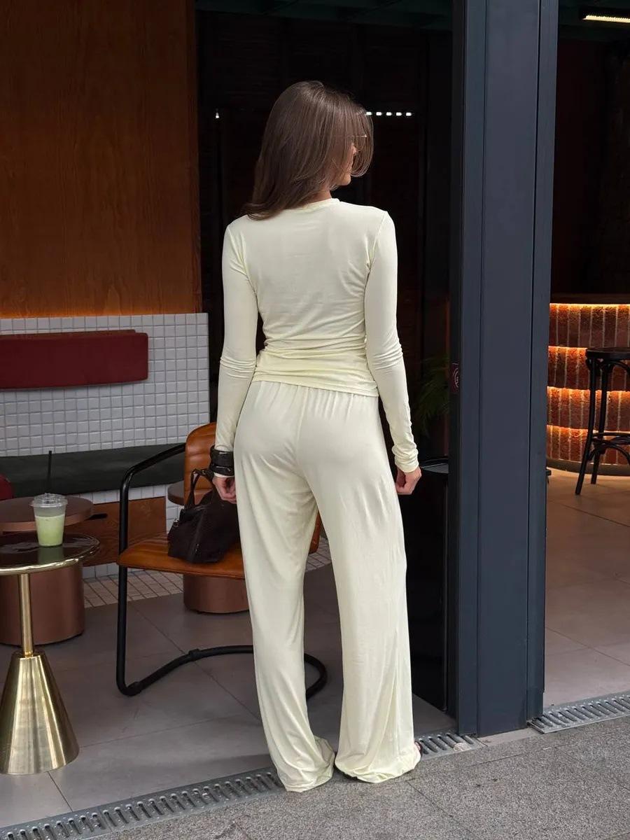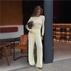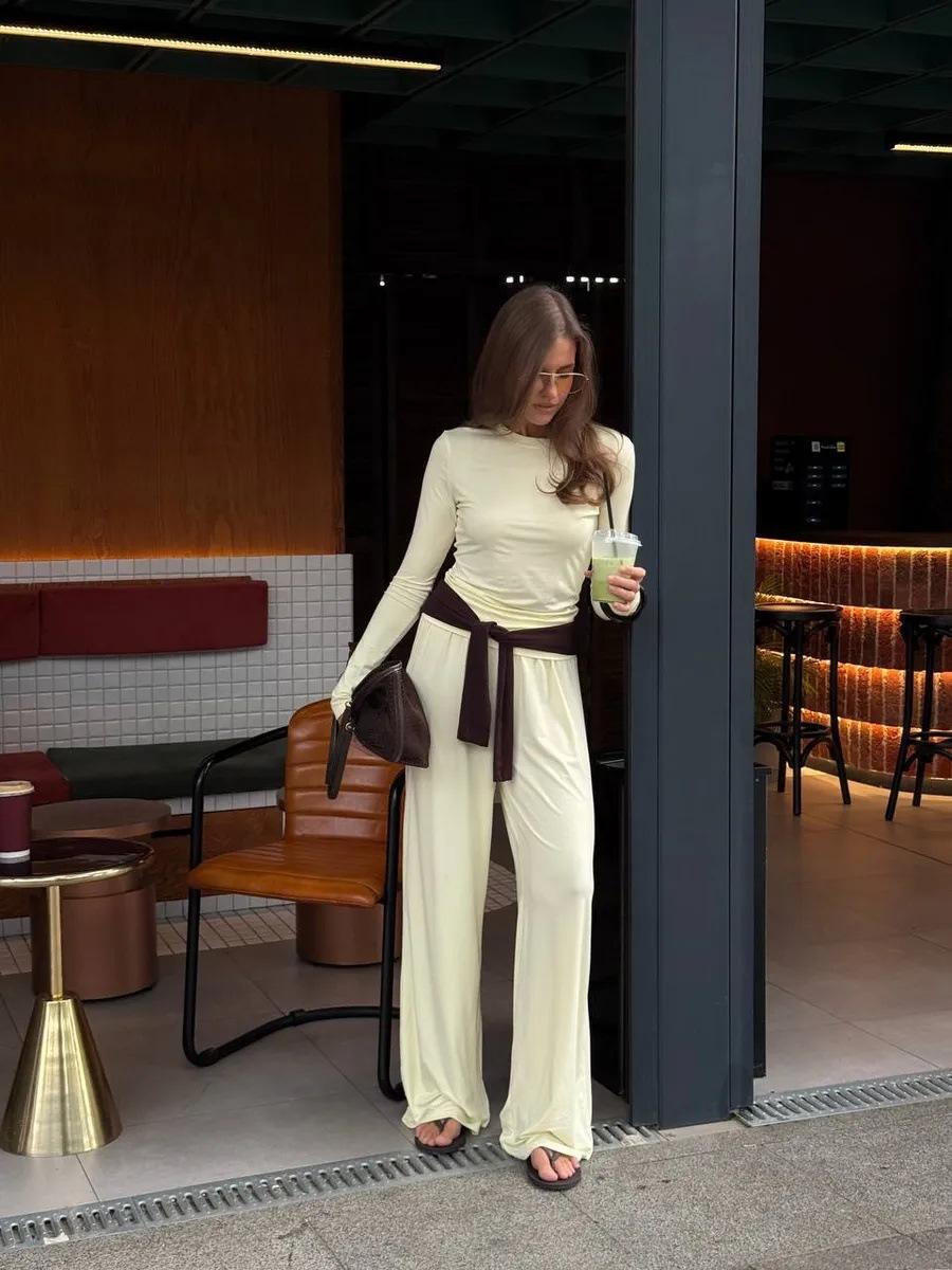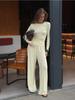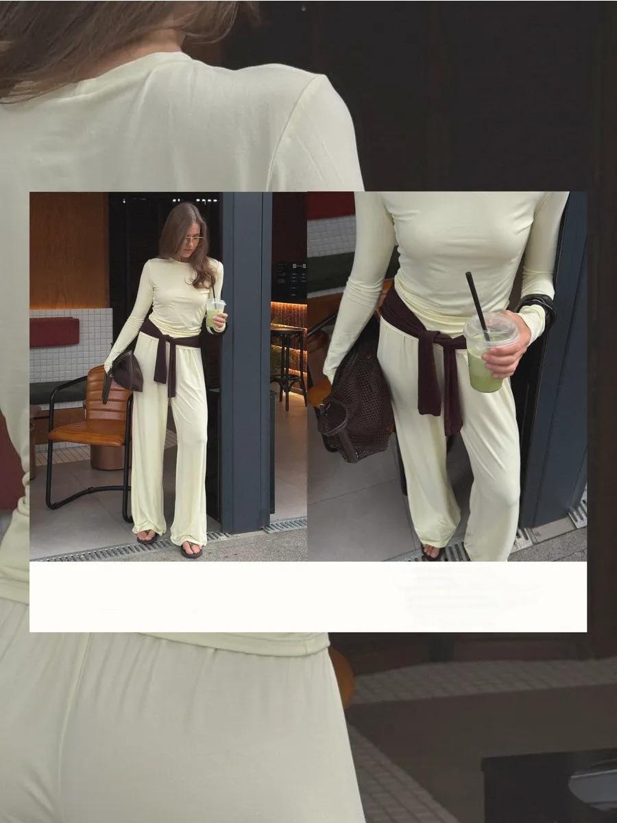 Conjunto de dos piezas de moda europea y americana transfronteriza de primavera y verano para mujer, nuevo, cuello redondo, manga larga, corte ajustado, top cómodo, pantalones largos.