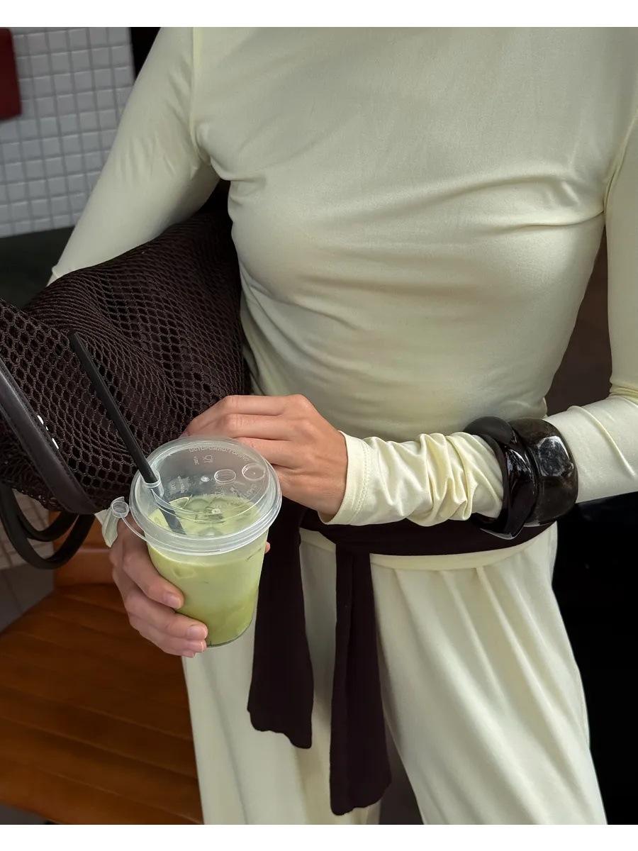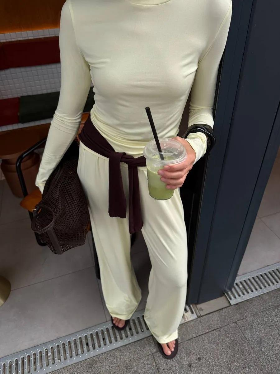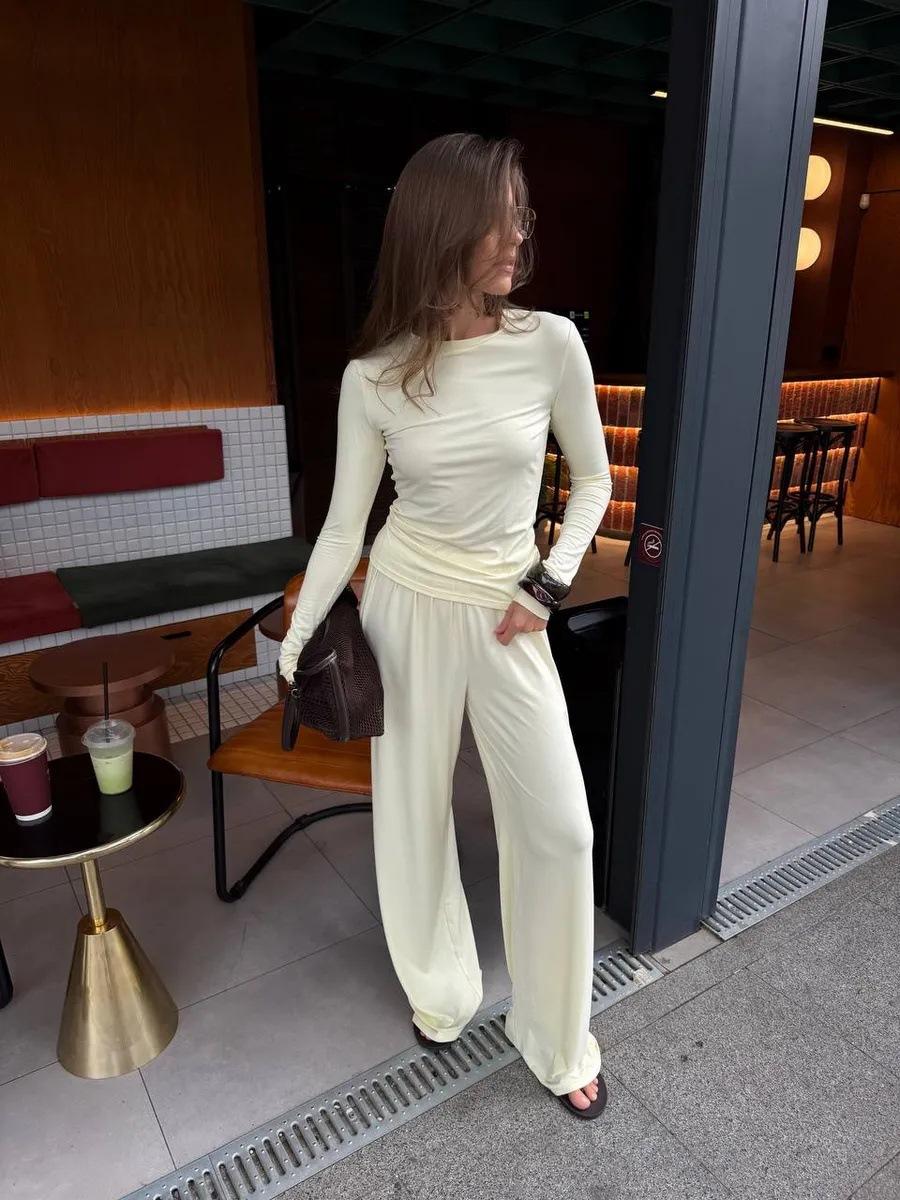 Conjunto de dos piezas de moda europea y americana transfronteriza de primavera y verano para mujer, nuevo, cuello redondo, manga larga, corte ajustado, top cómodo, pantalones largos.