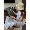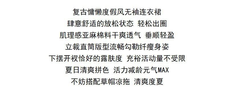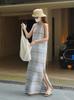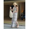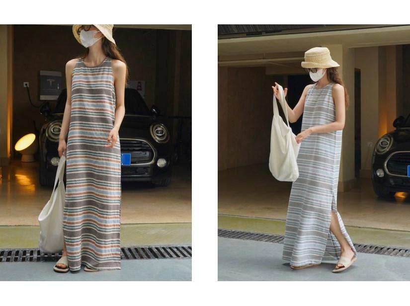 Verano Nuevo Estilo Coreano Estilo Vacacional Vestido Chaleco Rayado de Lino Suelto Adelgazante Abertura Lateral Sin Mangas Falda Larga para Mujer