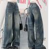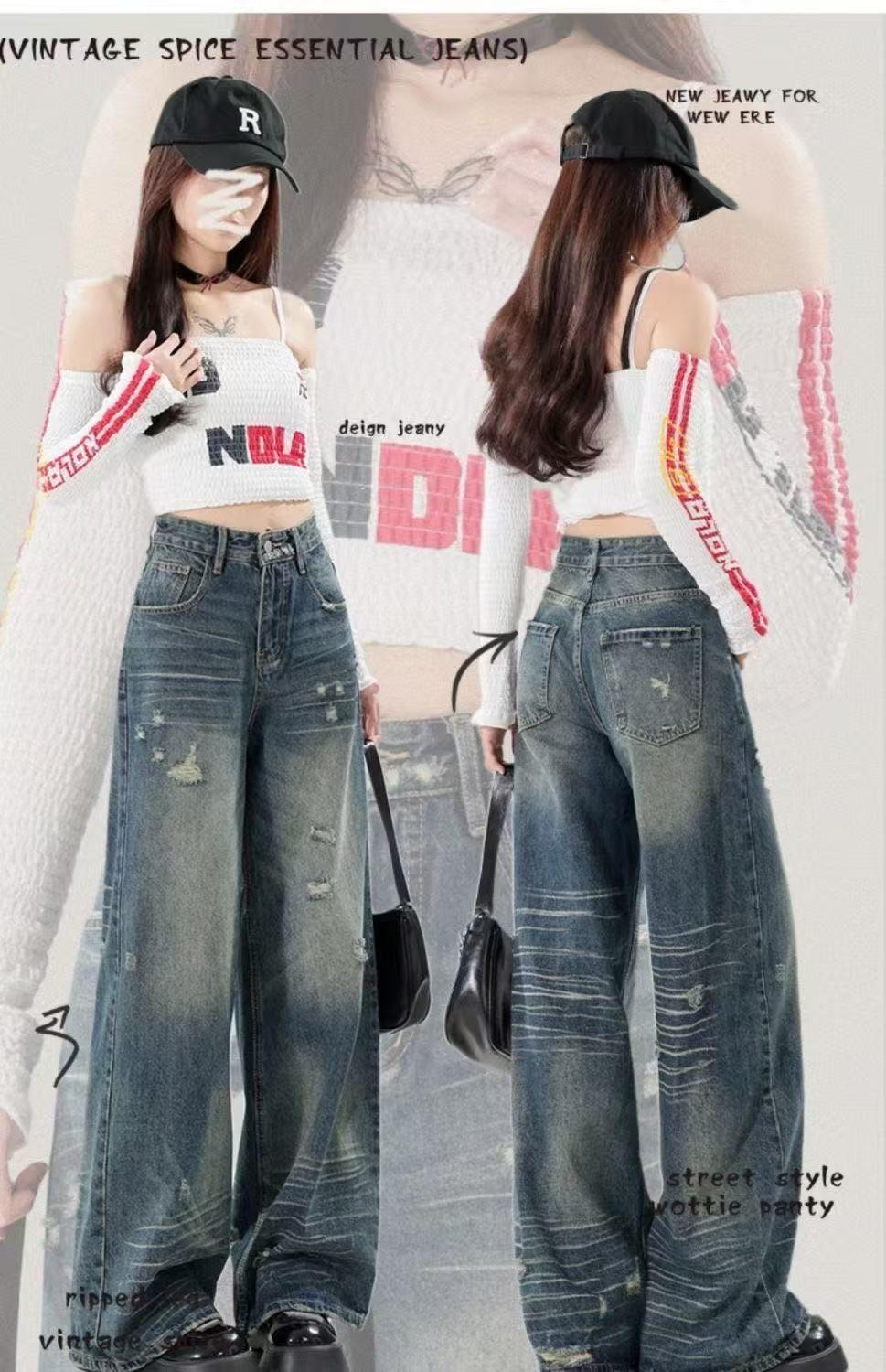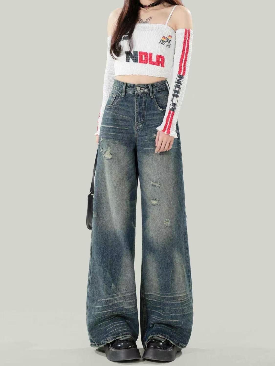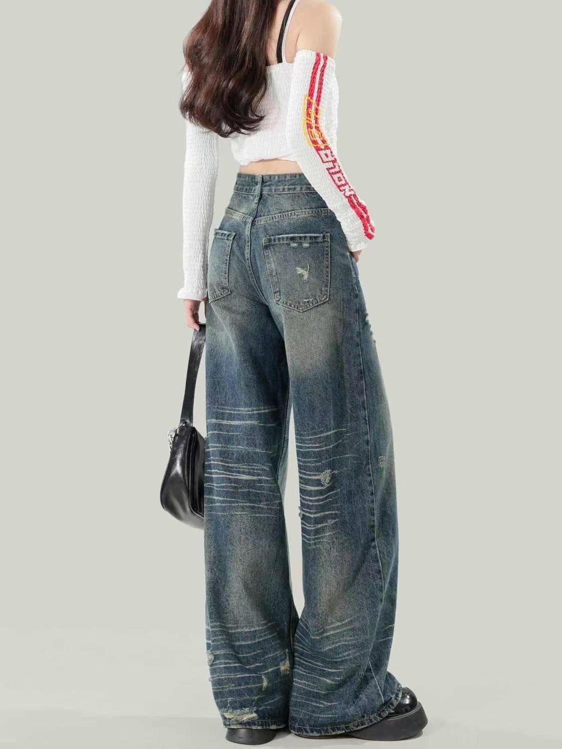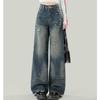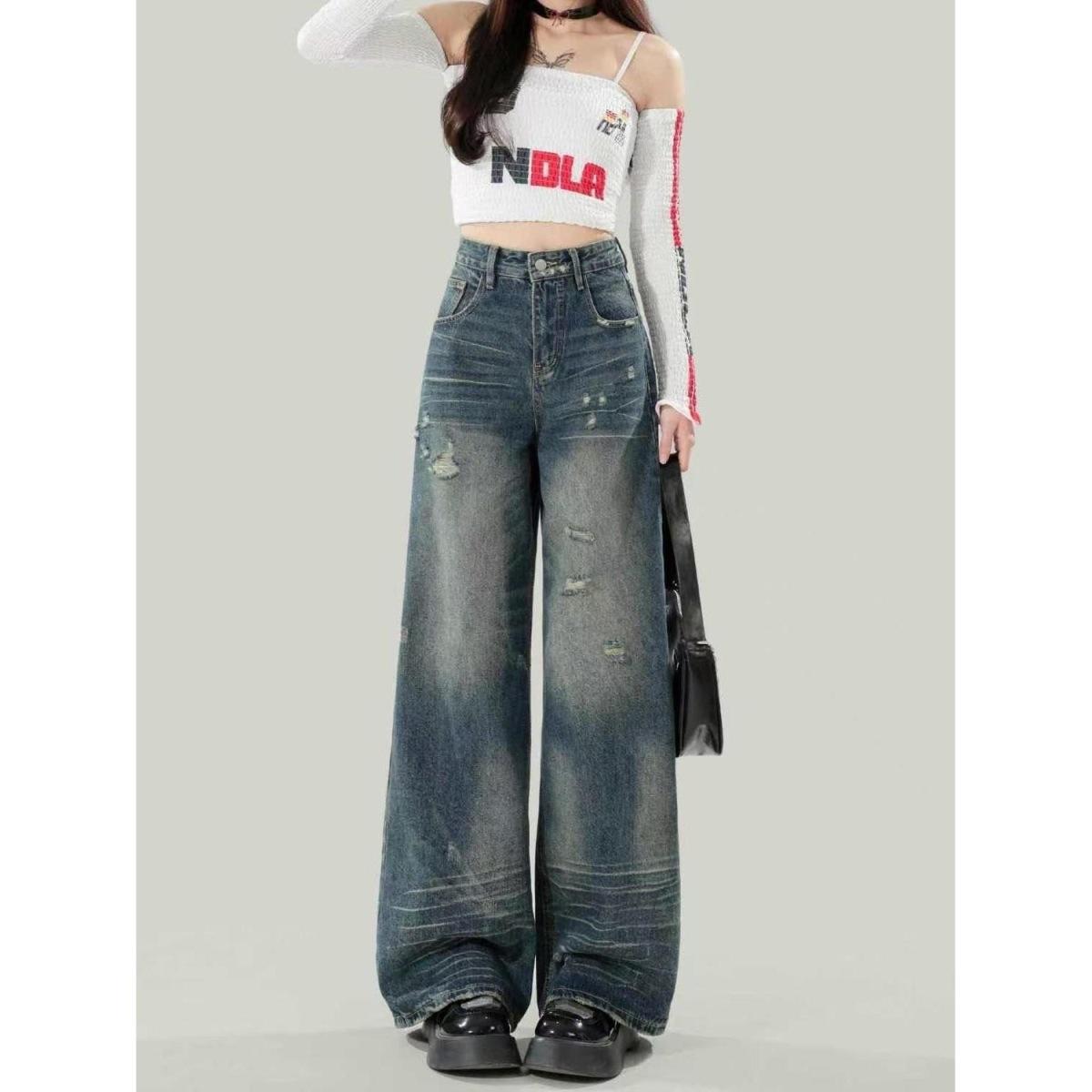Diseño americano jeans rotos mujer 2025 verano pierna recta cintura alta adelgazantes hasta el suelo pierna ancha pantalones largos