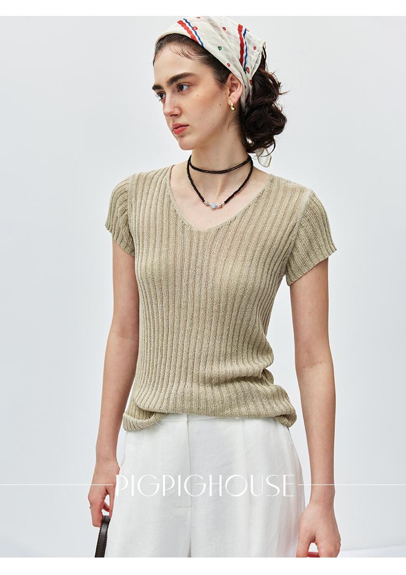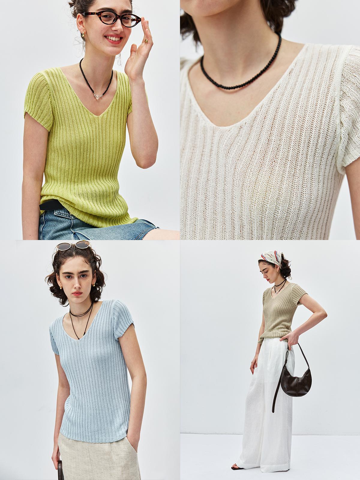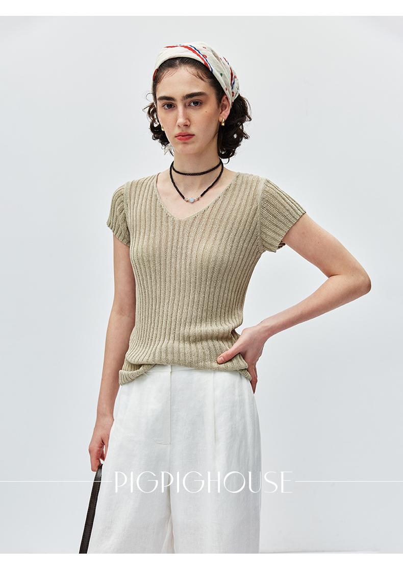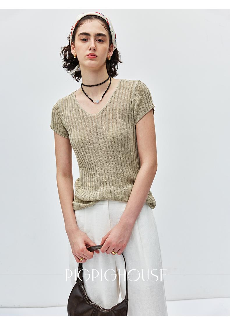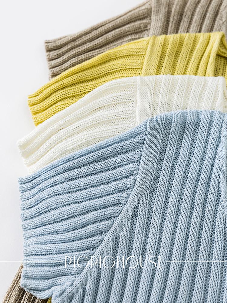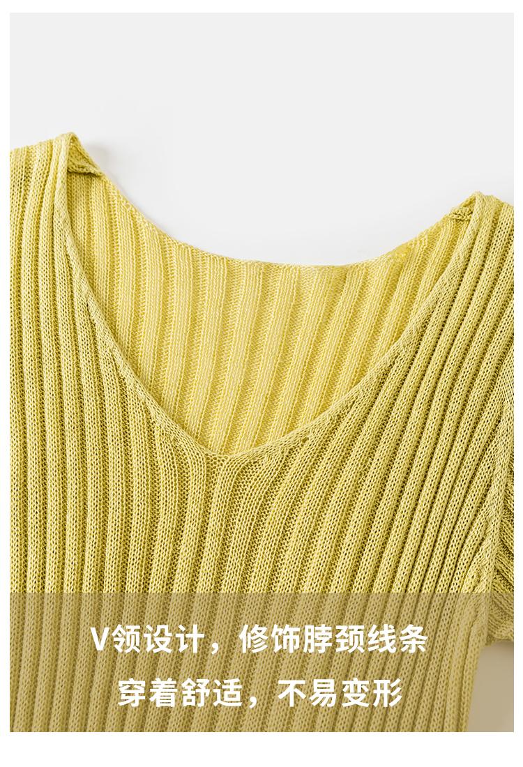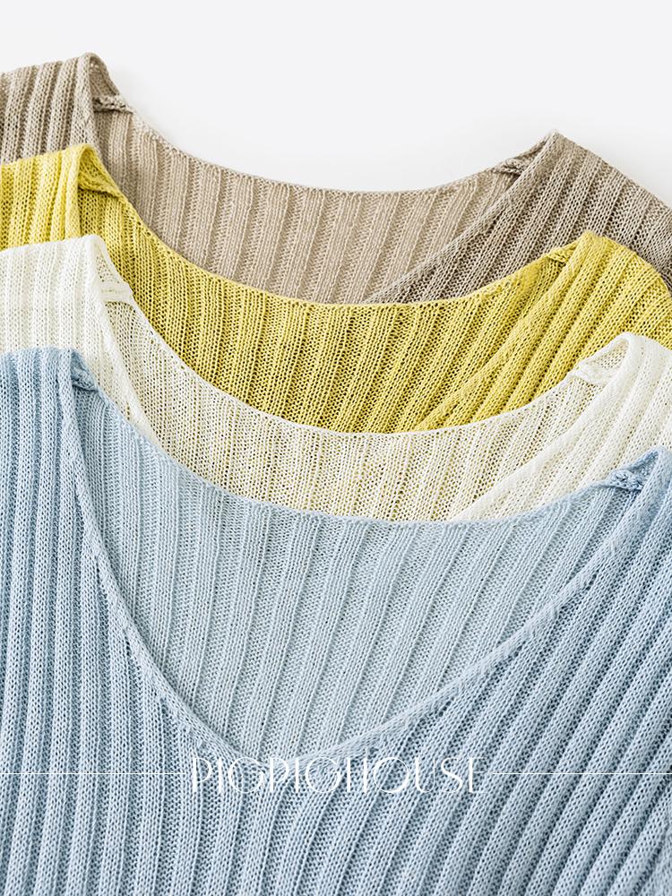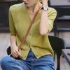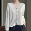 [Sensación de Respiración] Verano Tencel Lino Sencillo Commuter Versátil Cuello en V Punto Canalé Cárdigan Top para Mujer