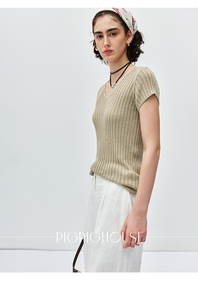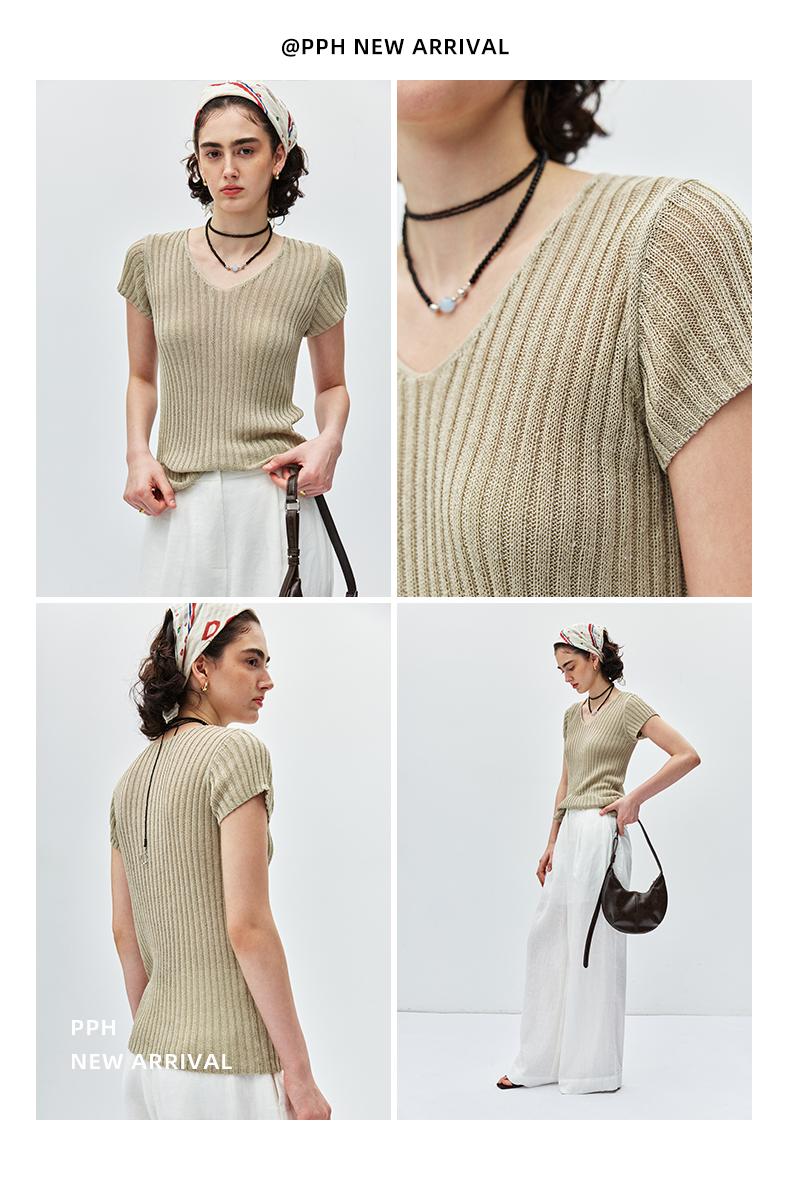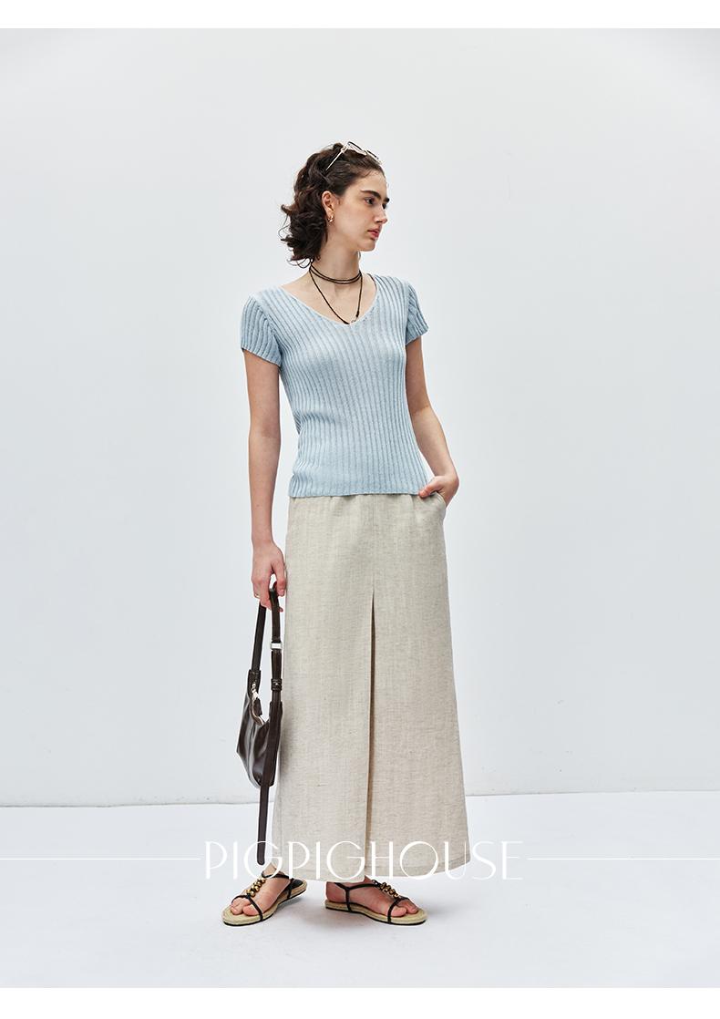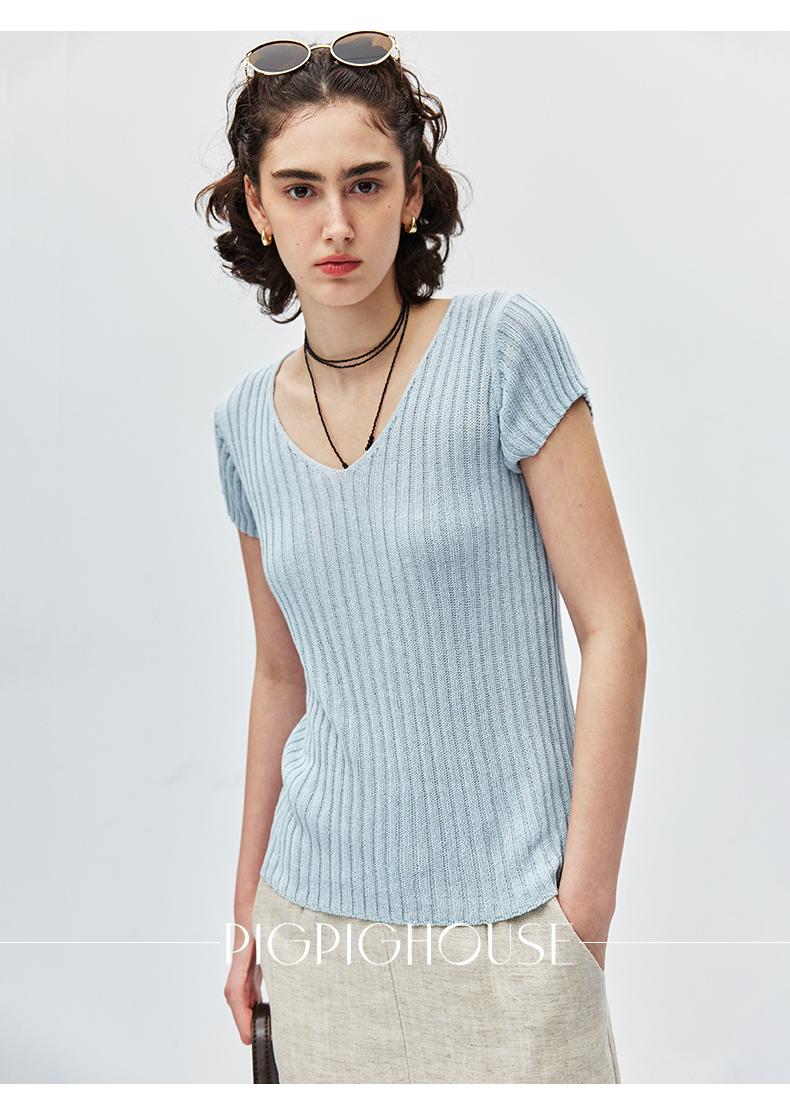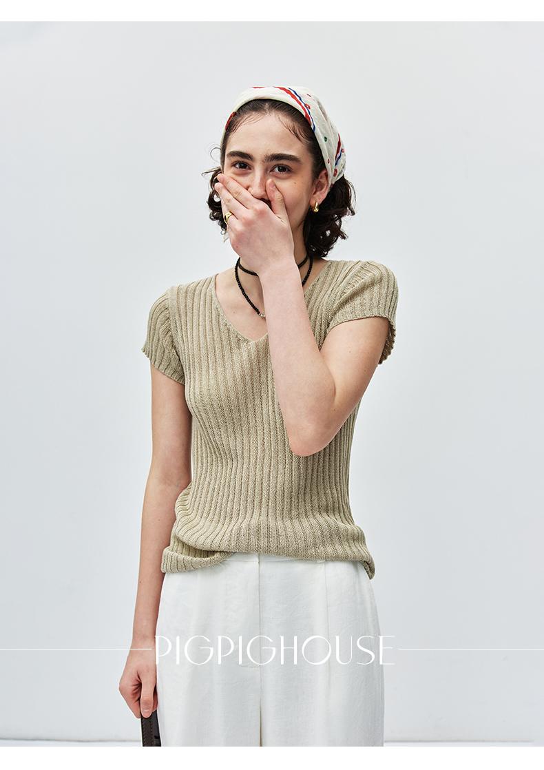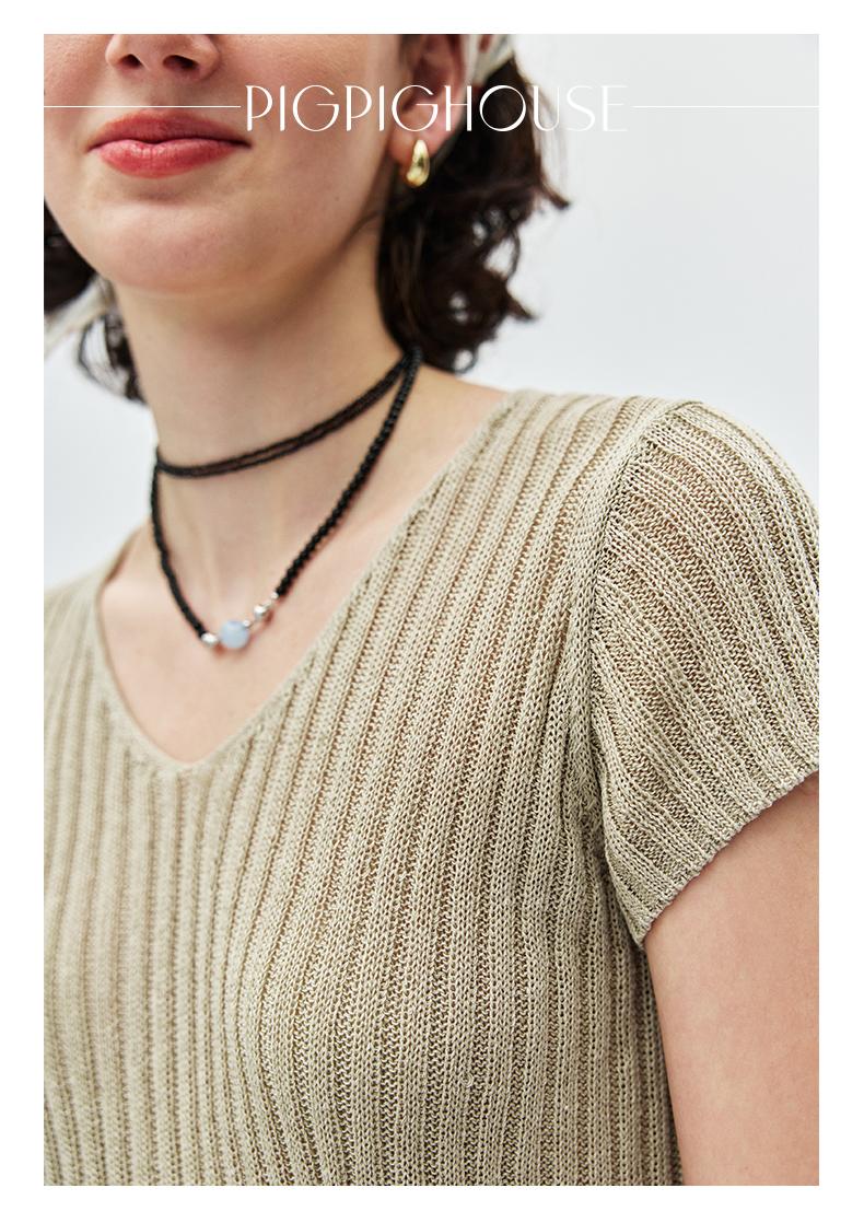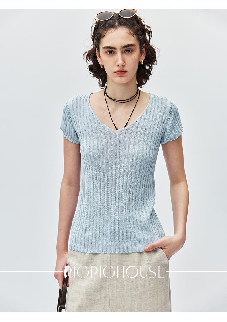 [Sensación de Respiración] Verano Tencel Lino Sencillo Commuter Versátil Cuello en V Punto Canalé Cárdigan Top para Mujer