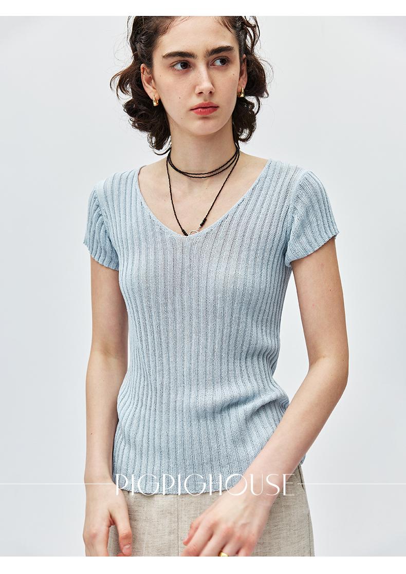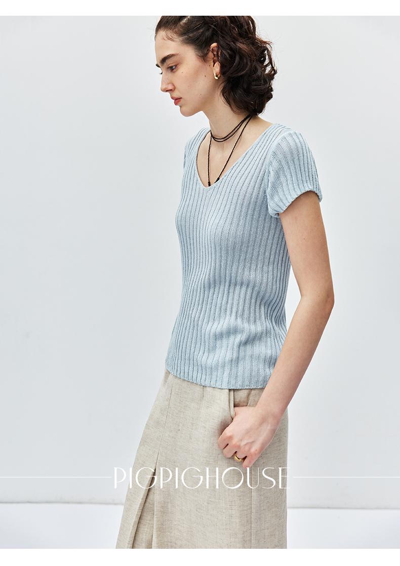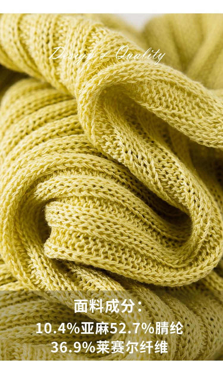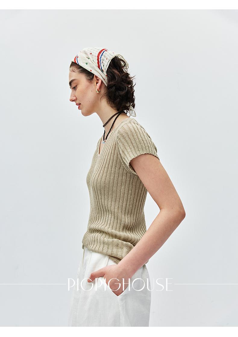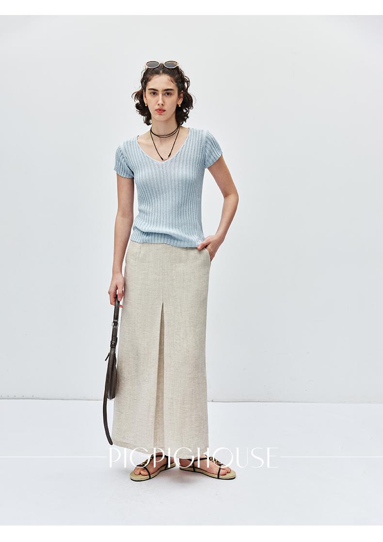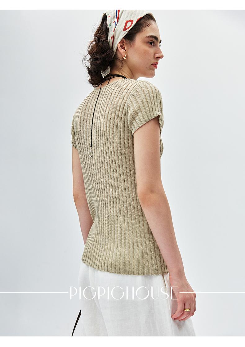 [Sensación de Respiración] Verano Tencel Lino Sencillo Commuter Versátil Cuello en V Punto Canalé Cárdigan Top para Mujer