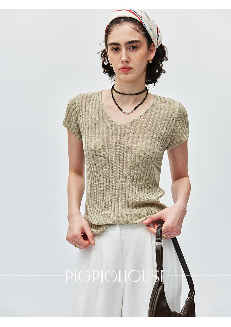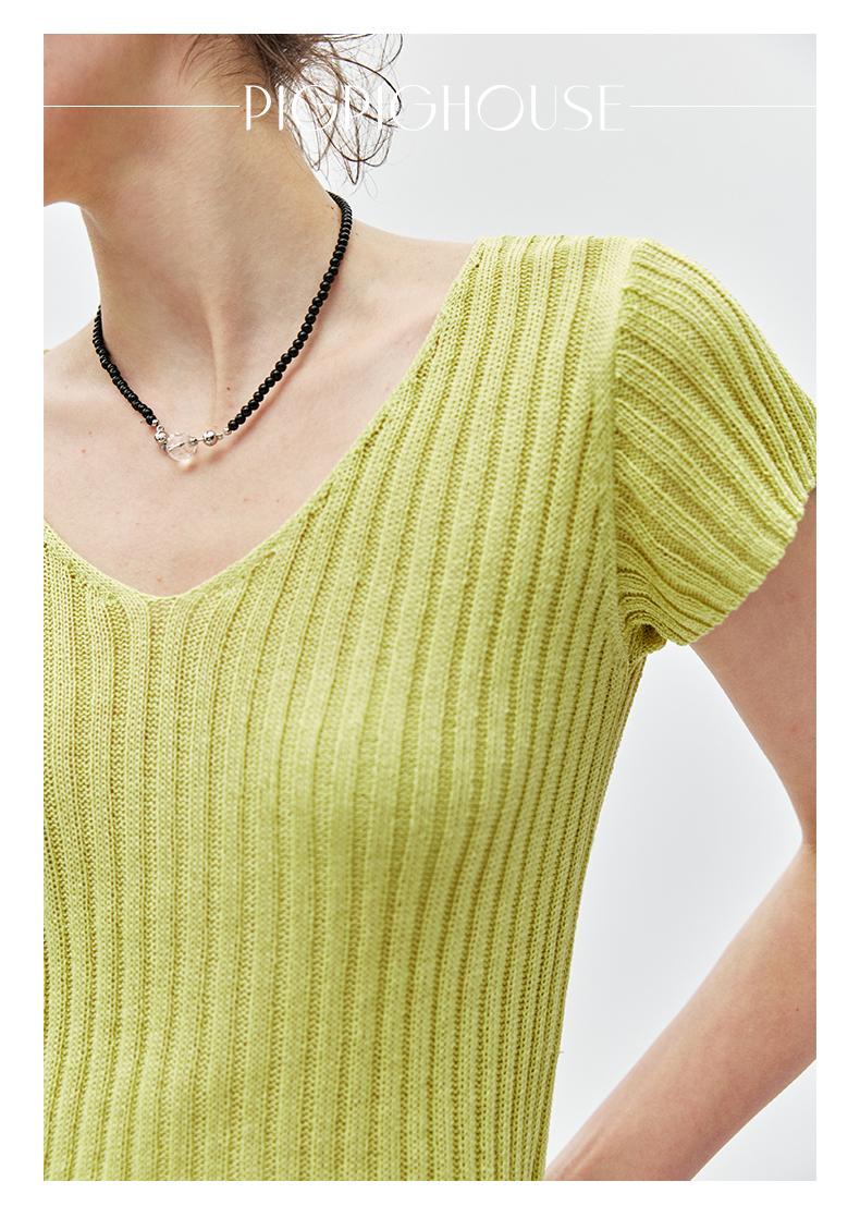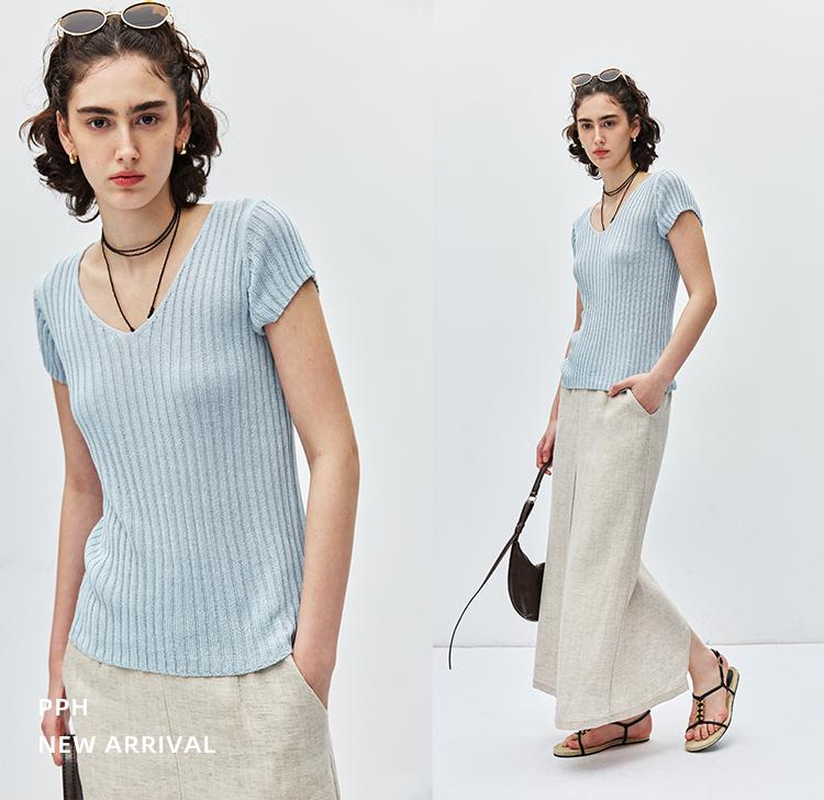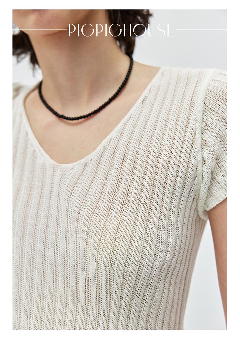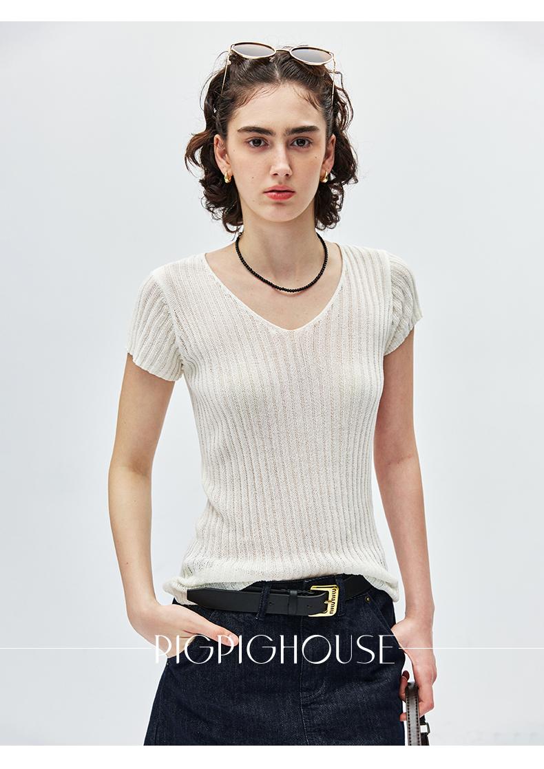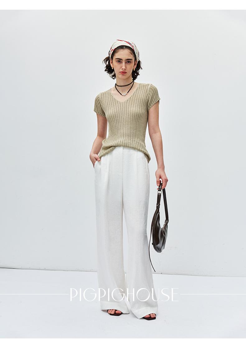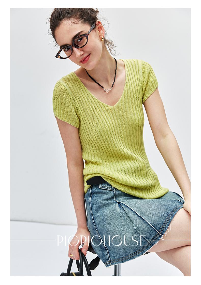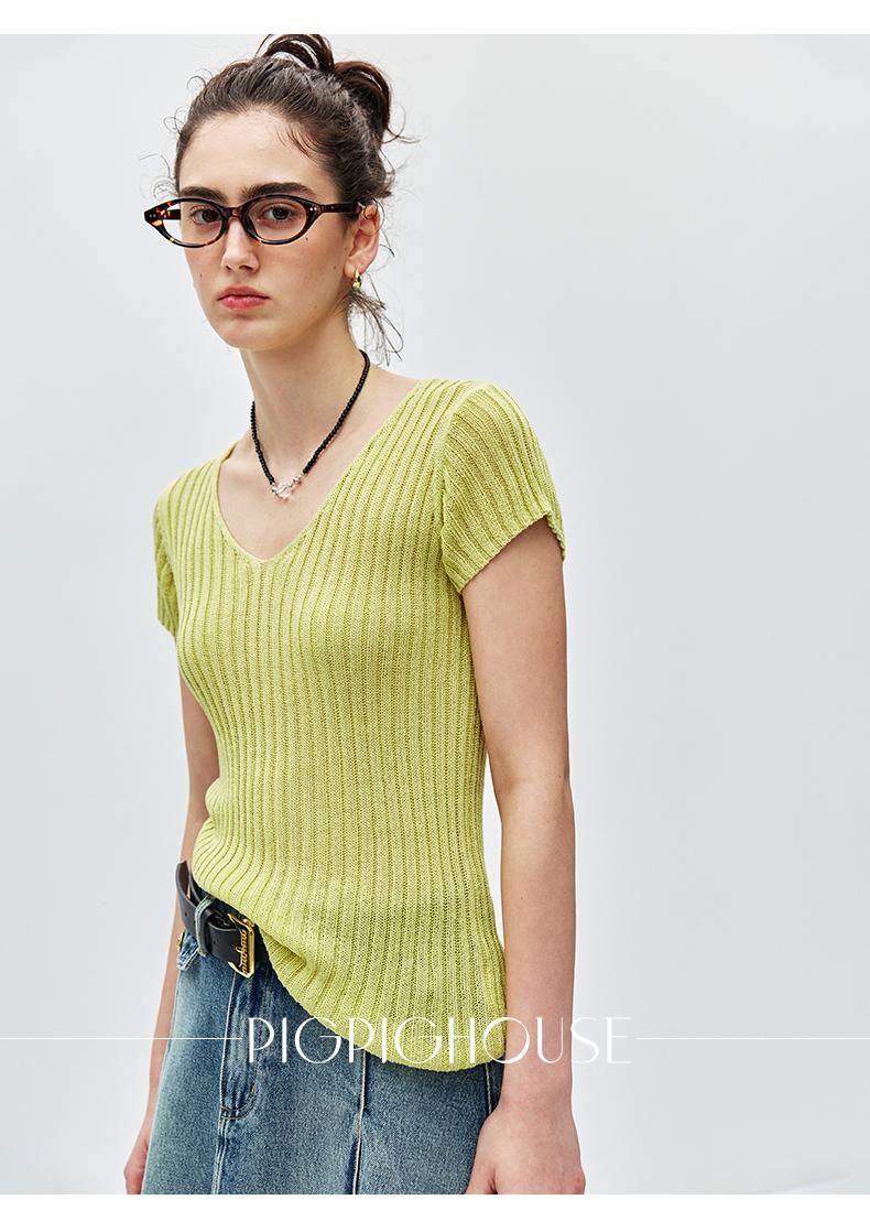 [Sensación de Respiración] Verano Tencel Lino Sencillo Commuter Versátil Cuello en V Punto Canalé Cárdigan Top para Mujer