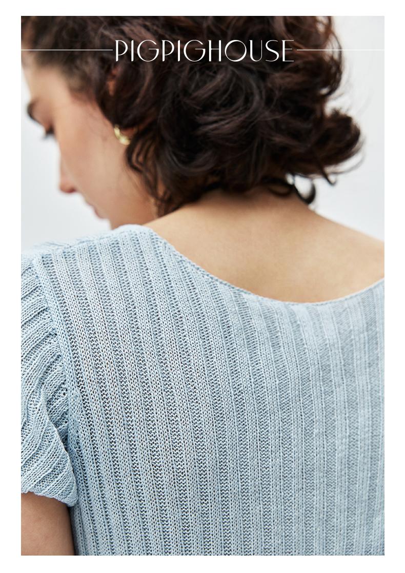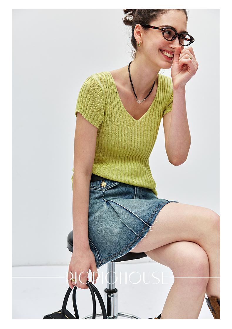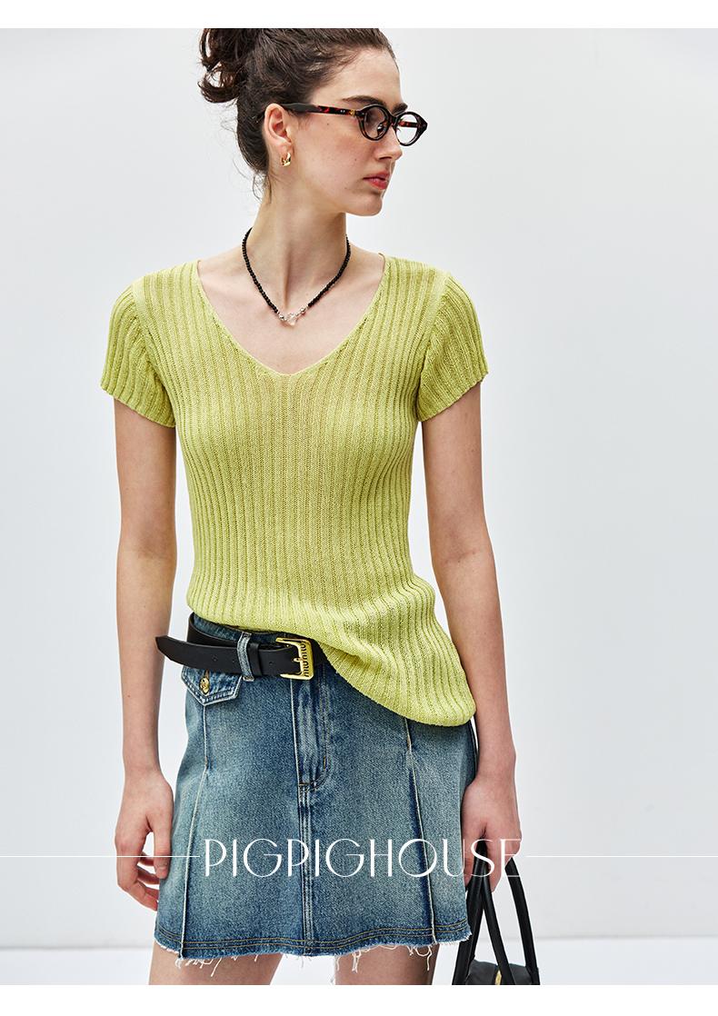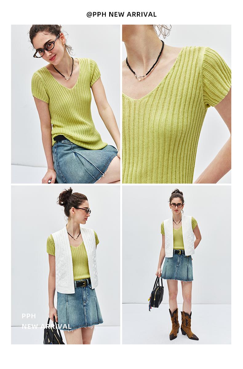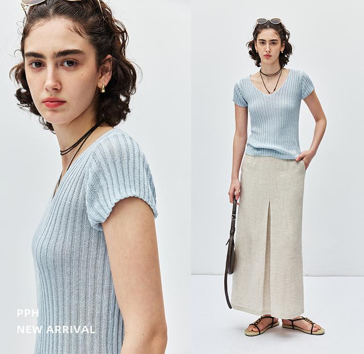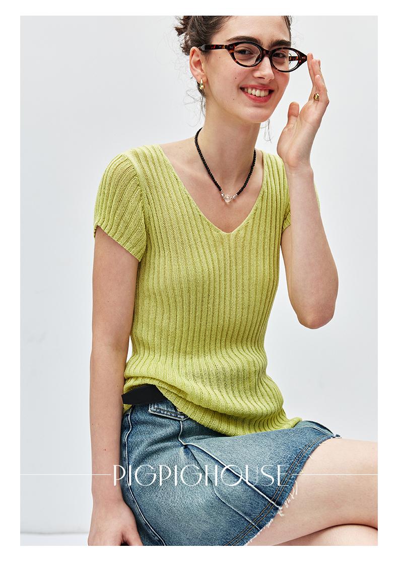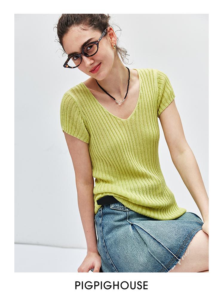 [Sensación de Respiración] Verano Tencel Lino Sencillo Commuter Versátil Cuello en V Punto Canalé Cárdigan Top para Mujer