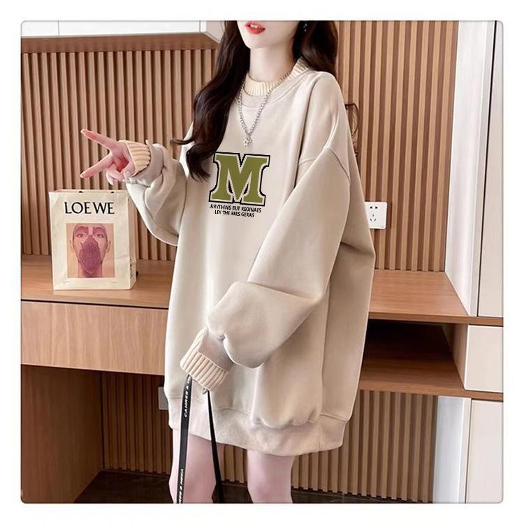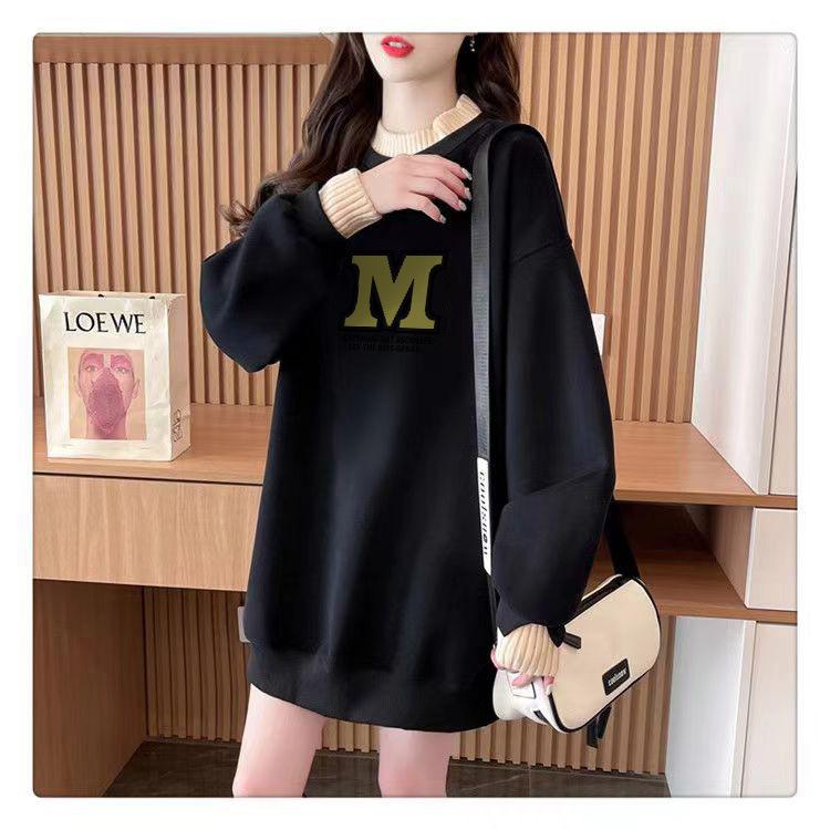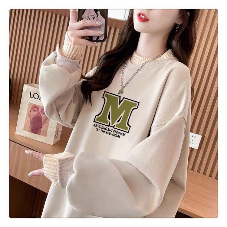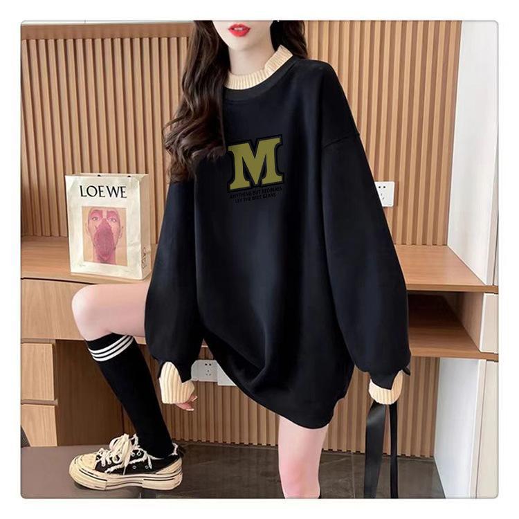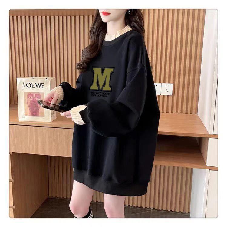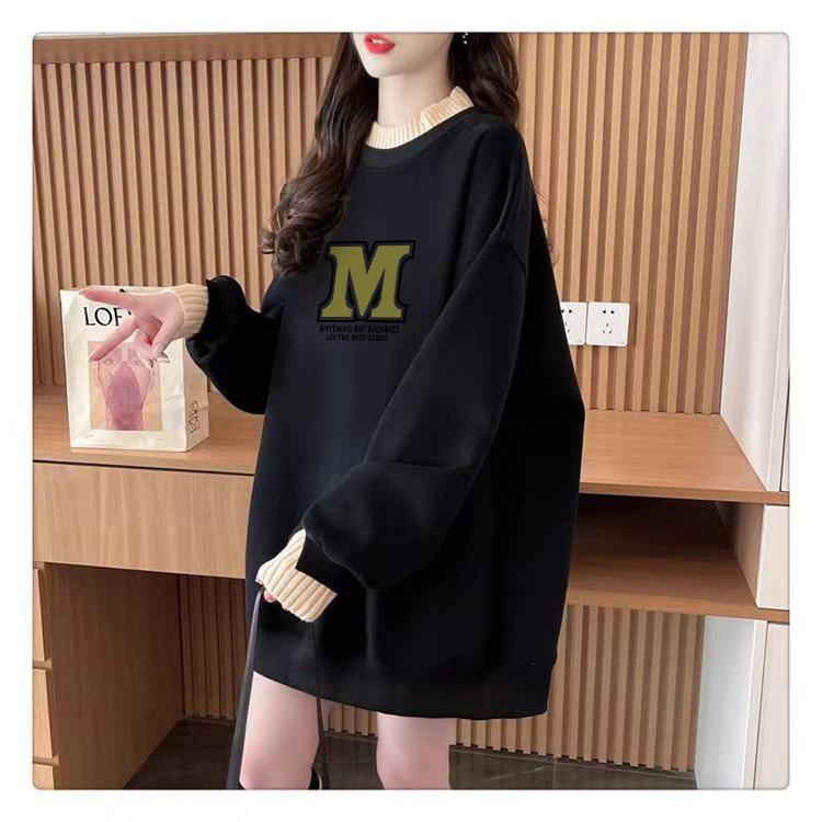 Suéter personalizado simple chic con estampado de letras, diseño de dos piezas falsas de otoño e invierno, oversize, grueso con forro polar, cuello medio alto