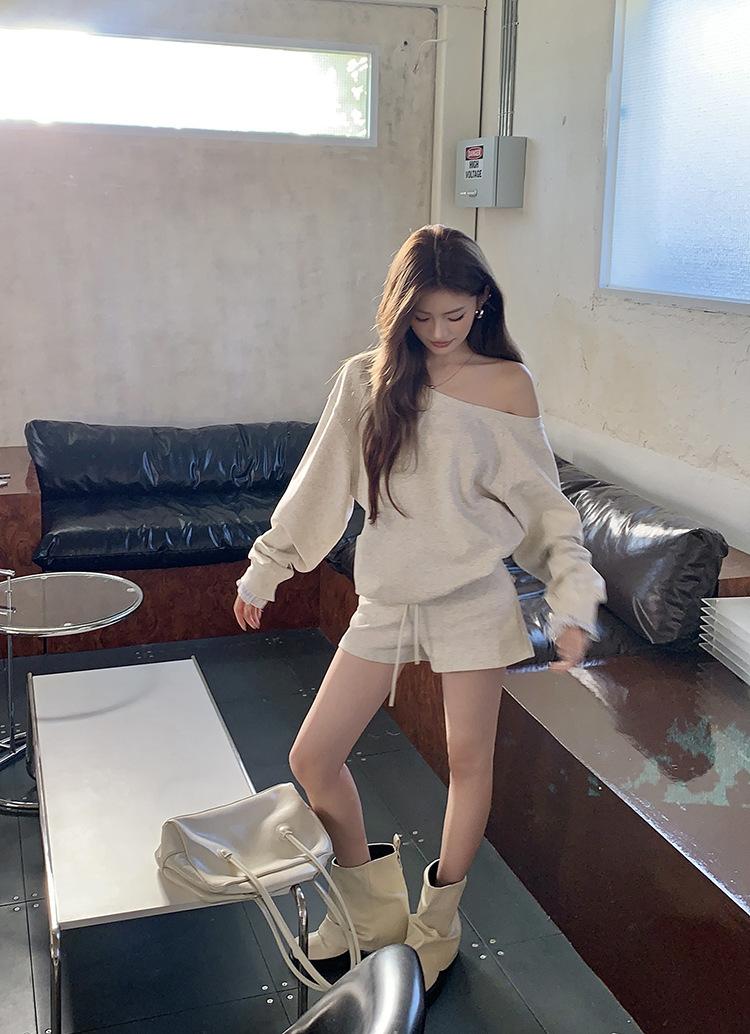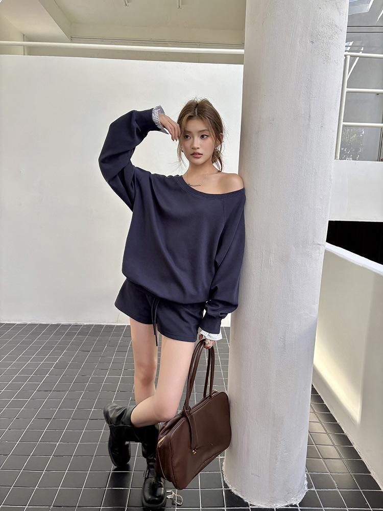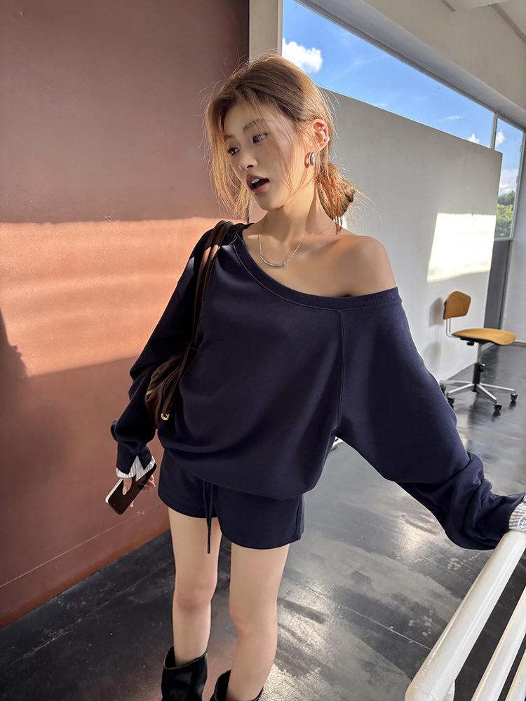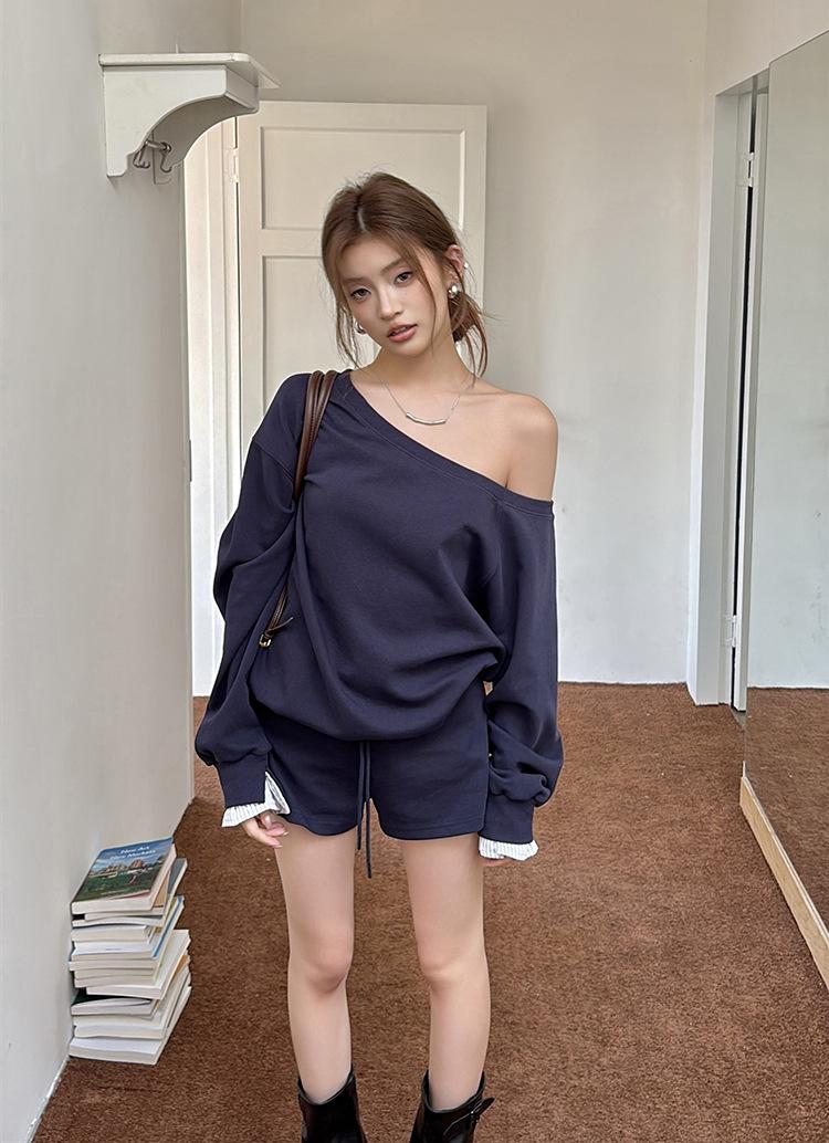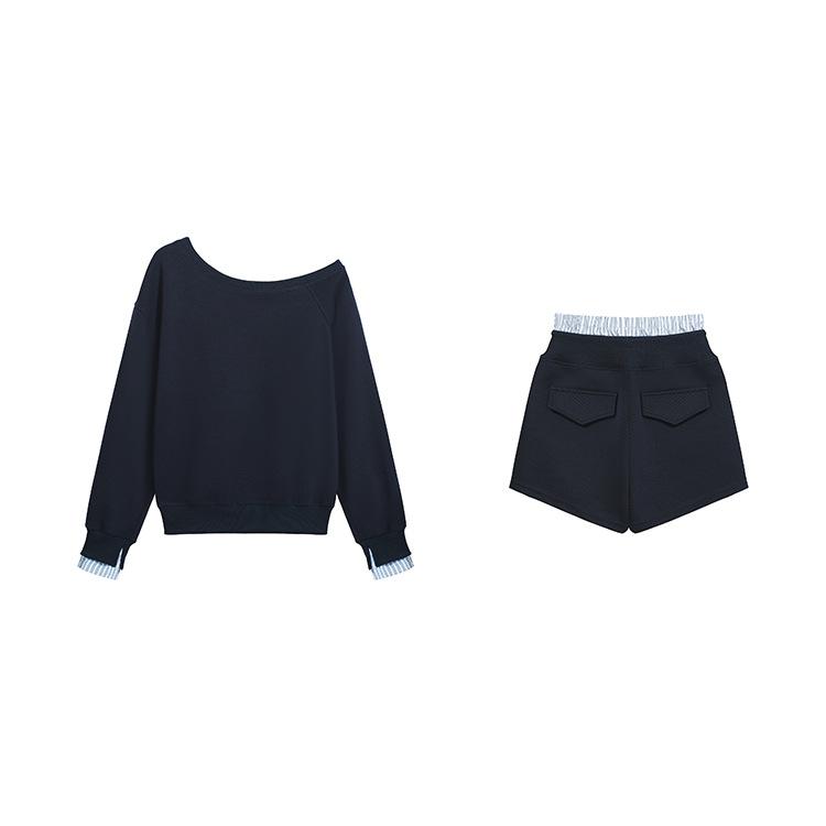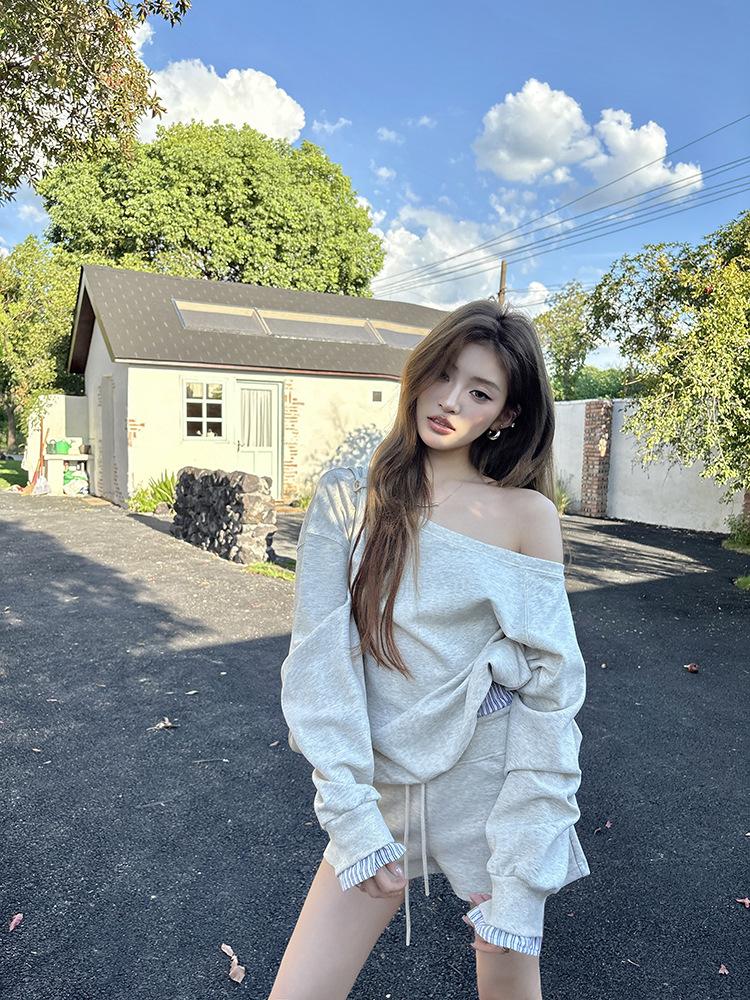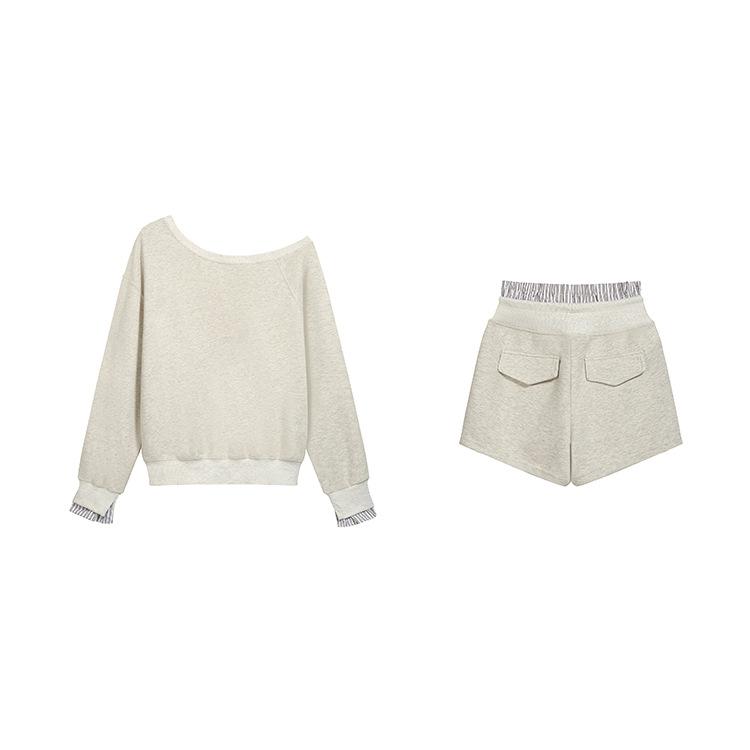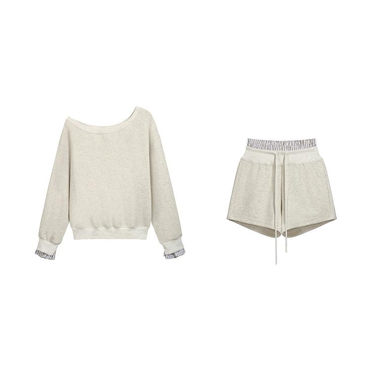 Foto Real Otoño/Invierno 2025 Nuevo Sudadera Top de Moda con Hombros Descubiertos para Chica Caliente Perezosa Conjunto de Dos Piezas de Shorts Color Block para Mujer