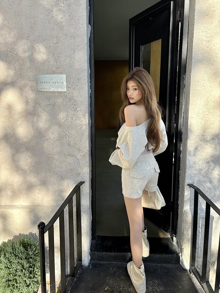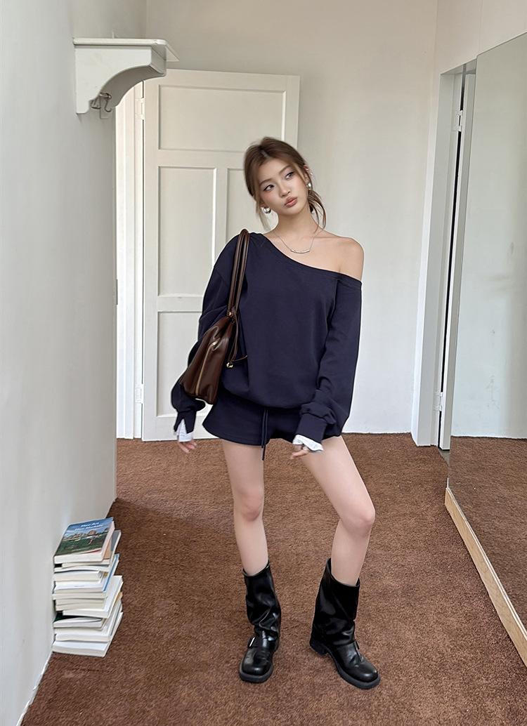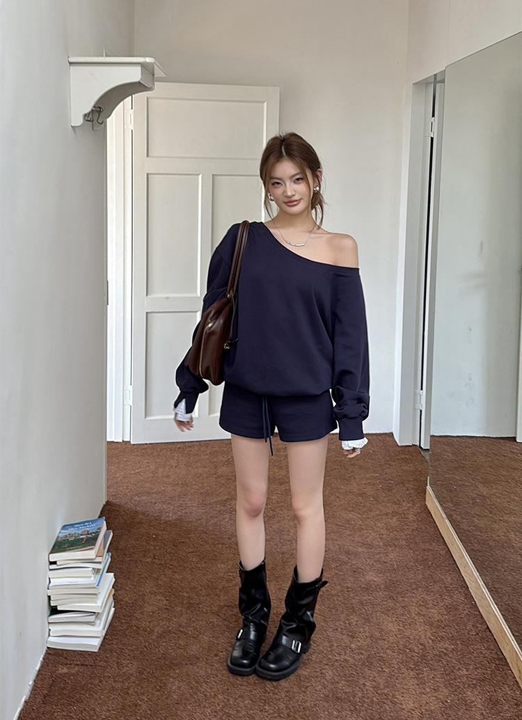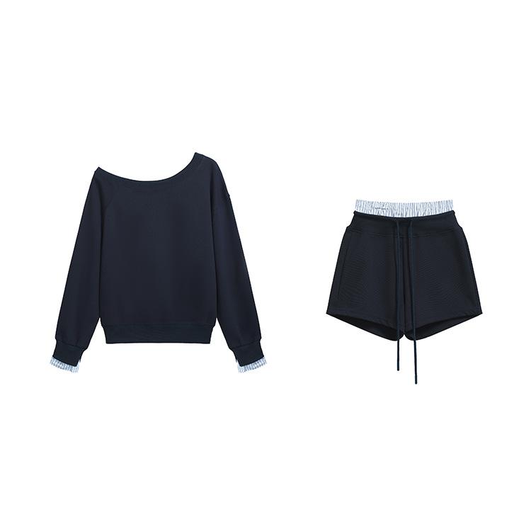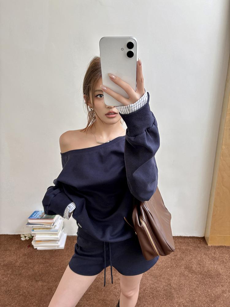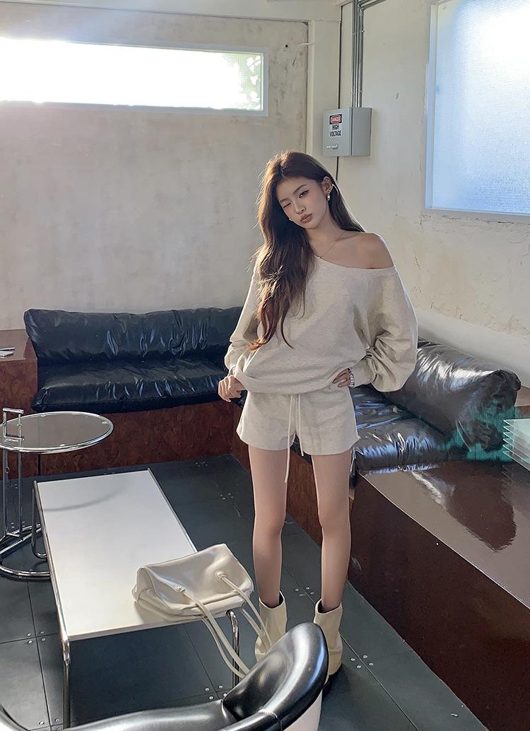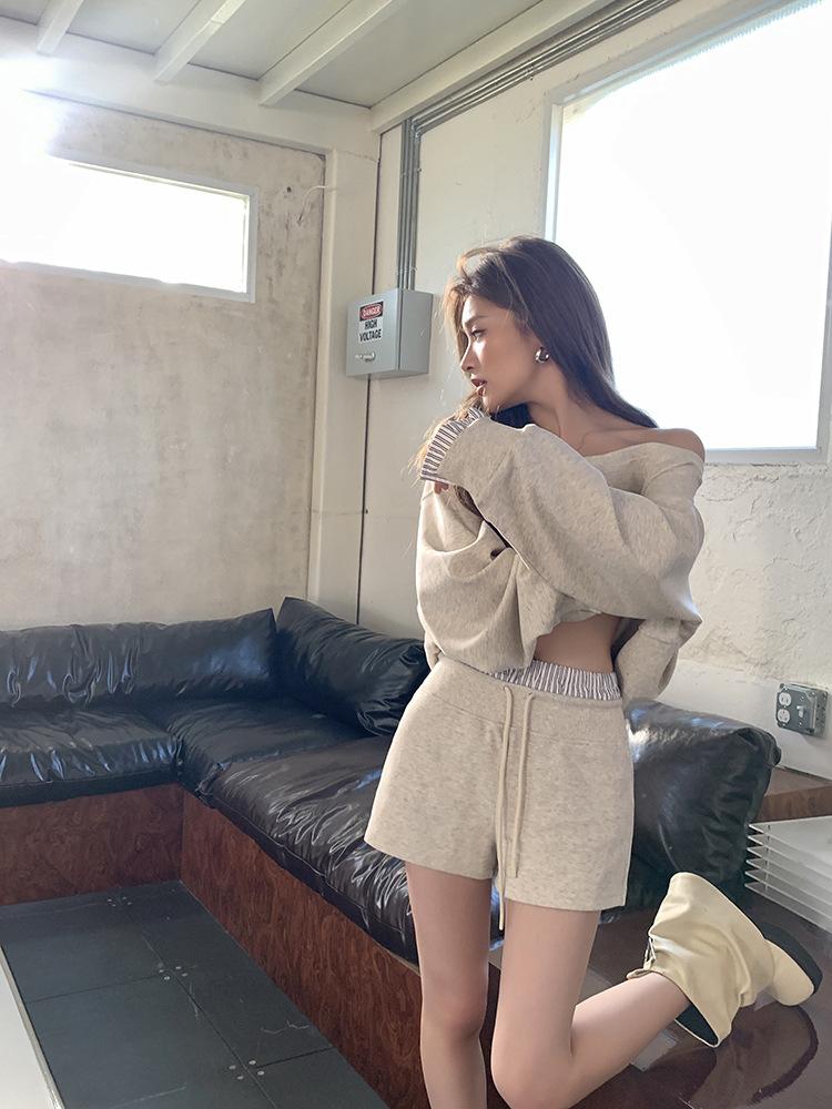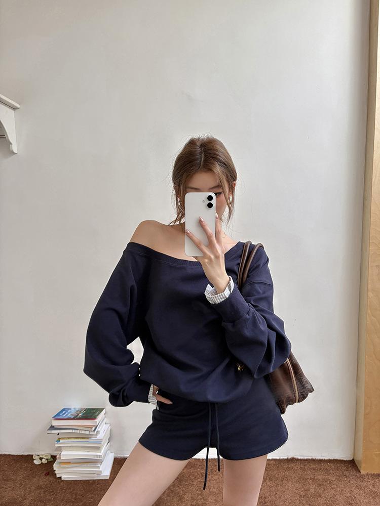 Foto Real Otoño/Invierno 2025 Nuevo Sudadera Top de Moda con Hombros Descubiertos para Chica Caliente Perezosa Conjunto de Dos Piezas de Shorts Color Block para Mujer