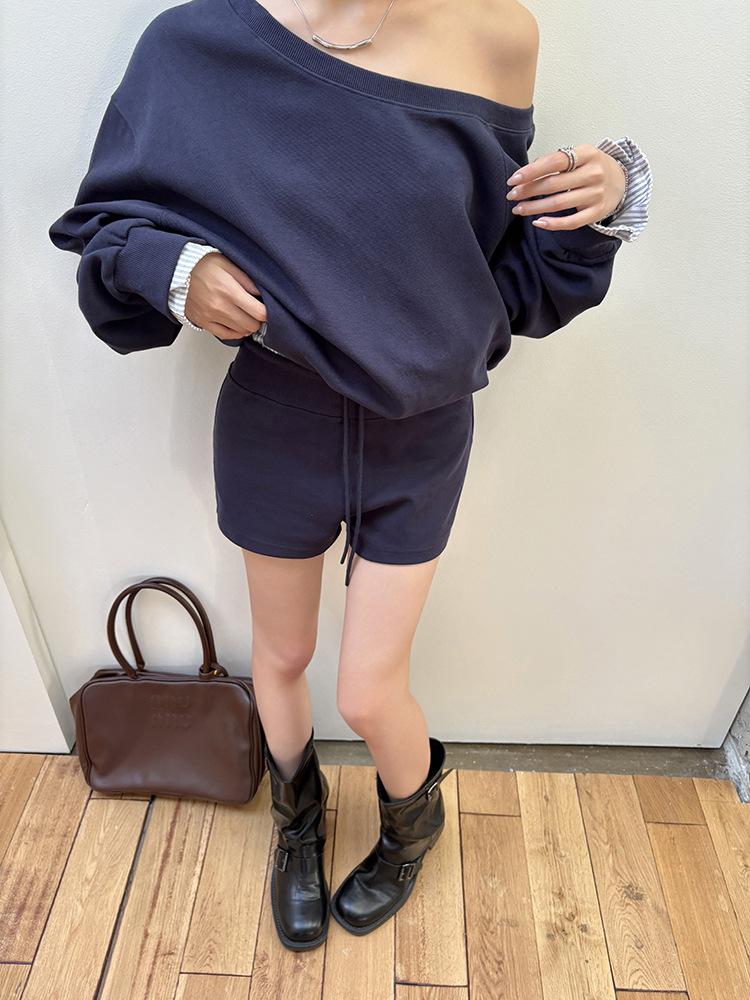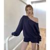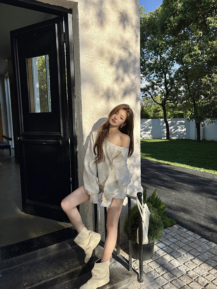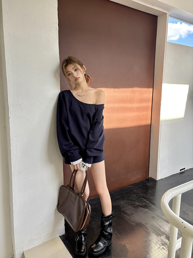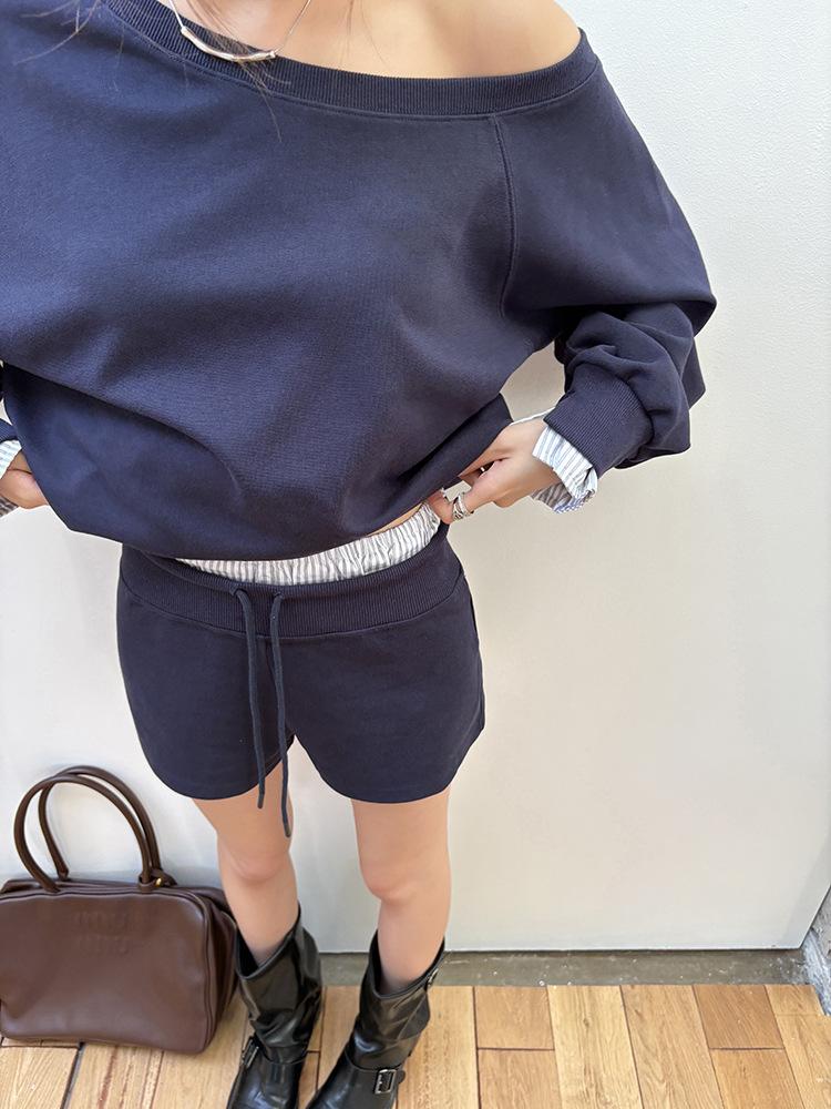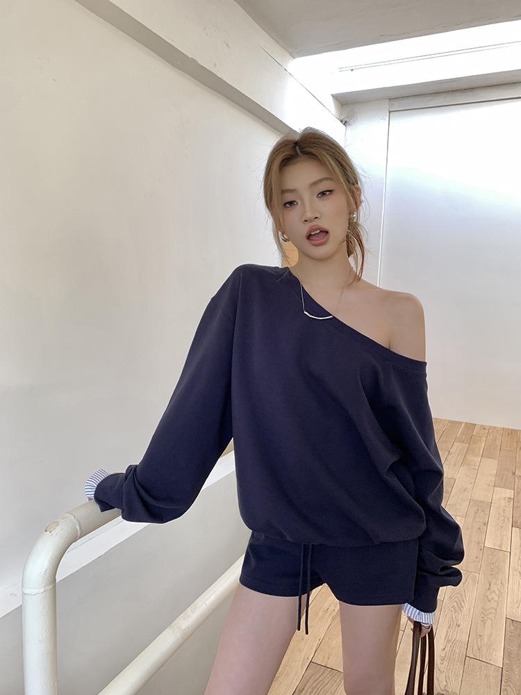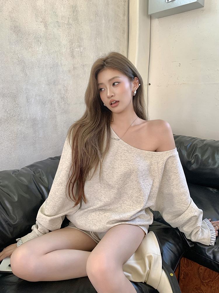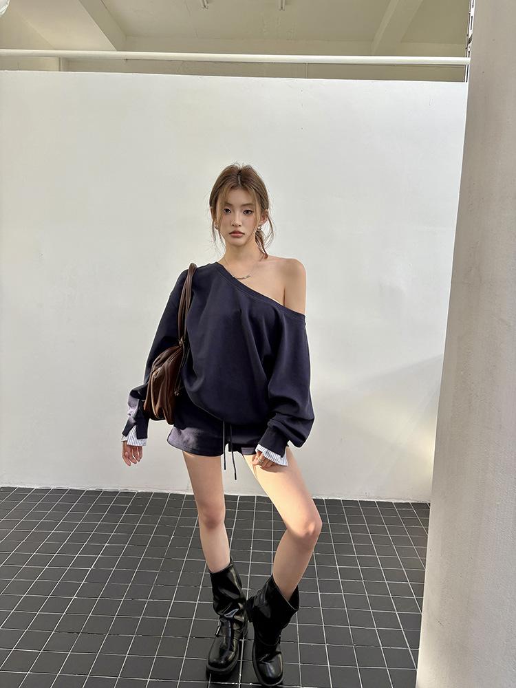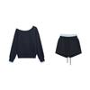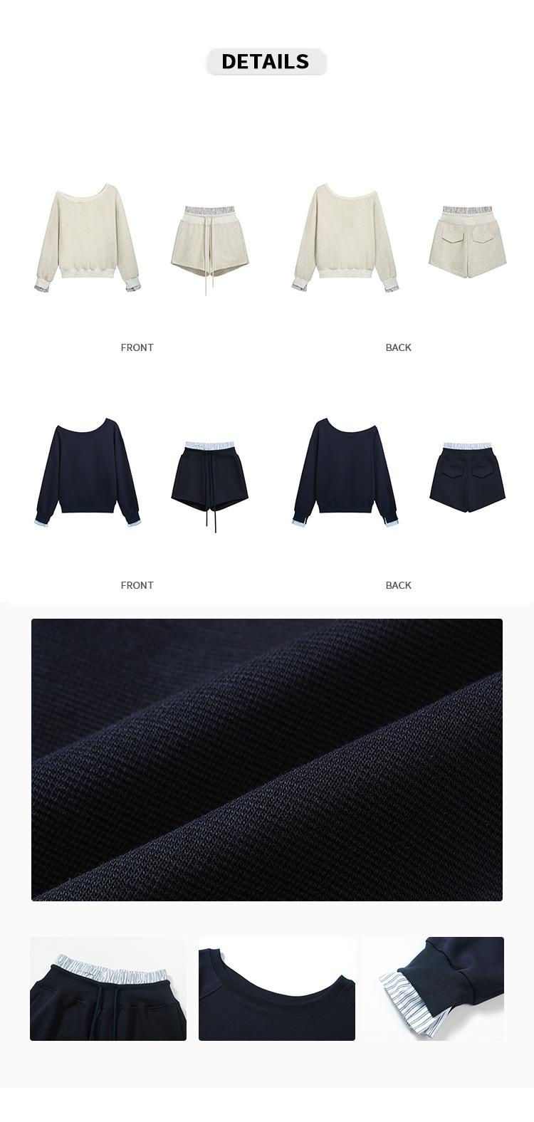 Foto Real Otoño/Invierno 2025 Nuevo Sudadera Top de Moda con Hombros Descubiertos para Chica Caliente Perezosa Conjunto de Dos Piezas de Shorts Color Block para Mujer
