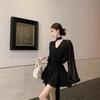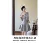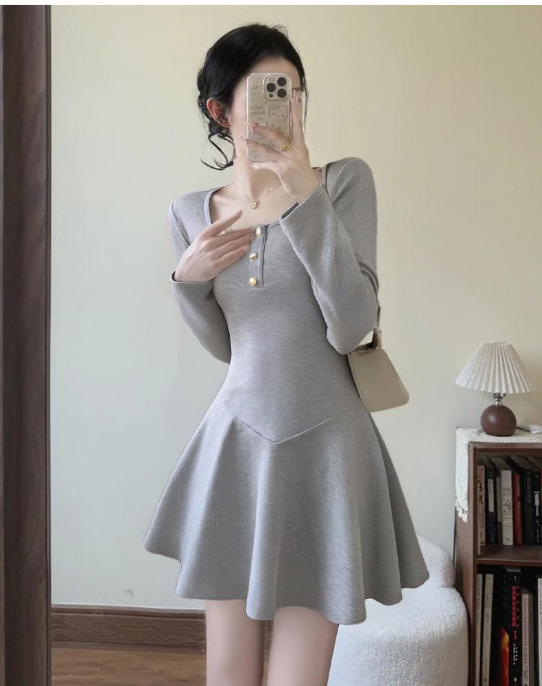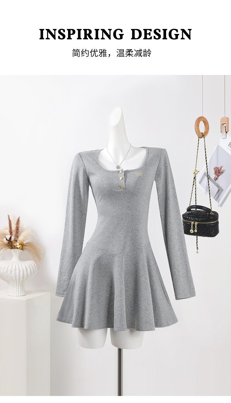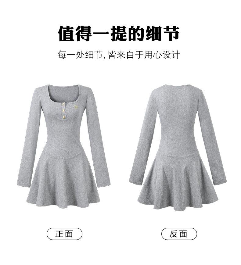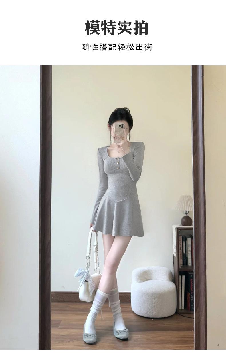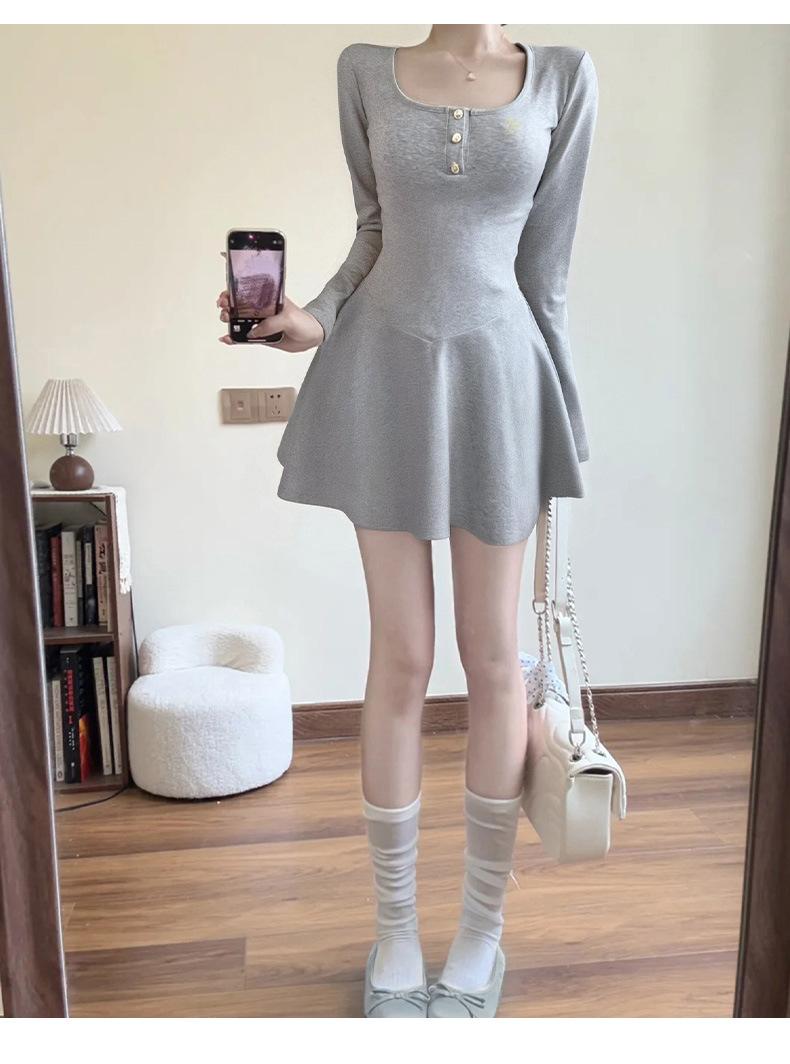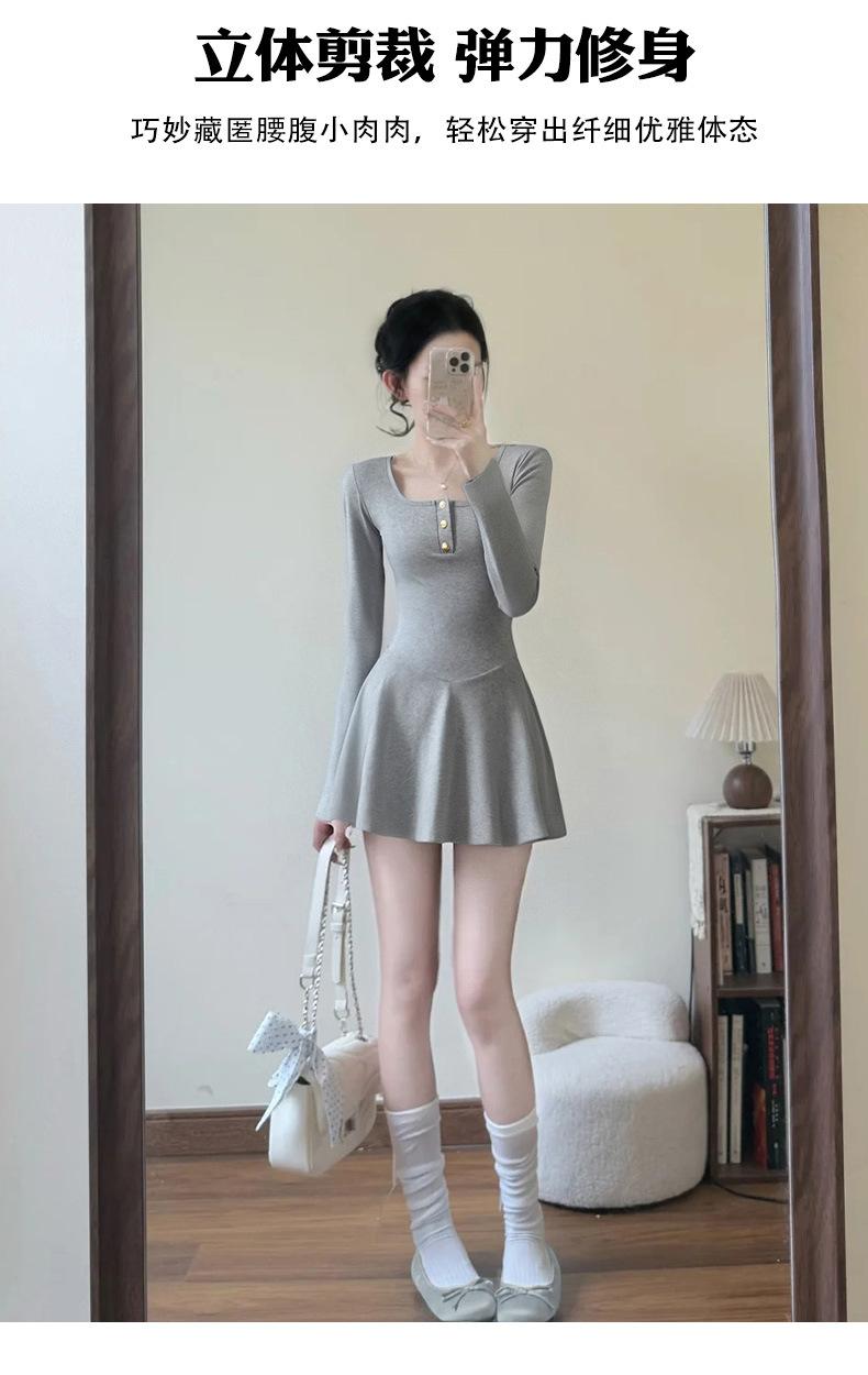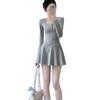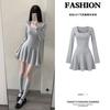 Vestido de Otoño Temprano de Cuello Cuadrado Gris de Manga Larga para Mujer 2025 Nuevo Estilo Vestido de Hombro Recto Falda Corta Línea A Adelgazante de Deseo Puro